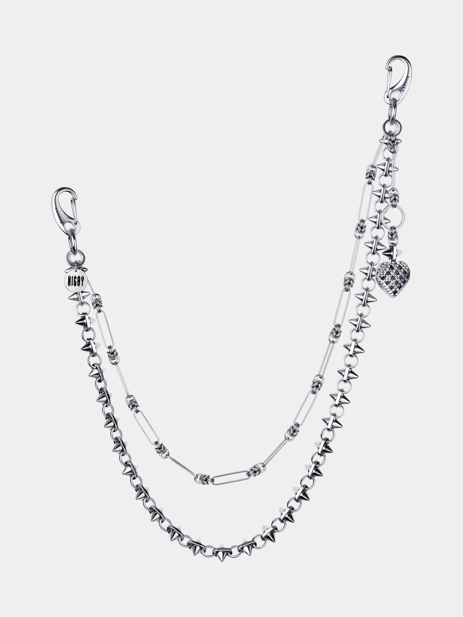 Двухъярусный подвес, выполненный из булавок с короткими шипами и сияющим сердцем.
