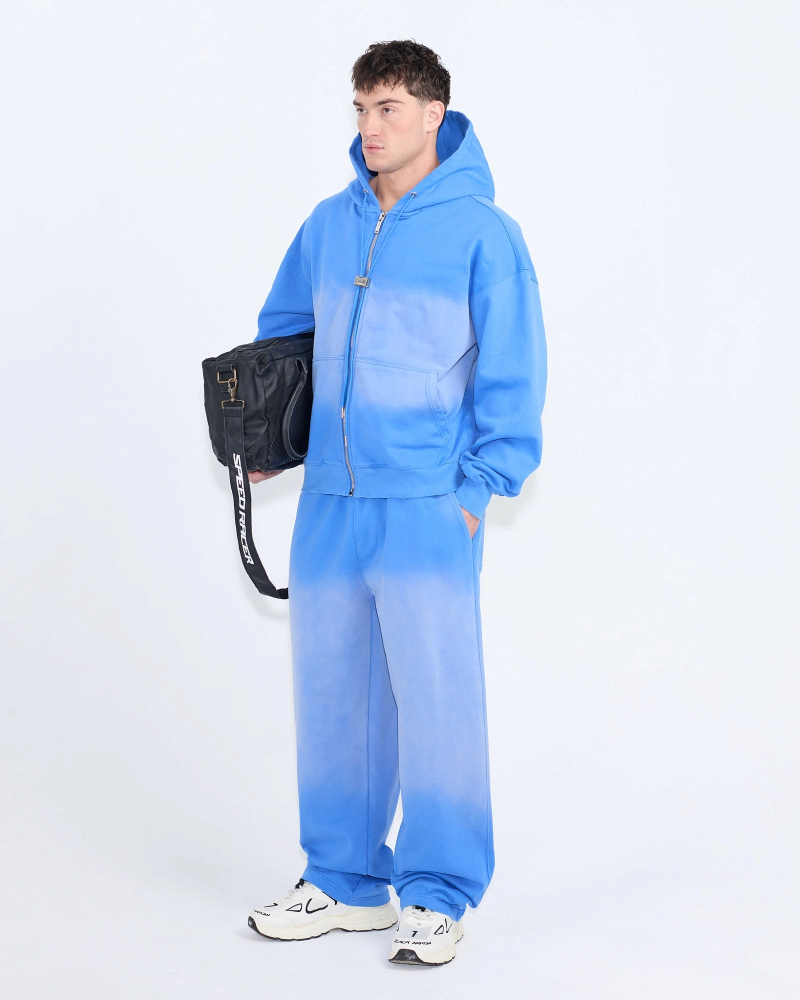 Джоггеры прямого кроя из плотного хлопка. Штанины без манжетов красиво удлиняют ноги и делают изделие комфортным на каждый день, а прорезные карманы и плотный пояс на талии добавляют функциональности. Вся поверхность изделия окрашена в технике tie-die, создавая красивый голубой градиент. Рекомендуем носить с худи от комплекта.