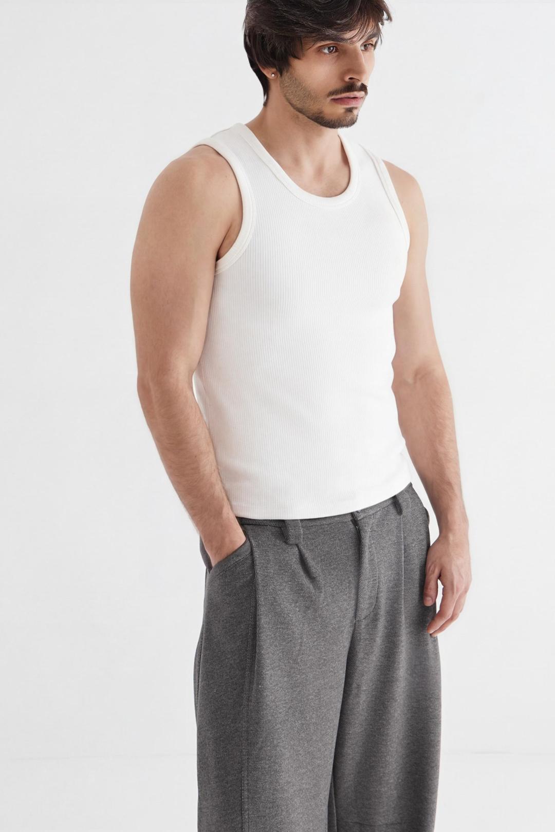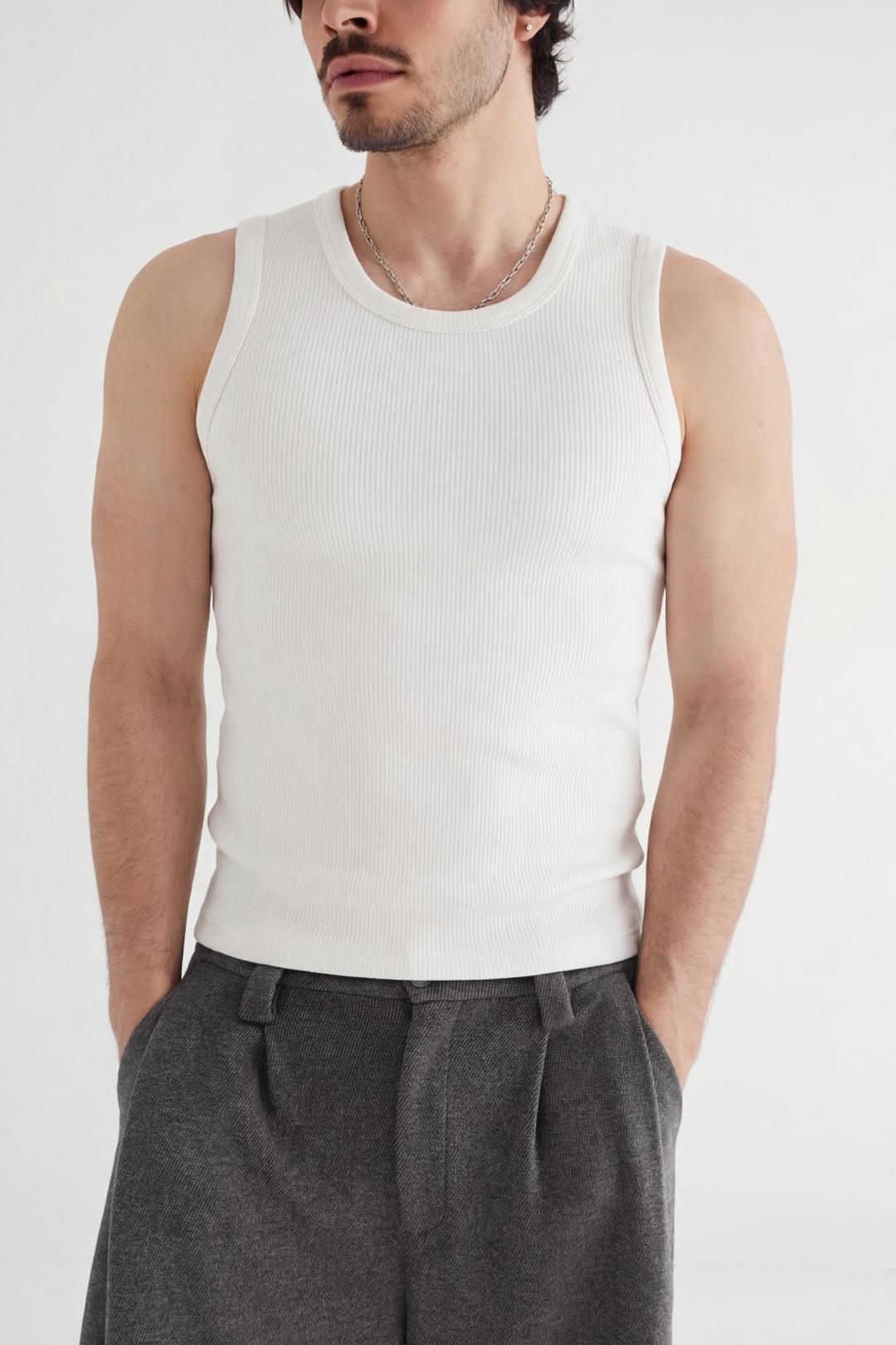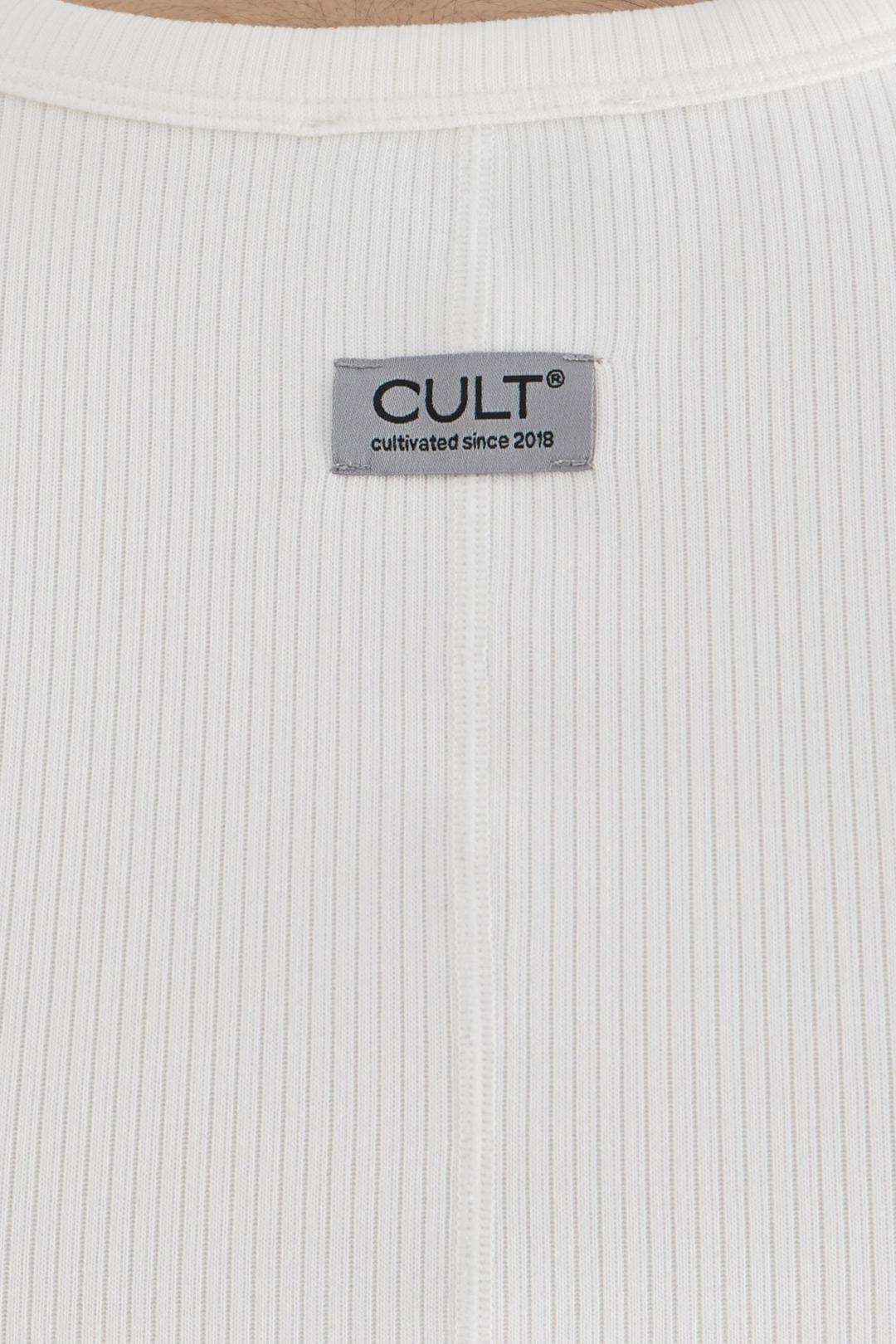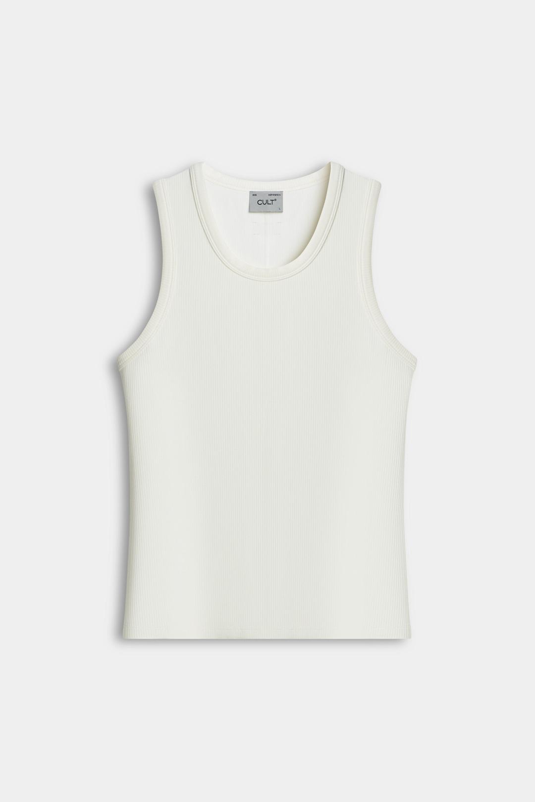 Майка облегающего силуэта из лапши. Сзади под воротником брендированная нашивка.