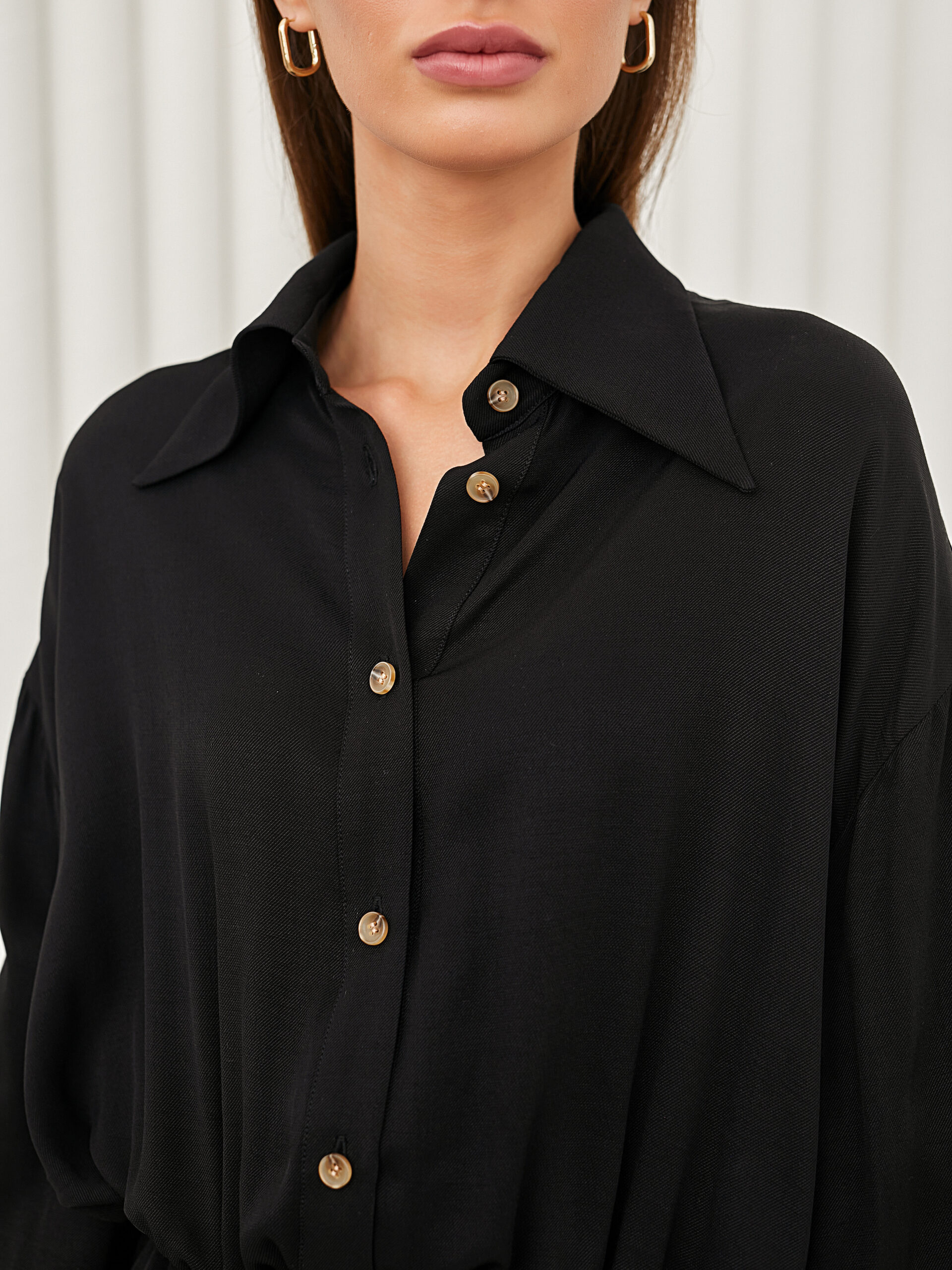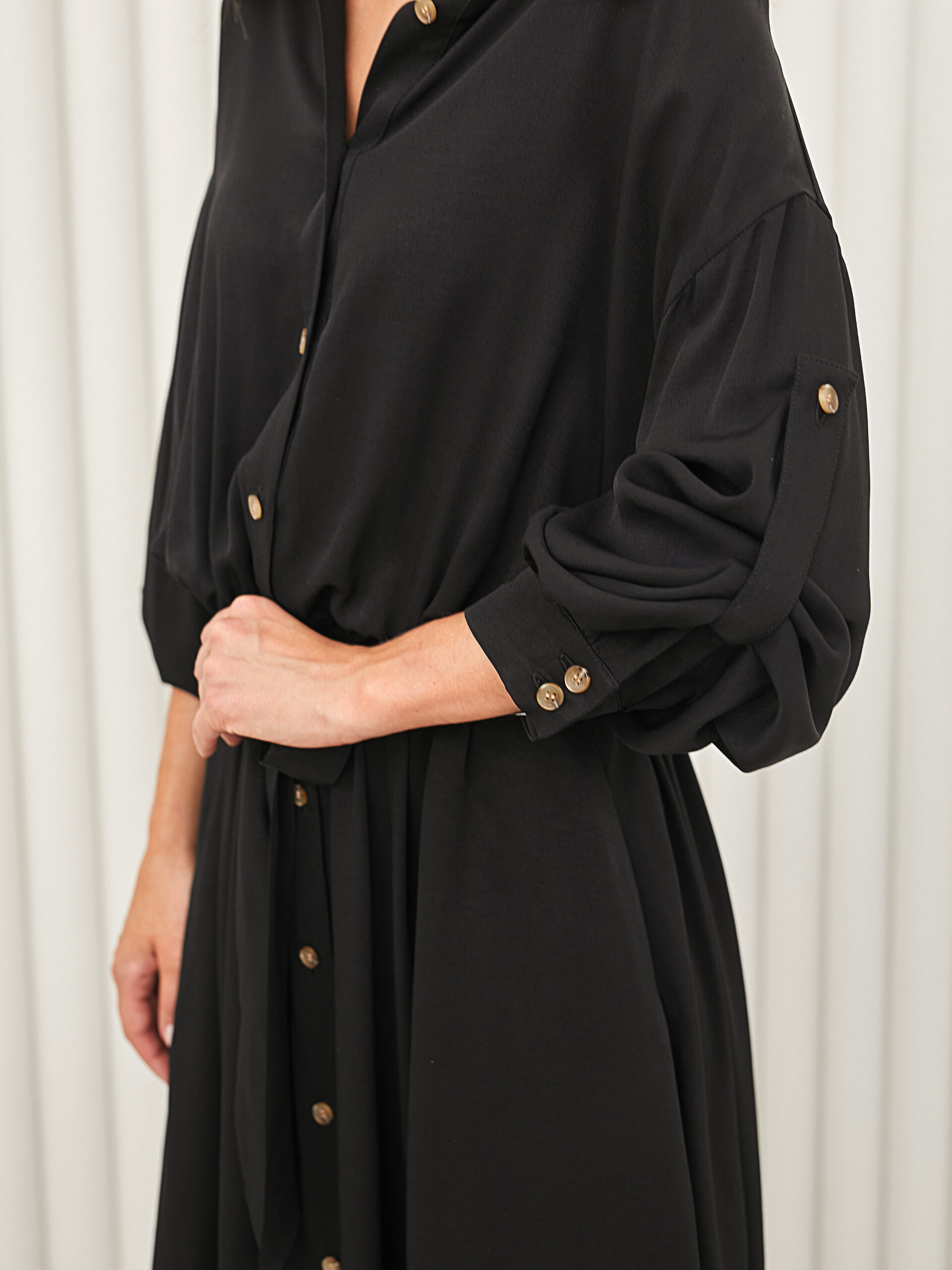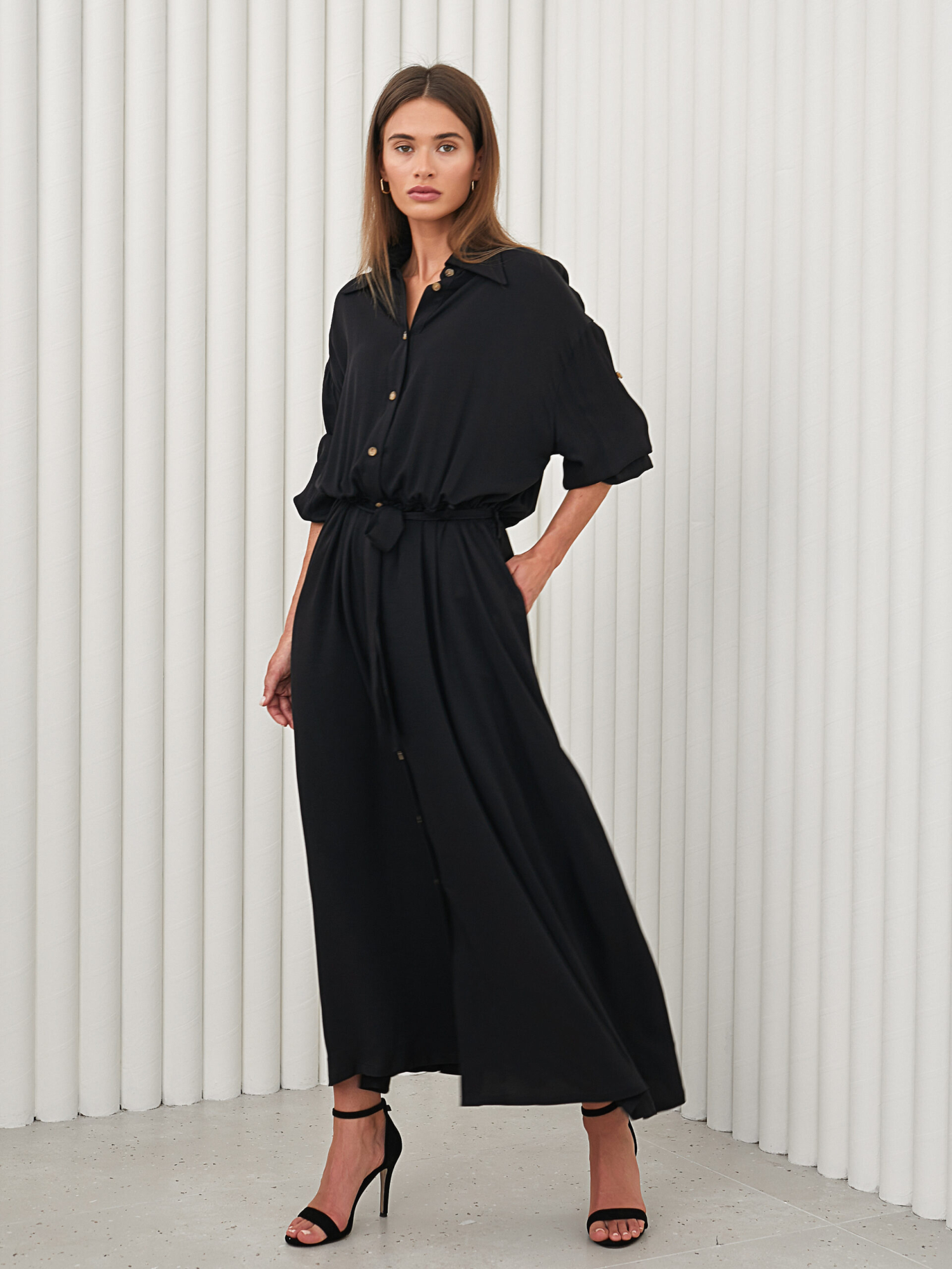 Платье прямого силуэта, небольшого объема, спущенная линия плеча, воротник-стойка, центральная застежка на 9 пуговиц, резинка на линии талии, съемный пояс из основной ткани, на спинке от линии кокетки сборка.