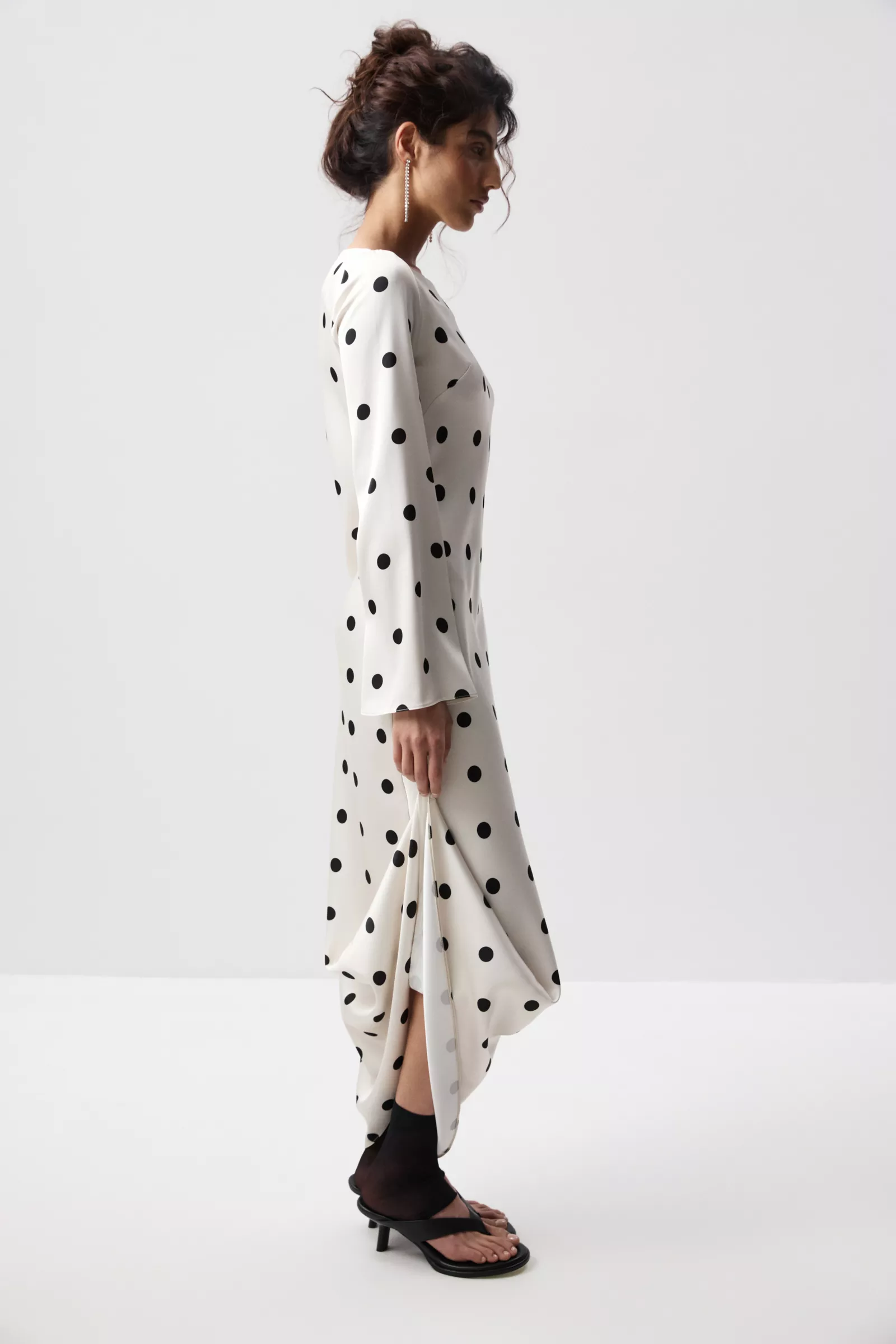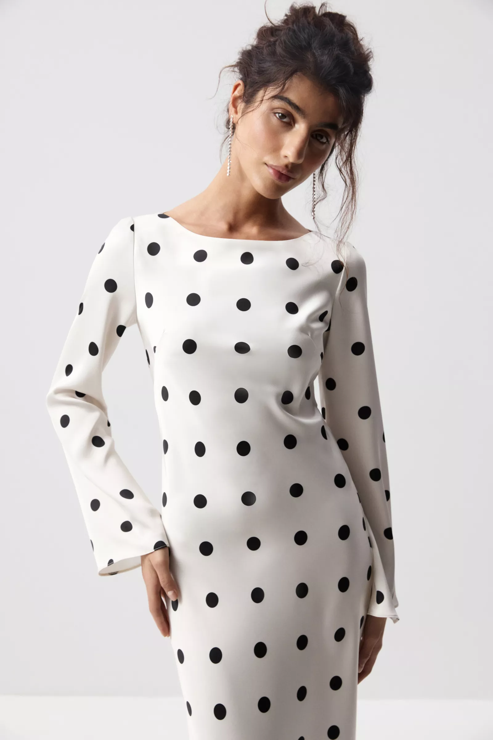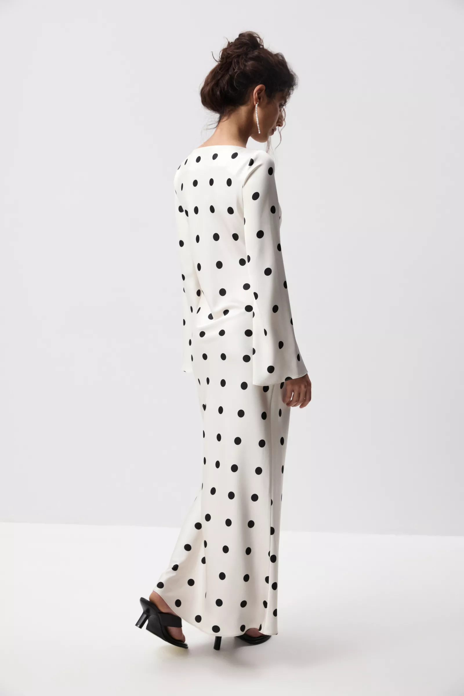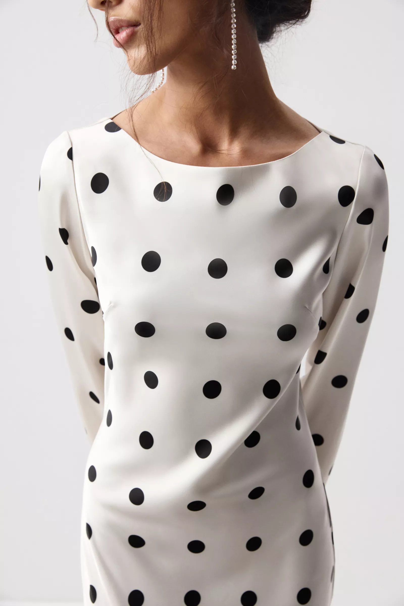 Сатиновое платье макси в крупный горох - эффектная модель с ноткой ретро и современной элегантностью. Легкий сатин с деликатным блеском красиво струится в движении, а выразительный принт добавляет образу характер. Горловина лодка изящно открывает линию плеч и подчеркивает шею, создавая утонченный силуэт.