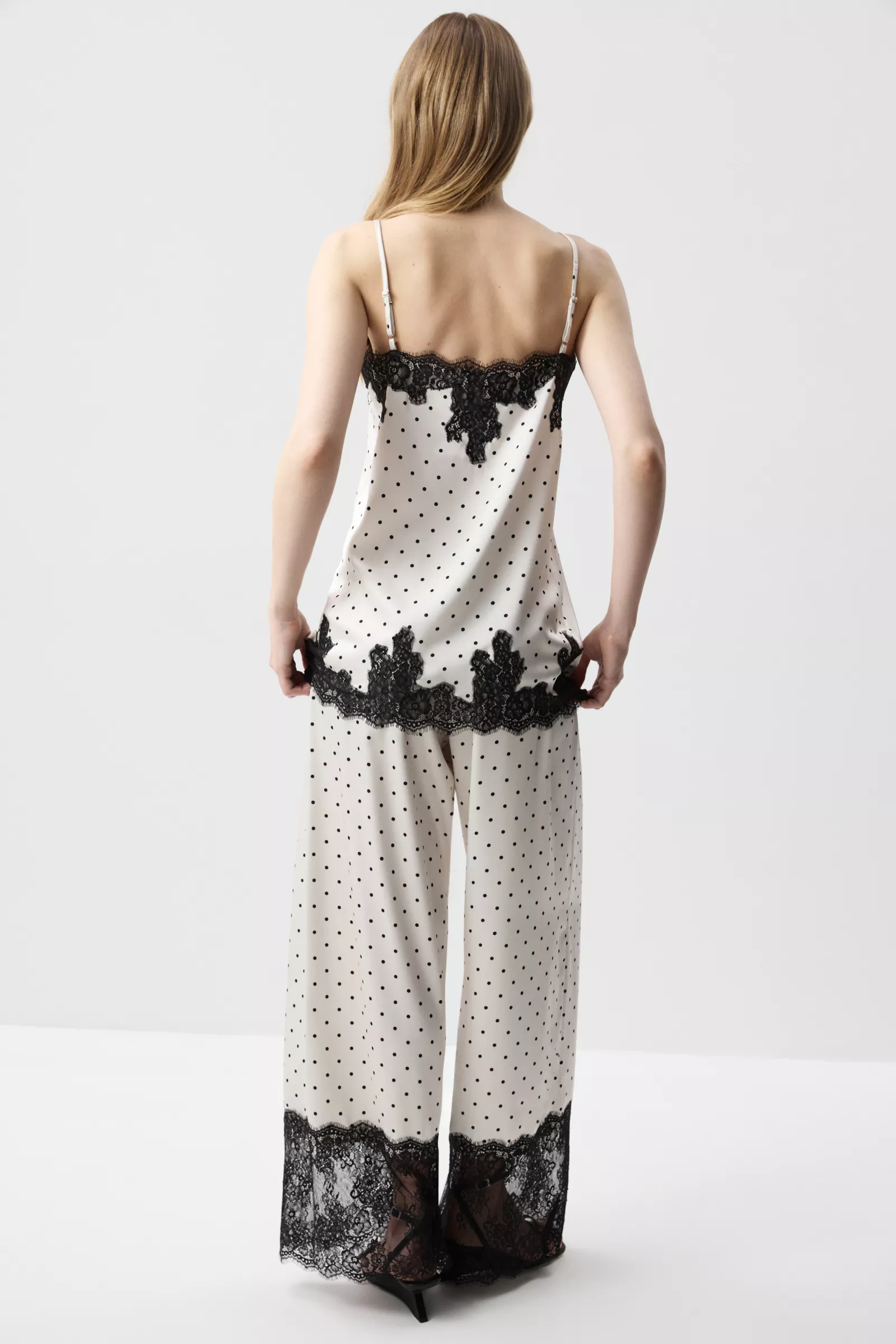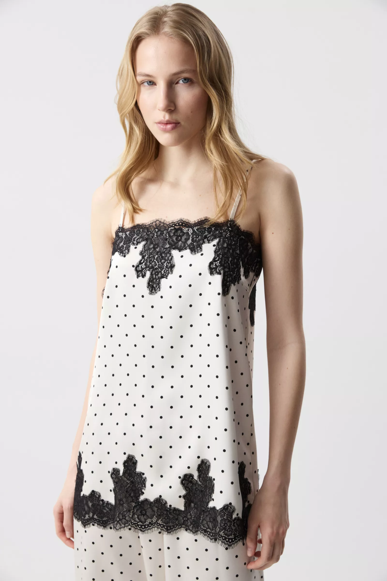 Благодаря прямому крою, длине и регуляторам на бретелях, топ можно носить не только как топ, но и как мини-платье — как самостоятельный элемент или в комплекте с брюками с кружевом из идентичной ткани. Идеальный вариант для перехода от расслабленного дня к вечернему выходу.