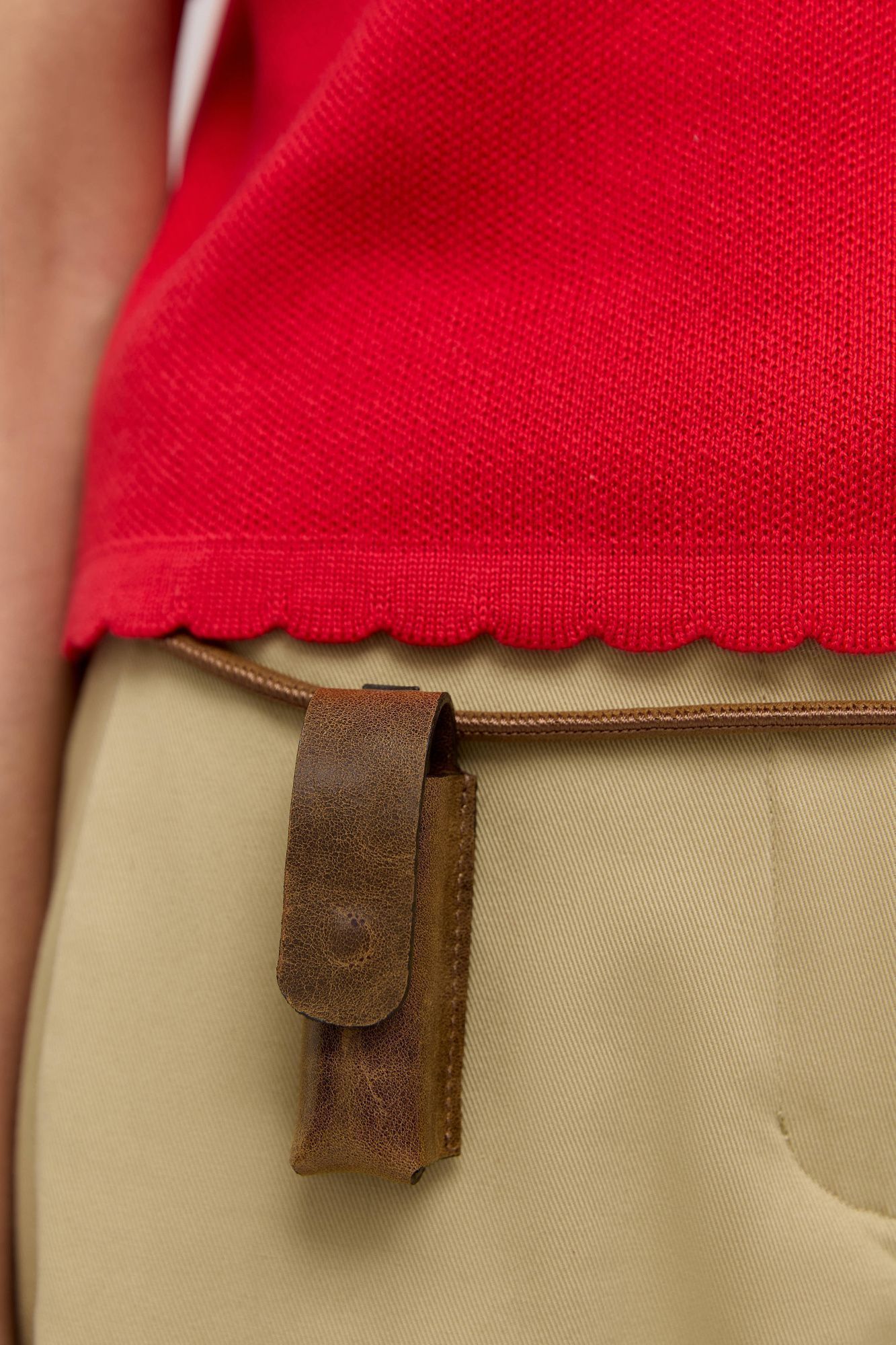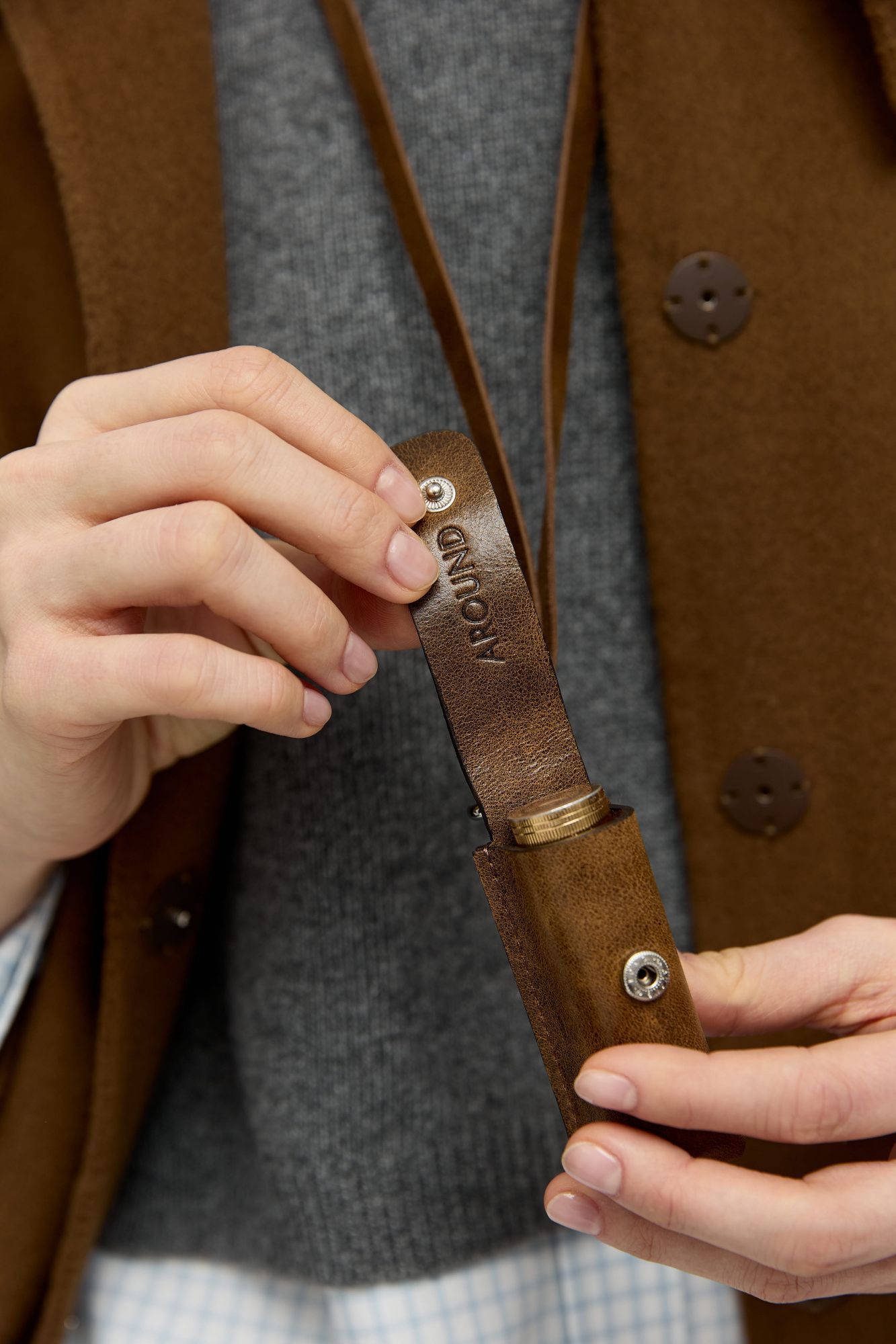 У кожи слегка винтажный эффект и неравномерная окраска. Крышка застегивается на скрытую металлическую кнопку. Сзади есть шлевка, к которой пристегивается длинный кожаный ремешок на металлическом карабине.