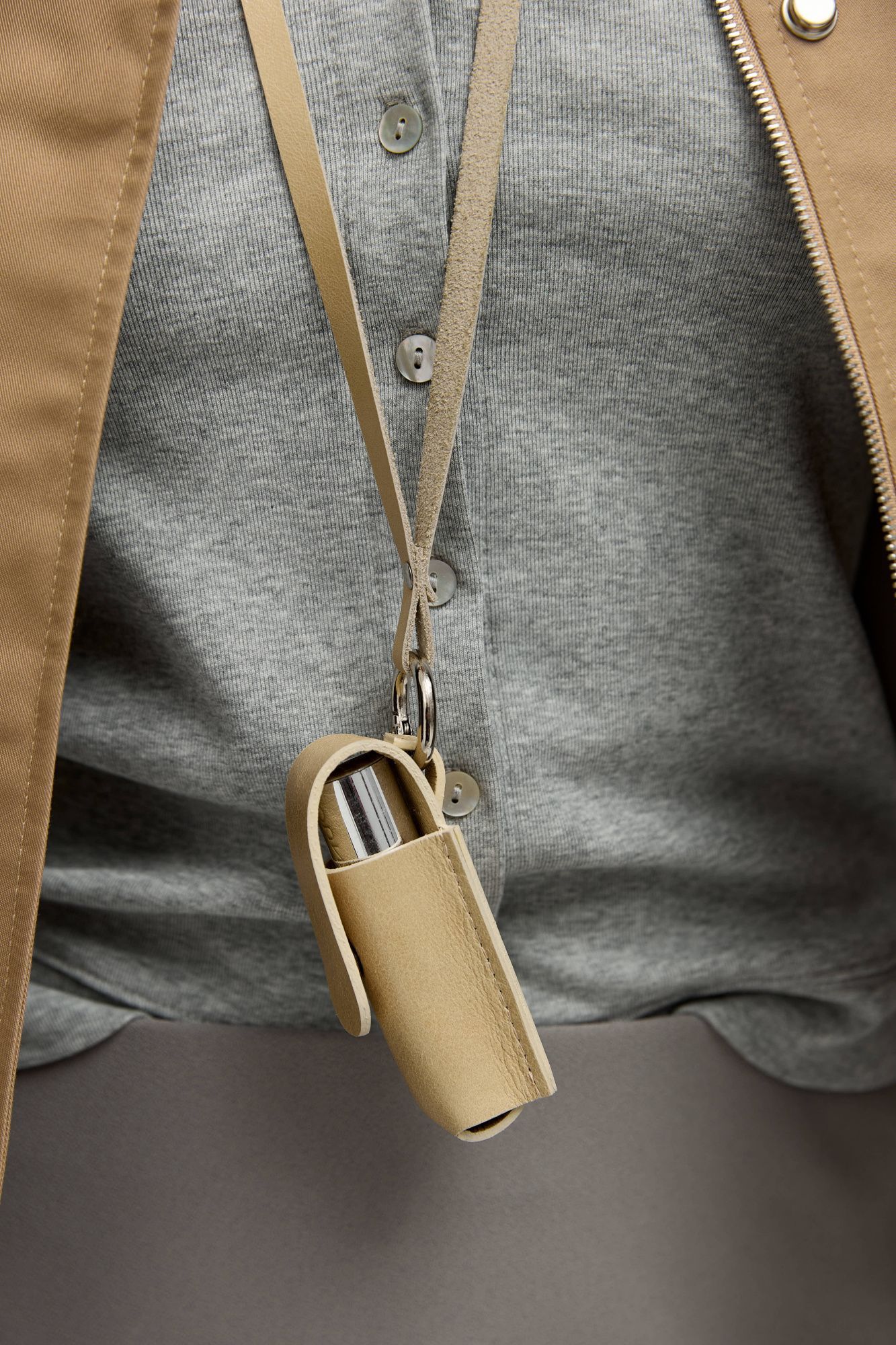 В футляр помещается классическая помада средней величины. Аксессуар можно повесить на шею, пристегнуть к поясу или носить на сумке.