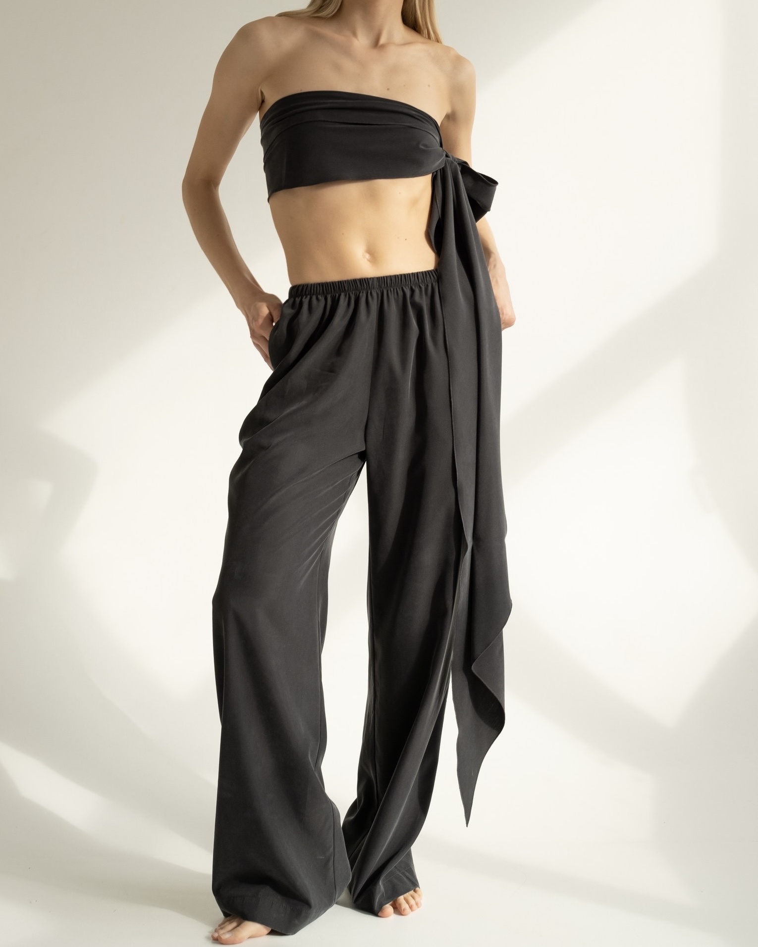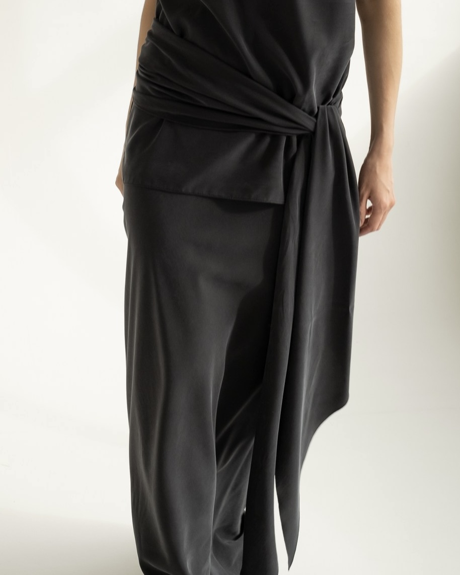 Узкий шарфик в графитовом цвете — стильный и универсальный аксессуар, который можно носить разными способами. Завяжите его просто на шею для повседневного образа или попробуйте надеть как топ под пиджак или куртку для создания интересного многослойного эффекта. Шарфик станет отличным дополнением к вашему гардеробу и поможет выразить индивидуальность.