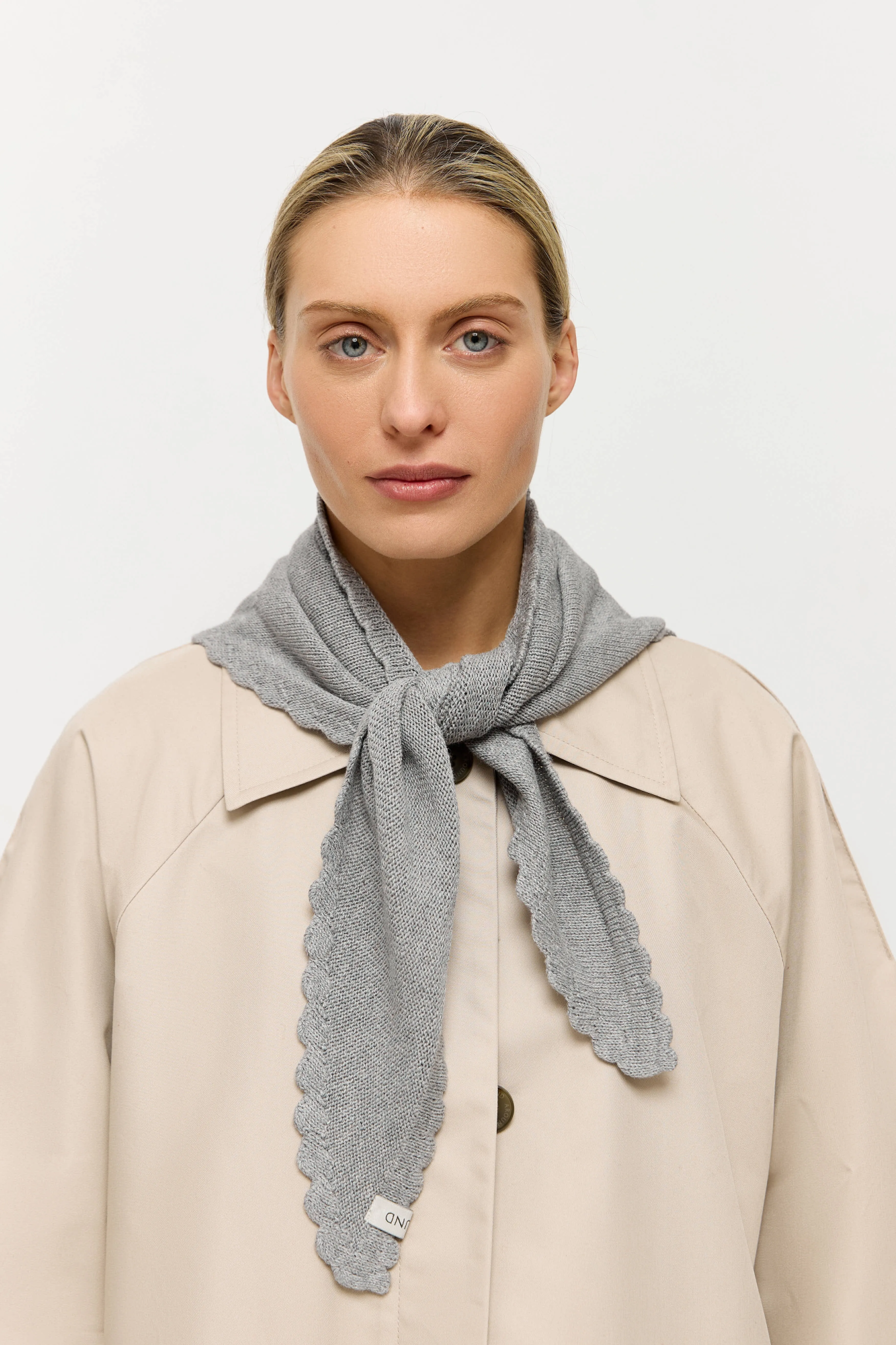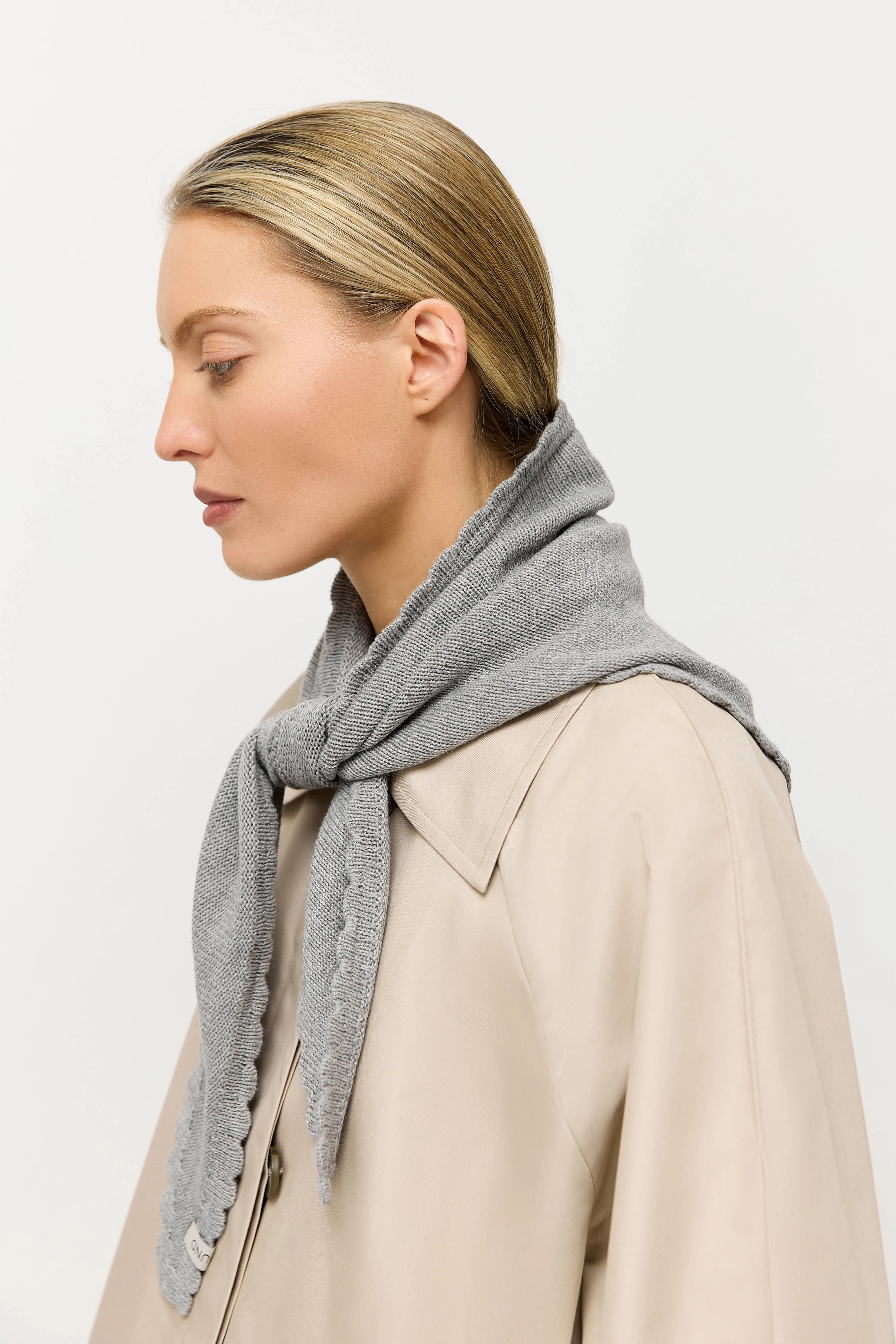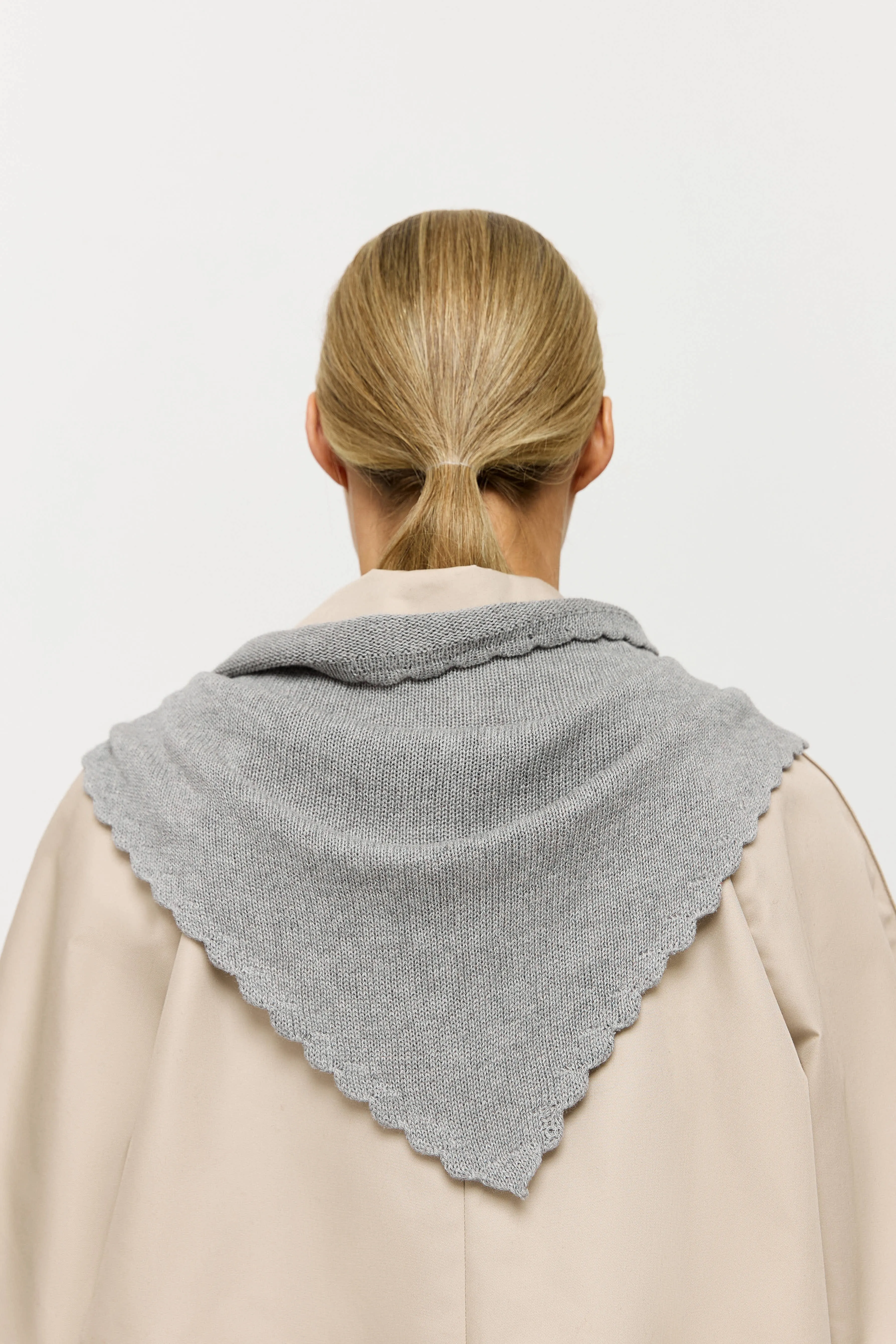 Косынка связана из хлопка с добавлением кашемира. По двум сторонам в качестве акцента вывязаны фестоны.