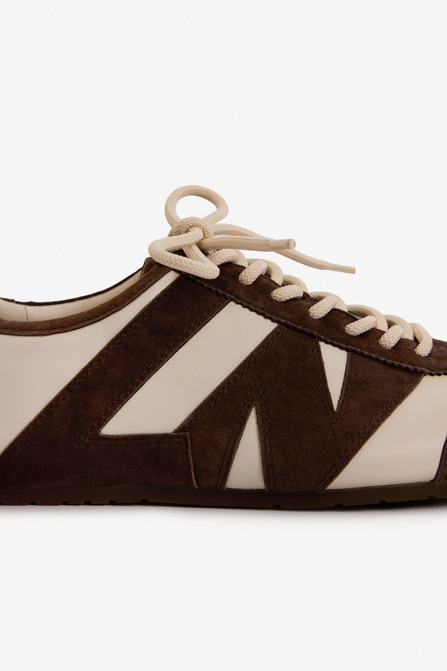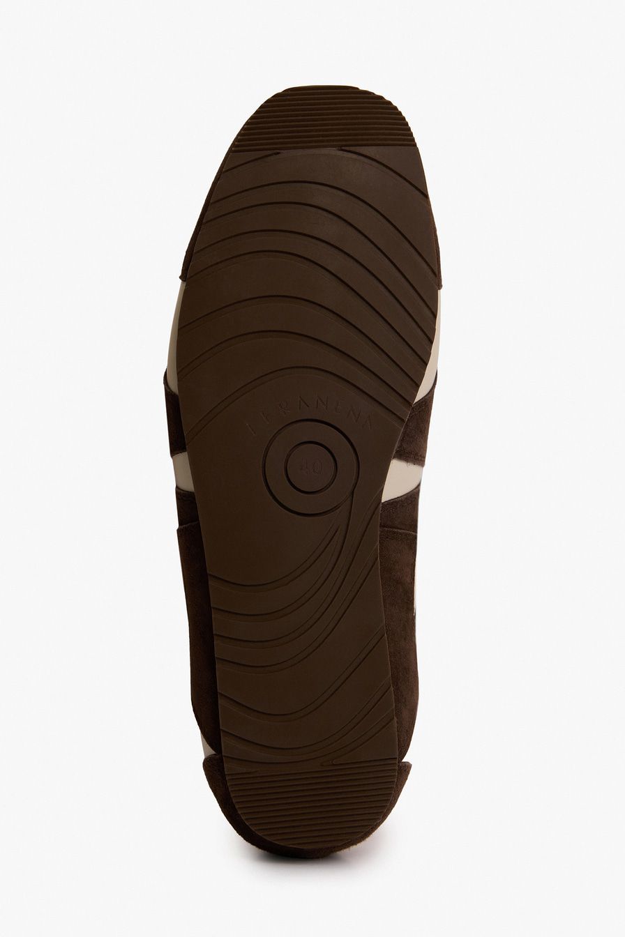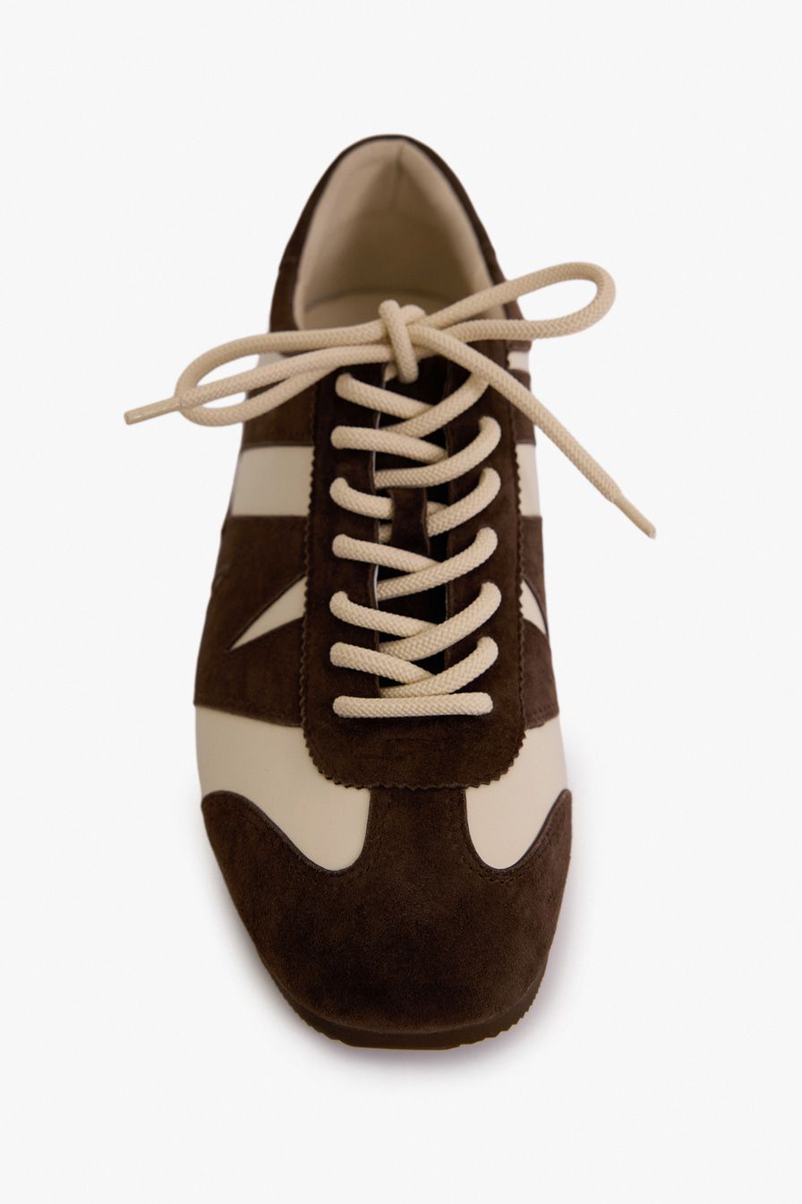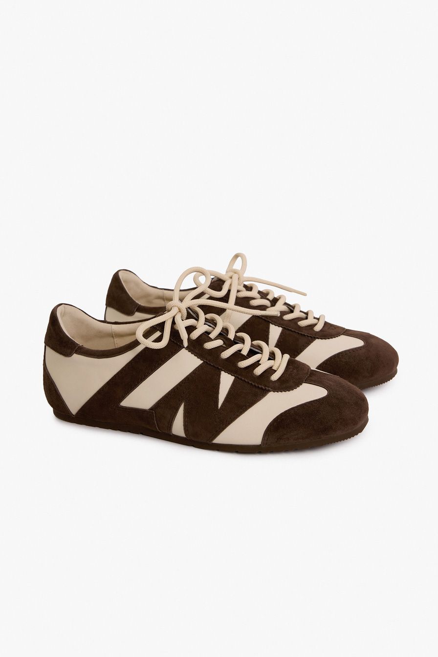 Коричневые кроссовки в стиле «колорблок» выполнены из натуральной кожи и замши.