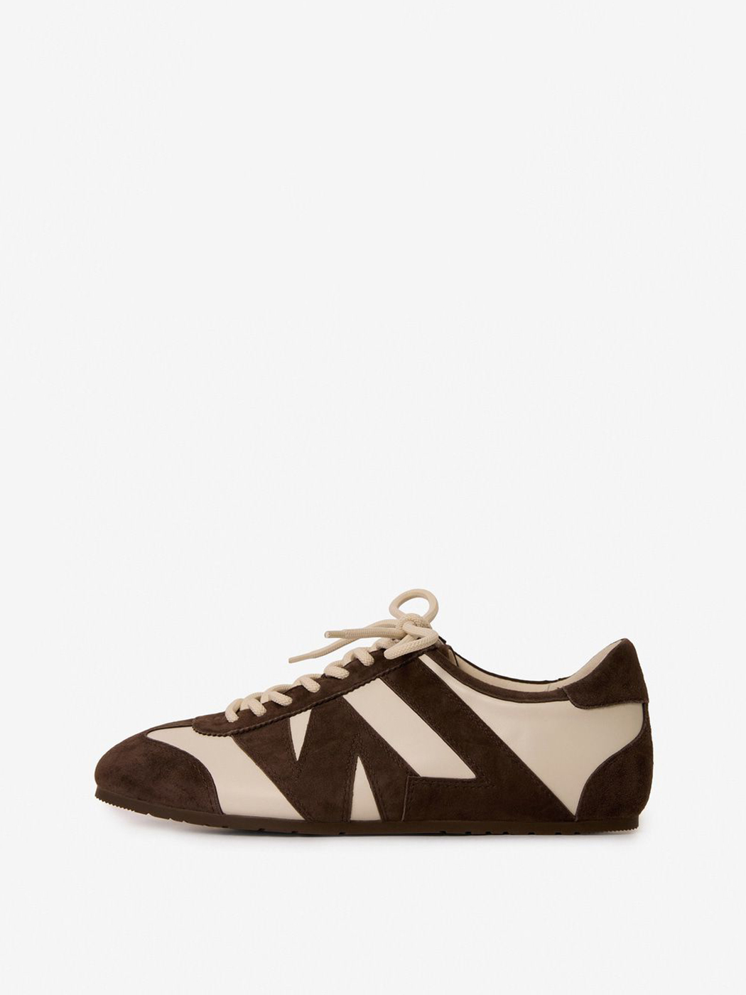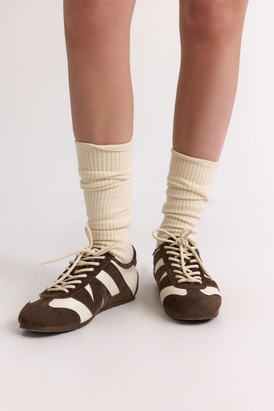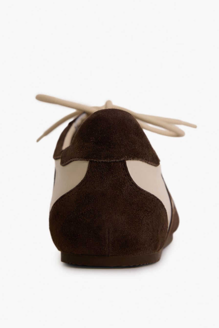 Коричневые кроссовки в стиле «колорблок» выполнены из натуральной кожи и замши.