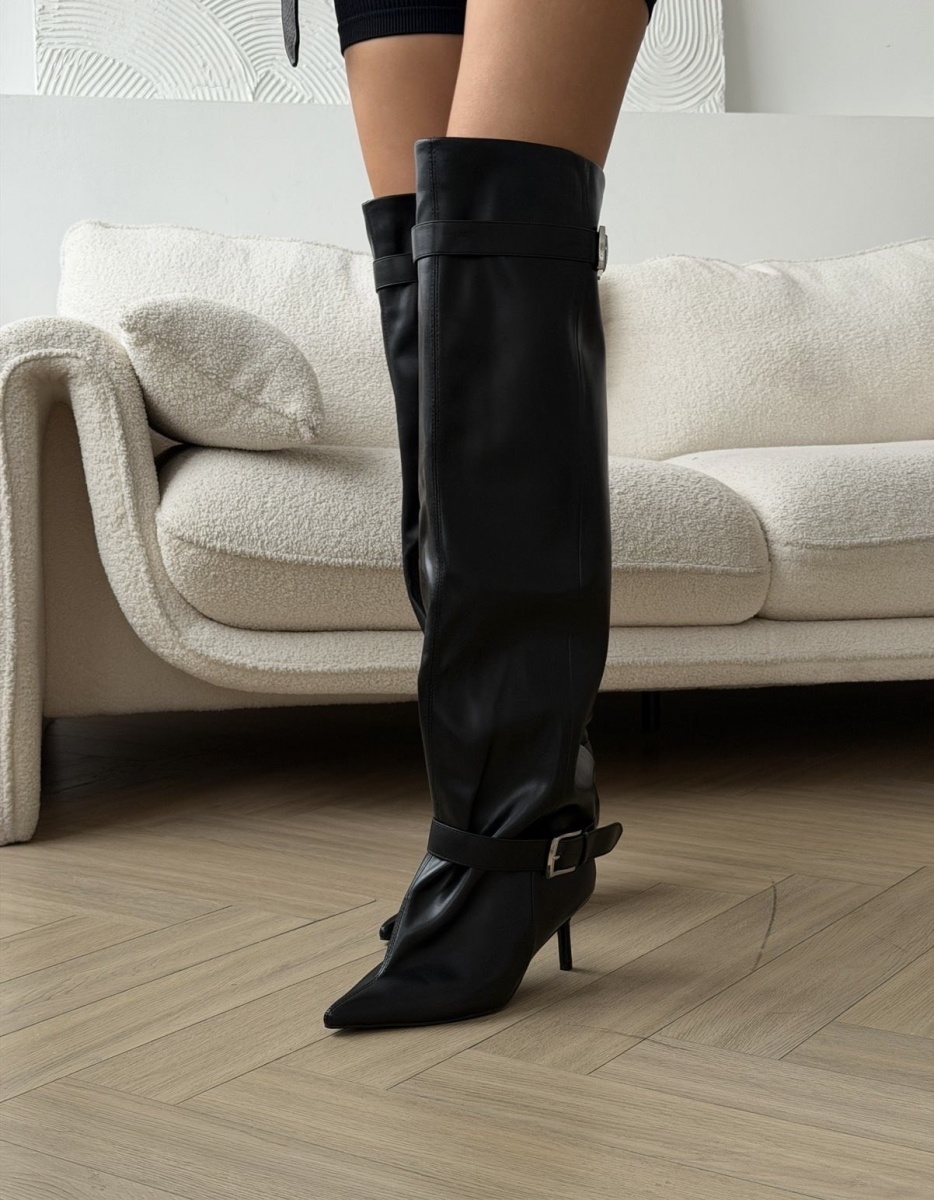 Высокие чёрные сапоги на каблуке с ремешками — идеальный выбор для создания стильного и элегантного образа. Комфортная обувь с изящным дизайном подчеркнёт ваш вкус и станет незаменимой деталью гардероба.