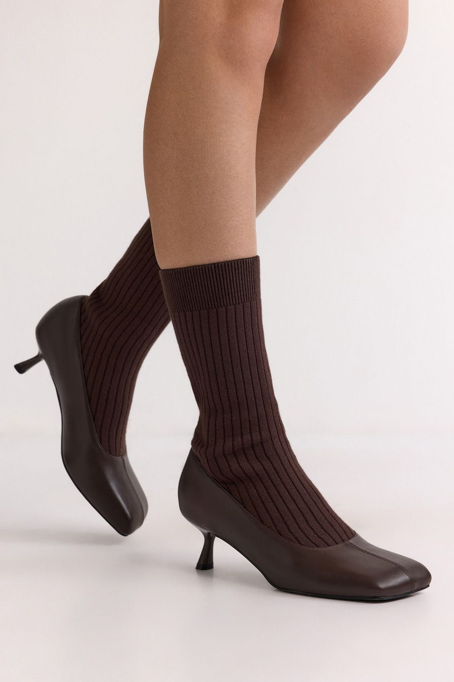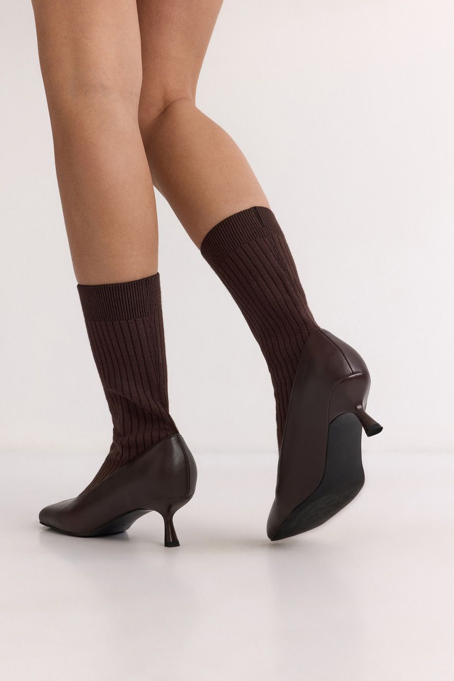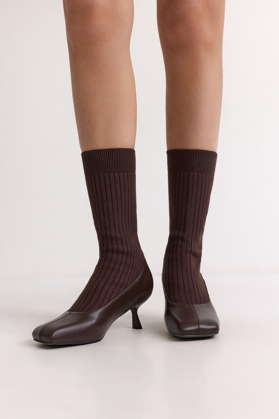 Полусапоги из экокожи и текстиля имитируют туфли в комплекте с носками в крупный рубчик. Модель коричневого цвета дополнена квадратным мысом и высоким каблуком.