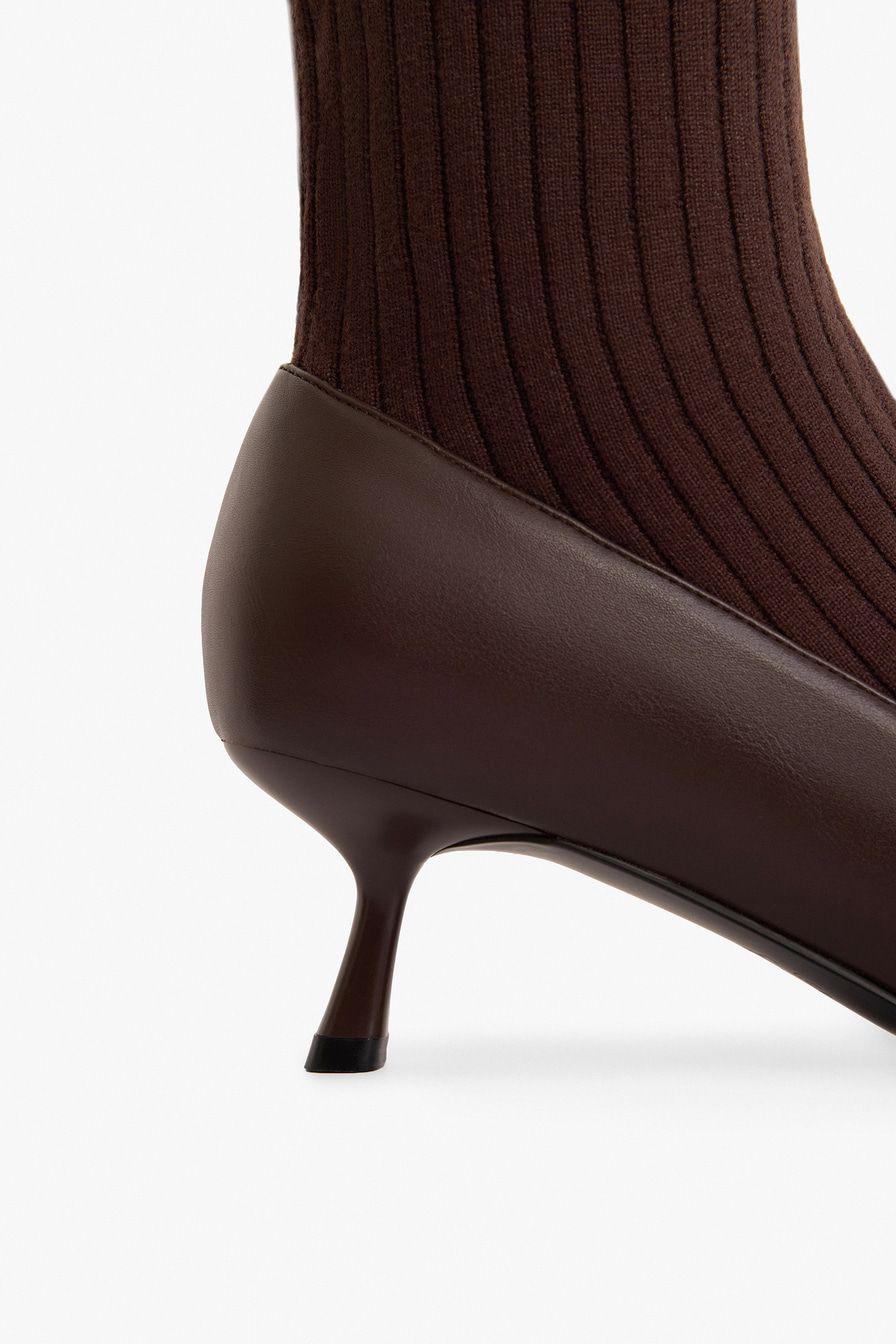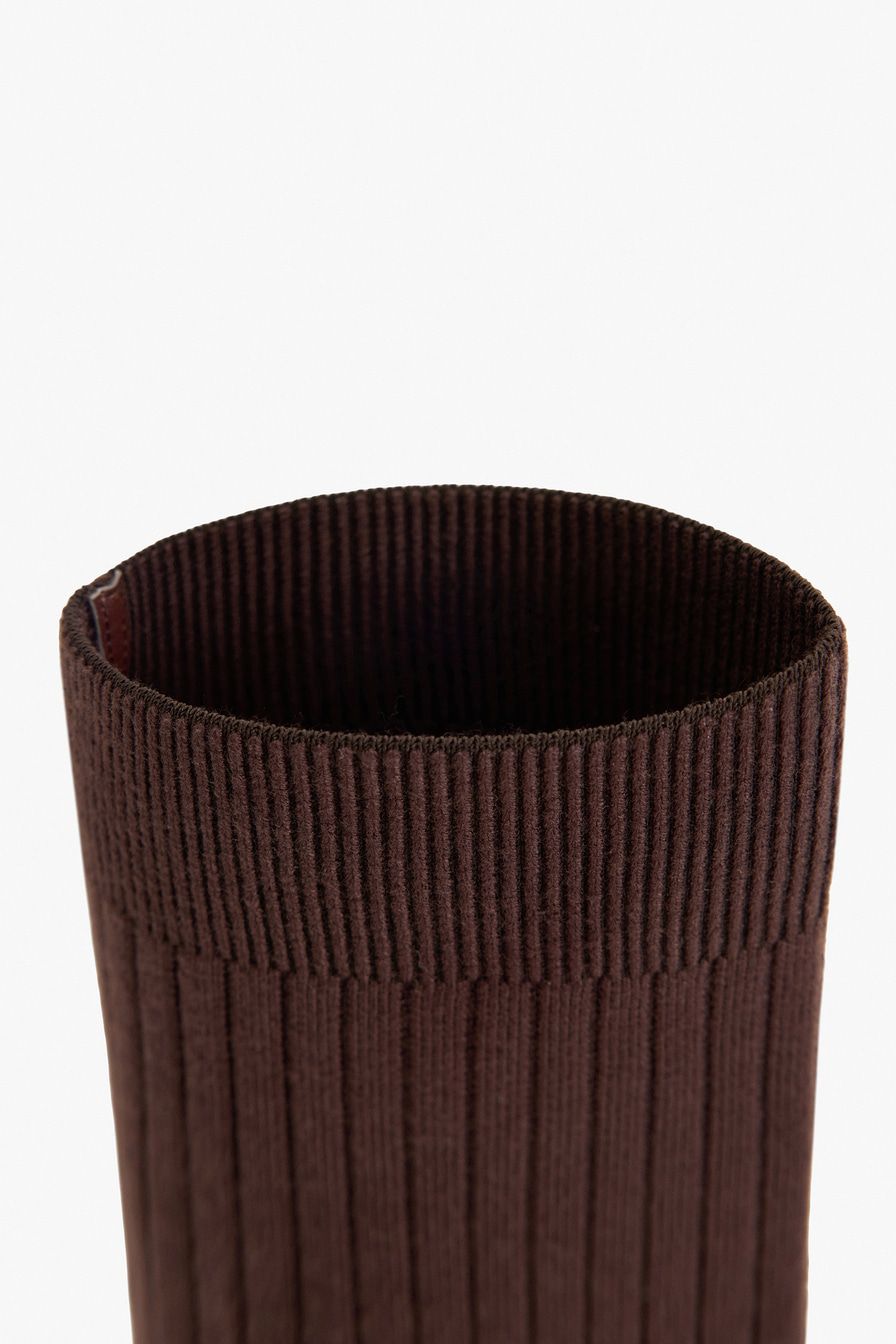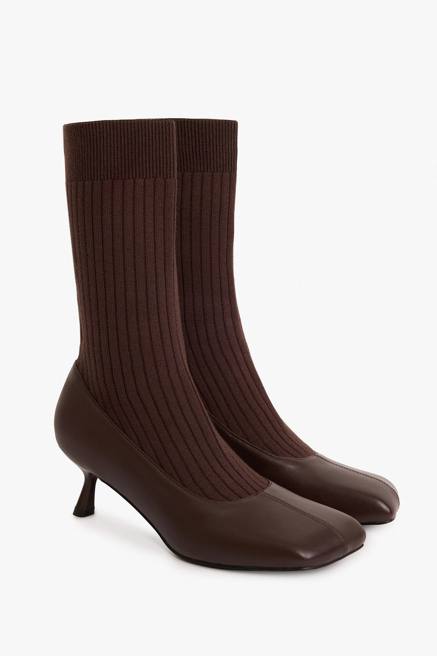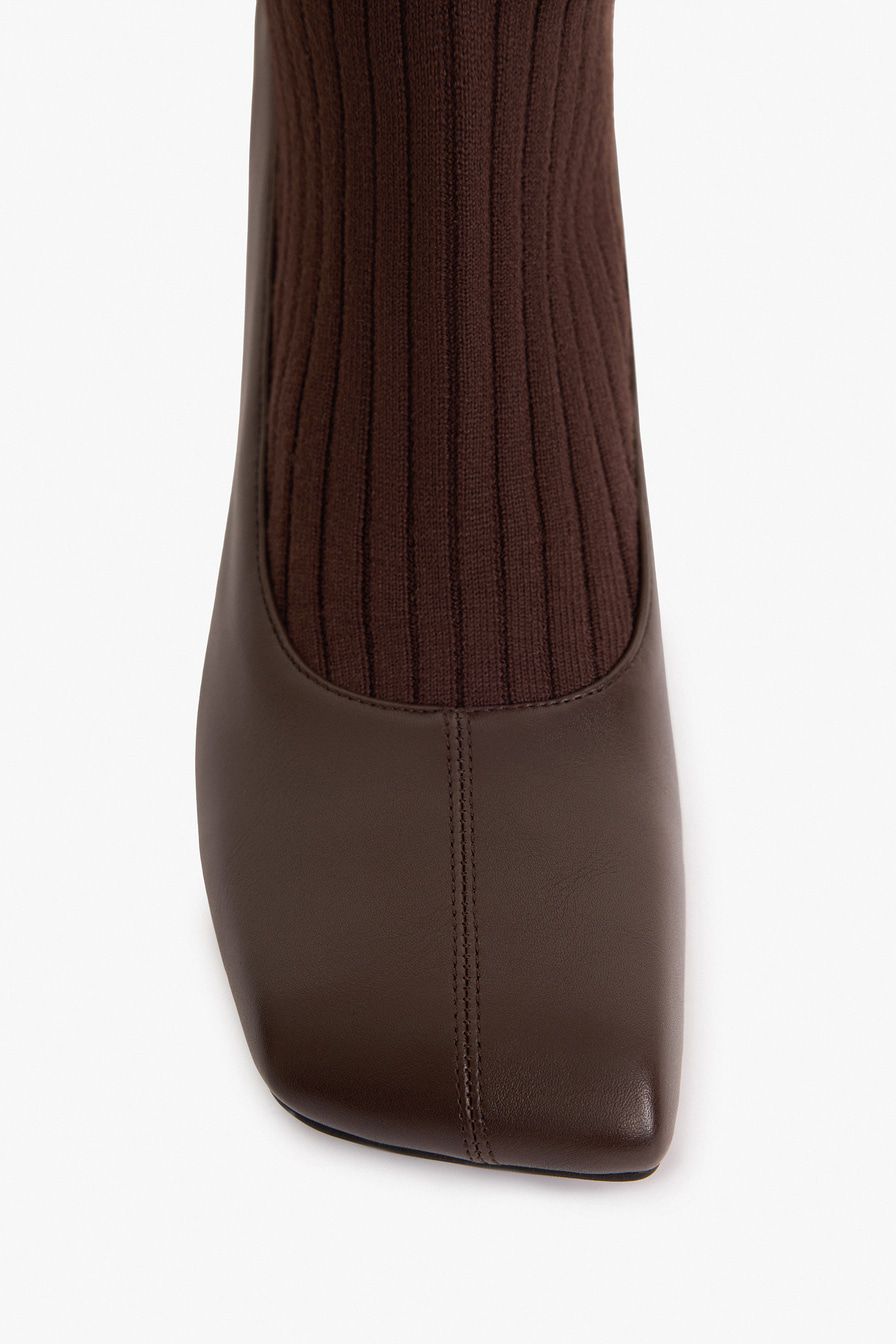 Полусапоги из экокожи и текстиля имитируют туфли в комплекте с носками в крупный рубчик. Модель коричневого цвета дополнена квадратным мысом и высоким каблуком.