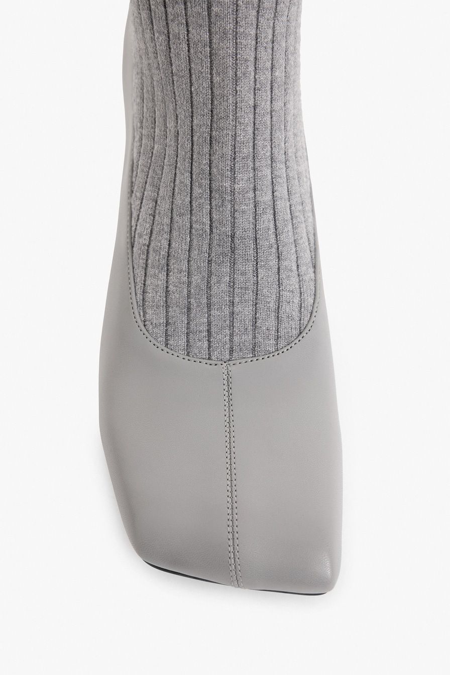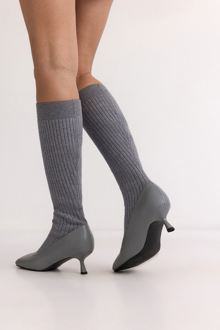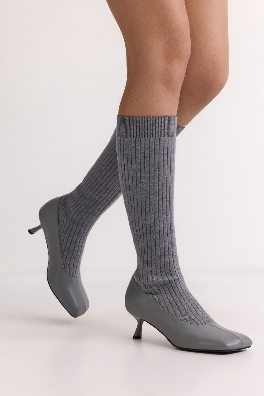 Сапоги из экокожи и текстиля имитируют туфли в комплекте с высокими носками в крупный рубчик. Модель серого цвета дополнена квадратным мысом и высоким каблуком.
