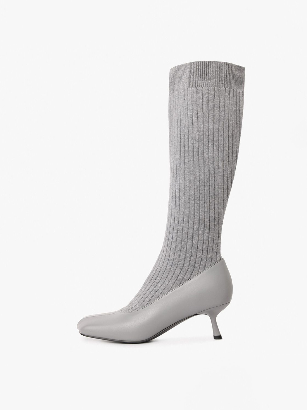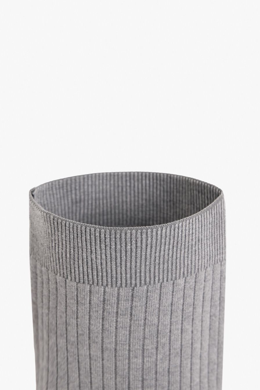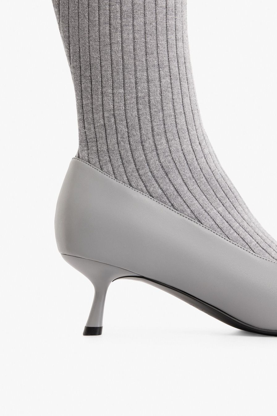 Сапоги из экокожи и текстиля имитируют туфли в комплекте с высокими носками в крупный рубчик. Модель серого цвета дополнена квадратным мысом и высоким каблуком.