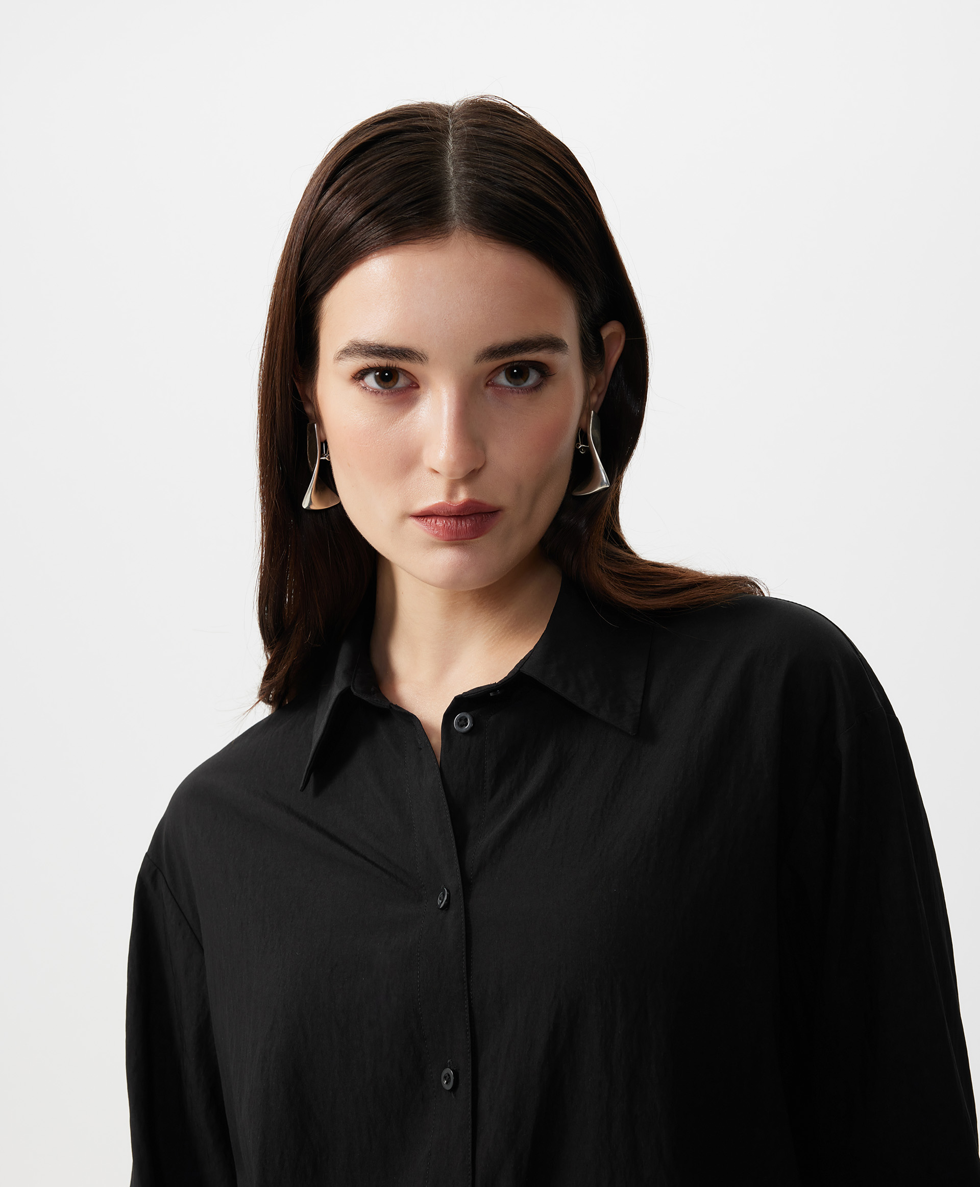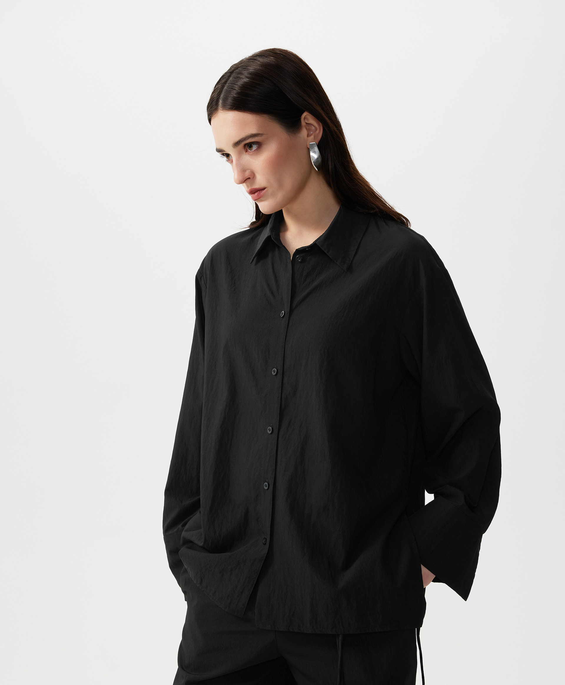 Черная блузка прямой свободной формы - прекрасный вариант для любителей элегантного минимализма. Дизайн модели создан с акцентом на рукава. Широкие по всей длине рукава, завершающиеся широкими манжетами, подчеркивают связь классической блузки и кимоно - визитной карточки японской культуры, вдохновившем многих дизайнеров на модные эксперименты. Блузка выполнена из тонкой шелковистой вискозной ткани с легким мятым эффектом. Удлиненная линия спинки и высокие разрезы в боковых швах придают любым образам с ней свободу и непринужденность городского стиля. Блузка застегивается на пуговицы.