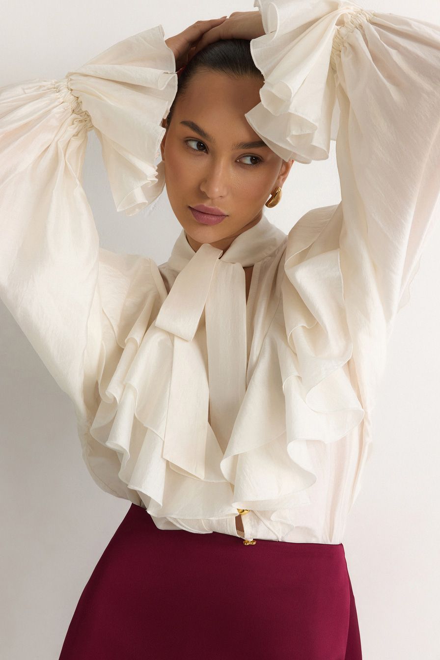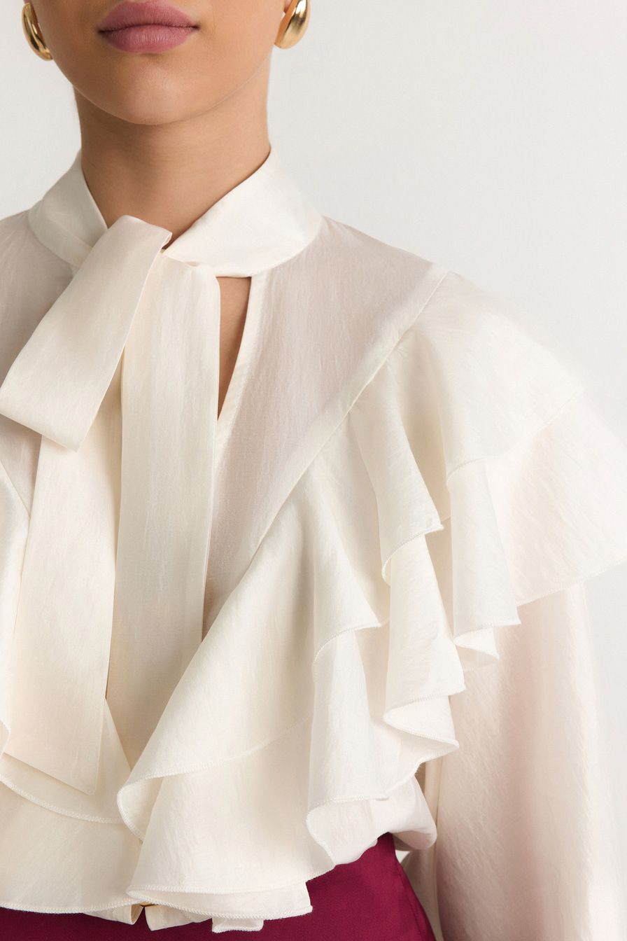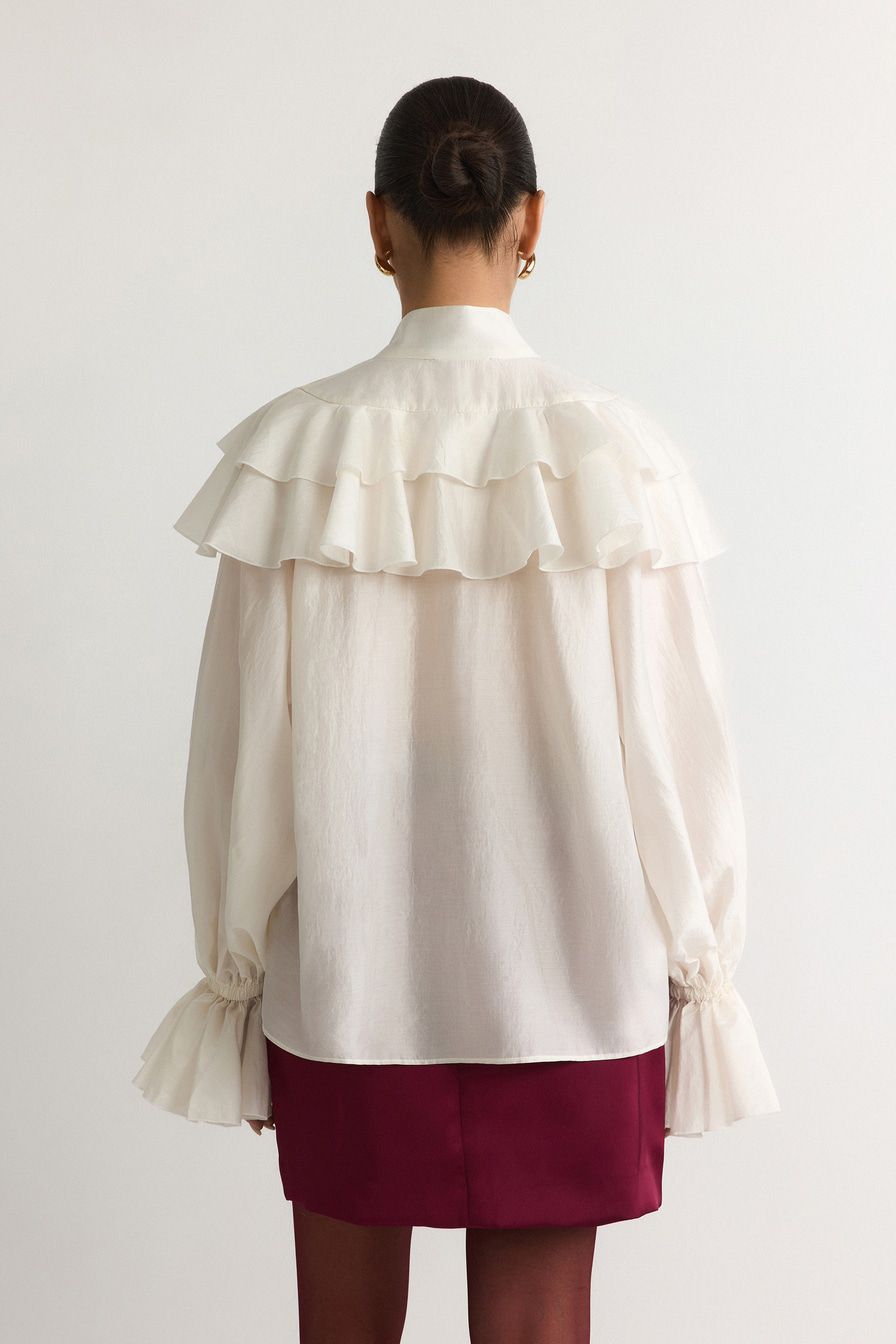 Белая блуза свободного кроя выполнена из тонкого, полупрозрачного смесового тенселя. Тенсель – материал натурального происхождения из древесины эвкалипта. Блуза дополнена воланами и воротником с лентами, которые завязываются бантом.