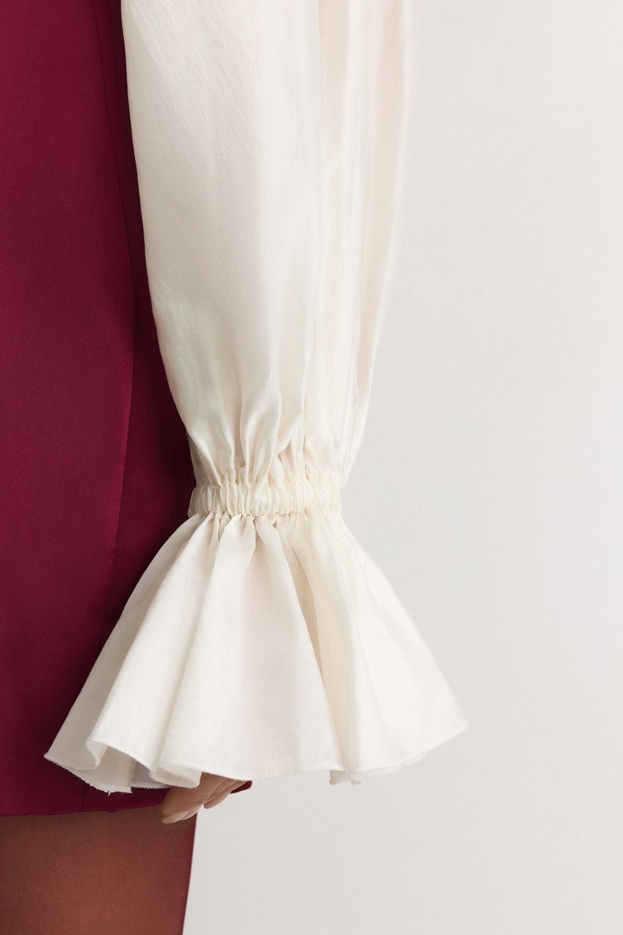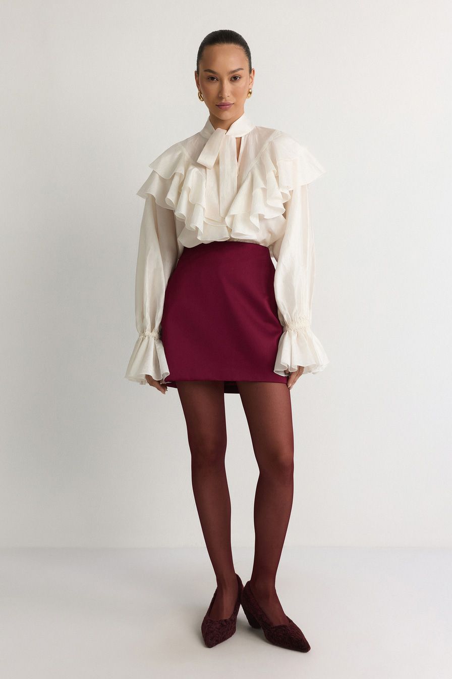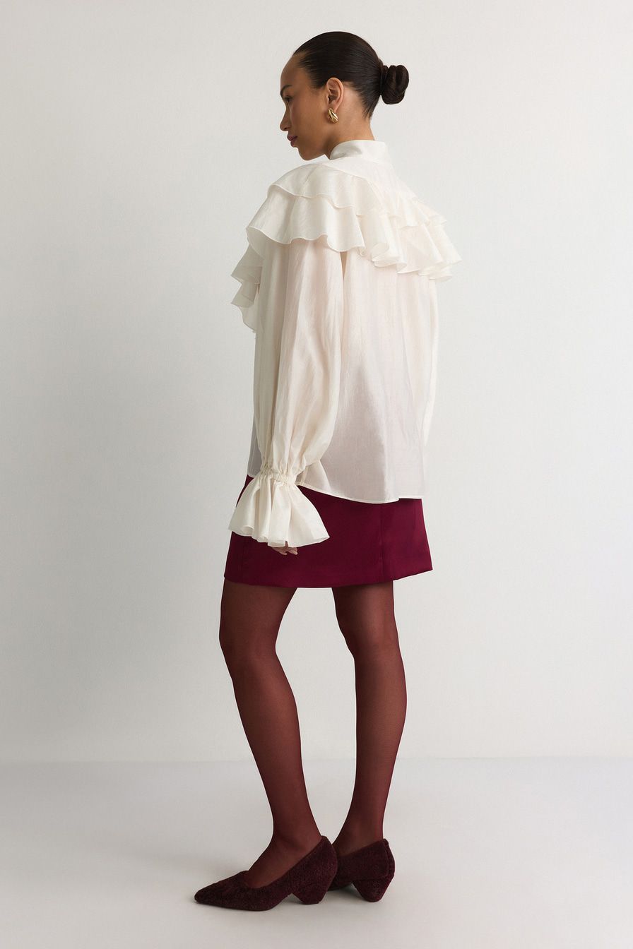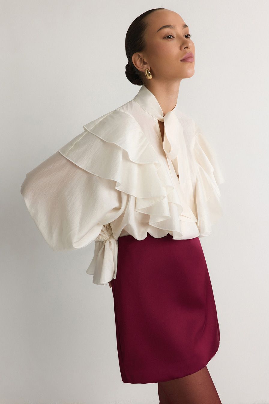 Белая блуза свободного кроя выполнена из тонкого, полупрозрачного смесового тенселя. Тенсель – материал натурального происхождения из древесины эвкалипта. Блуза дополнена воланами и воротником с лентами, которые завязываются бантом.