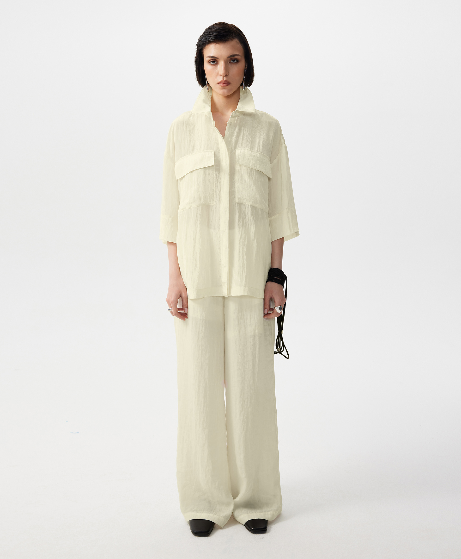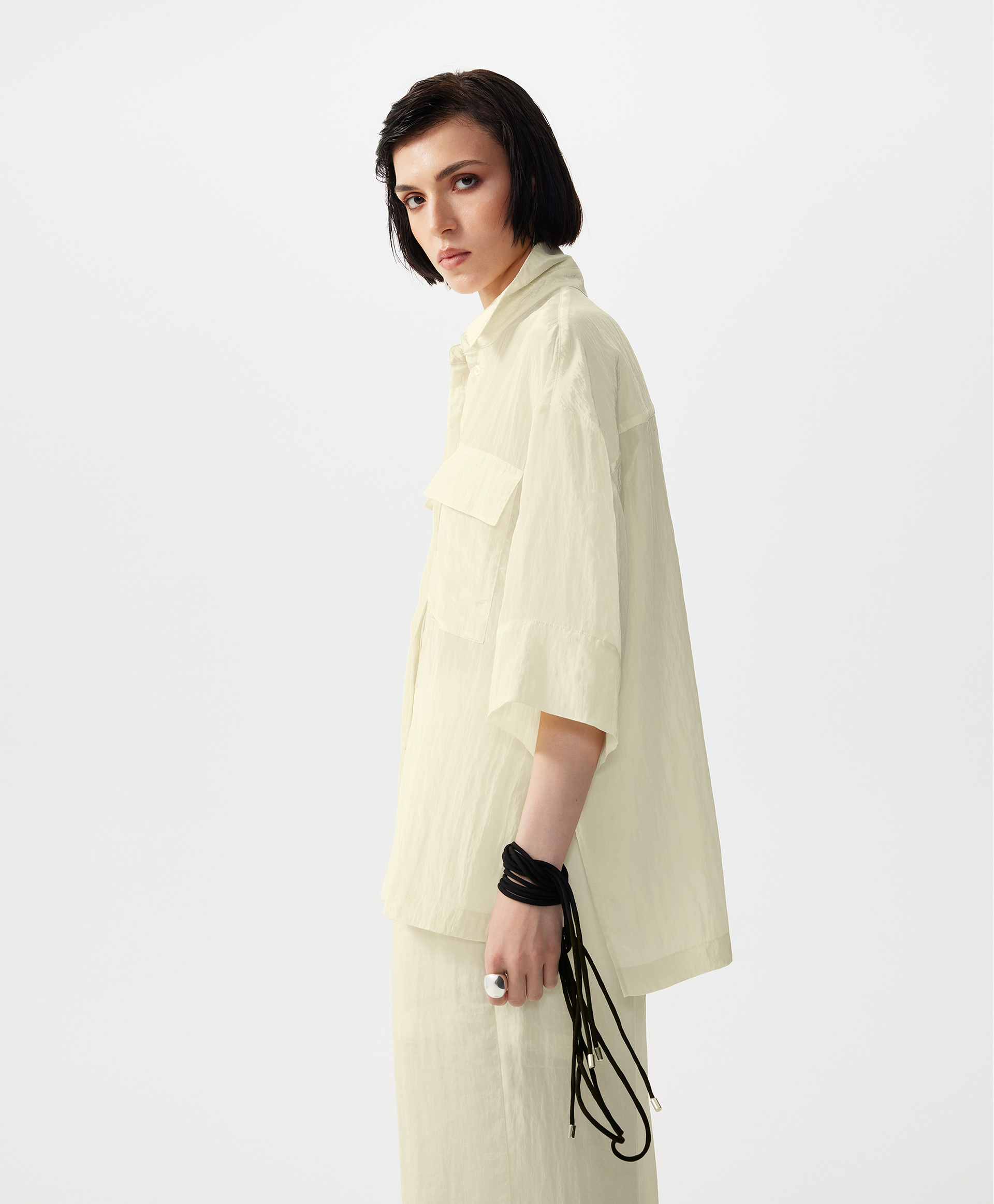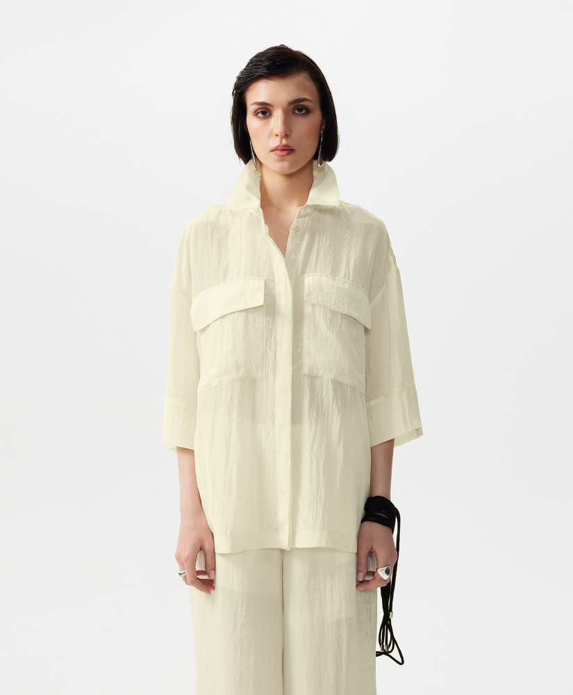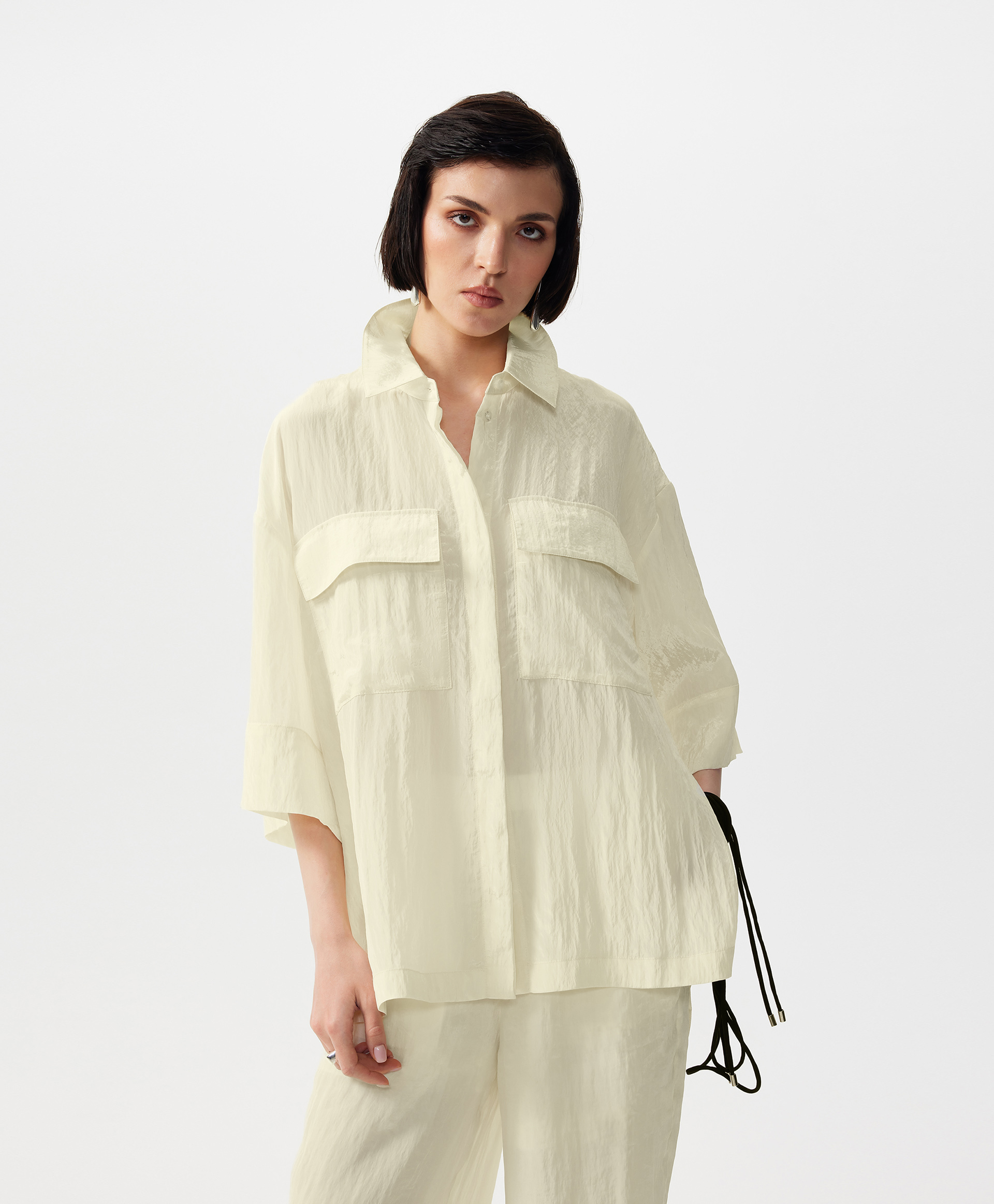 Блузка силуэта оверсайз - прекрасный повод подумать над стильным модным образом в предвкушении лета, солнца, отдыха. Желтый цвет ароматной мимозы со сладковатыми медовыми и цитрусовыми нотками в сочетании с переливающимся вискозным текстилем с легкой жатой текстурой несут энергию пробуждения, настраивают на позитив. Накладные карманы с клапанами, удлиненная линия спинки и высокие разрезы в боковых швах придают изделию простоту и демократичность городского стиля. Блузка может быть комфортным единичным изделием, а может красиво завершать образы с платьями, сарафанами, комплектами. И застегнутая на все пуговицы, скрытые элегантной супатной планкой, и надетая нараспашку завершающим слоем, блузка будет выглядеть свежо, расслабленно.