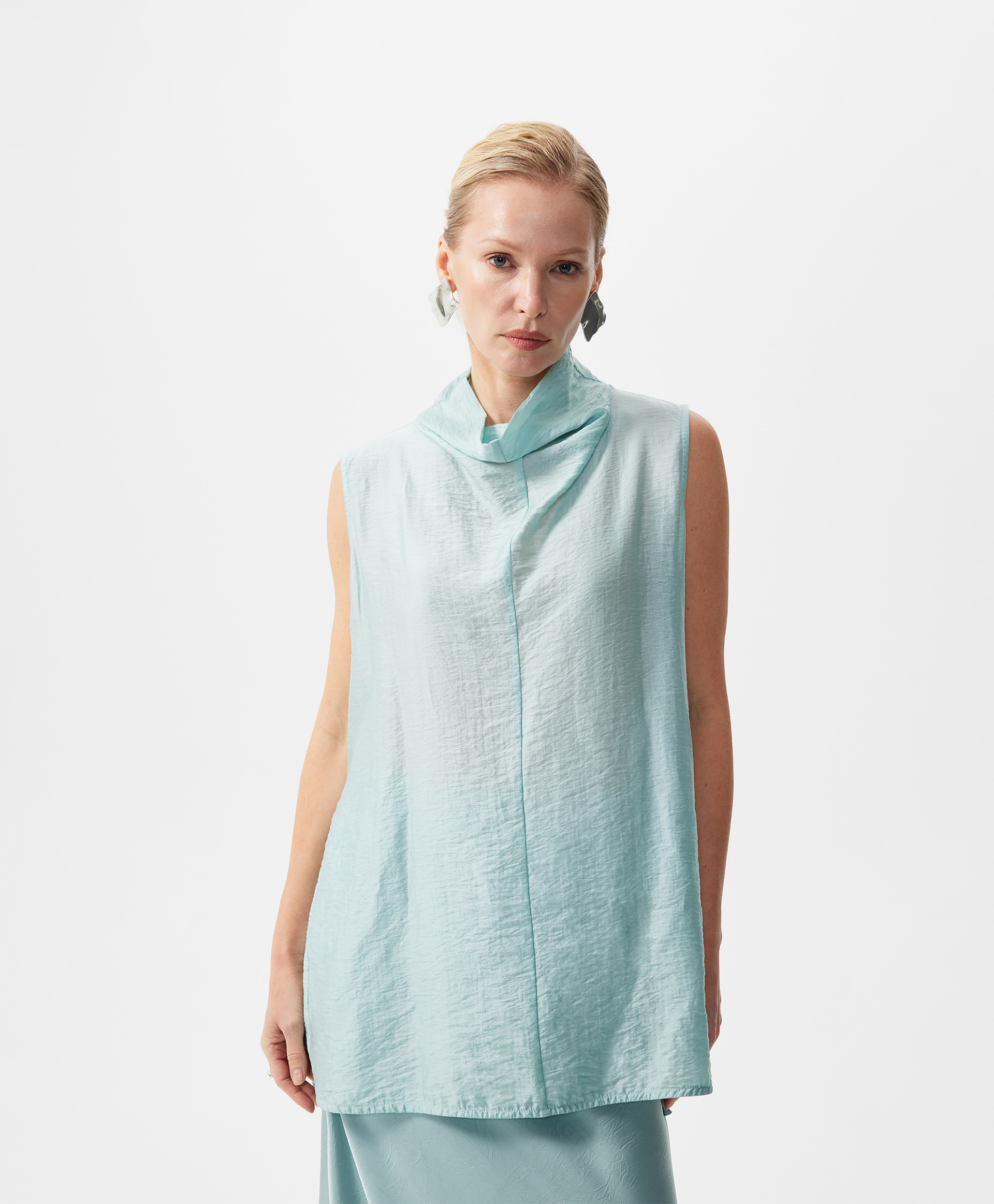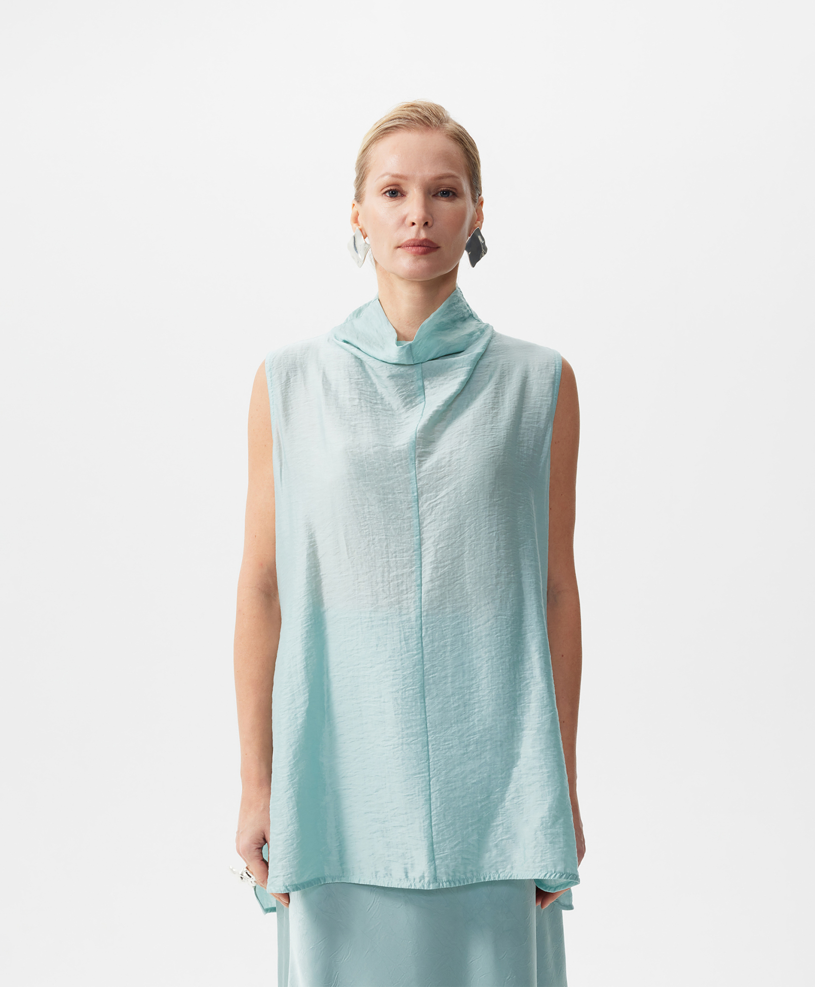 Блузка удлиненная без рукавов с мятым эффектом.