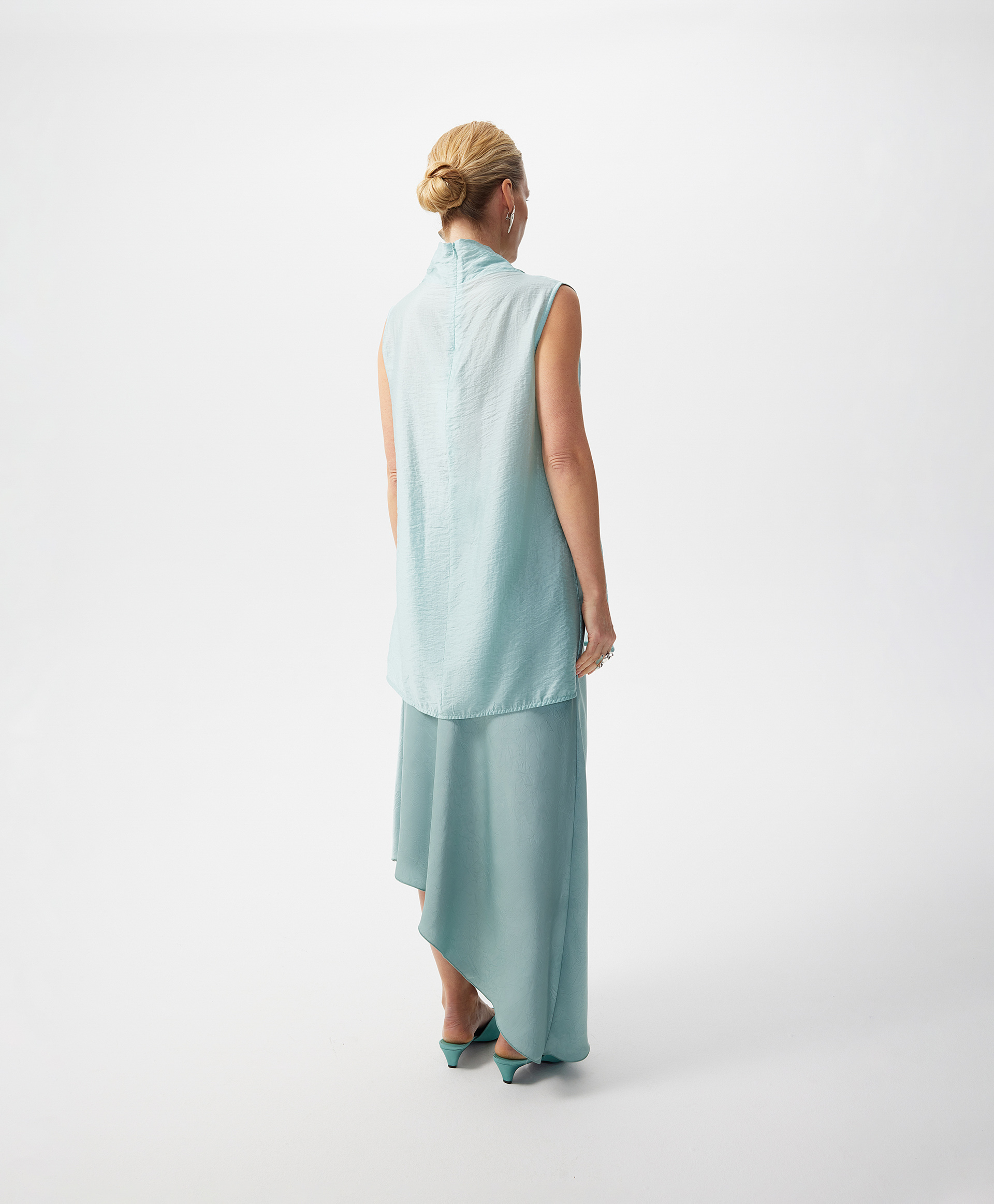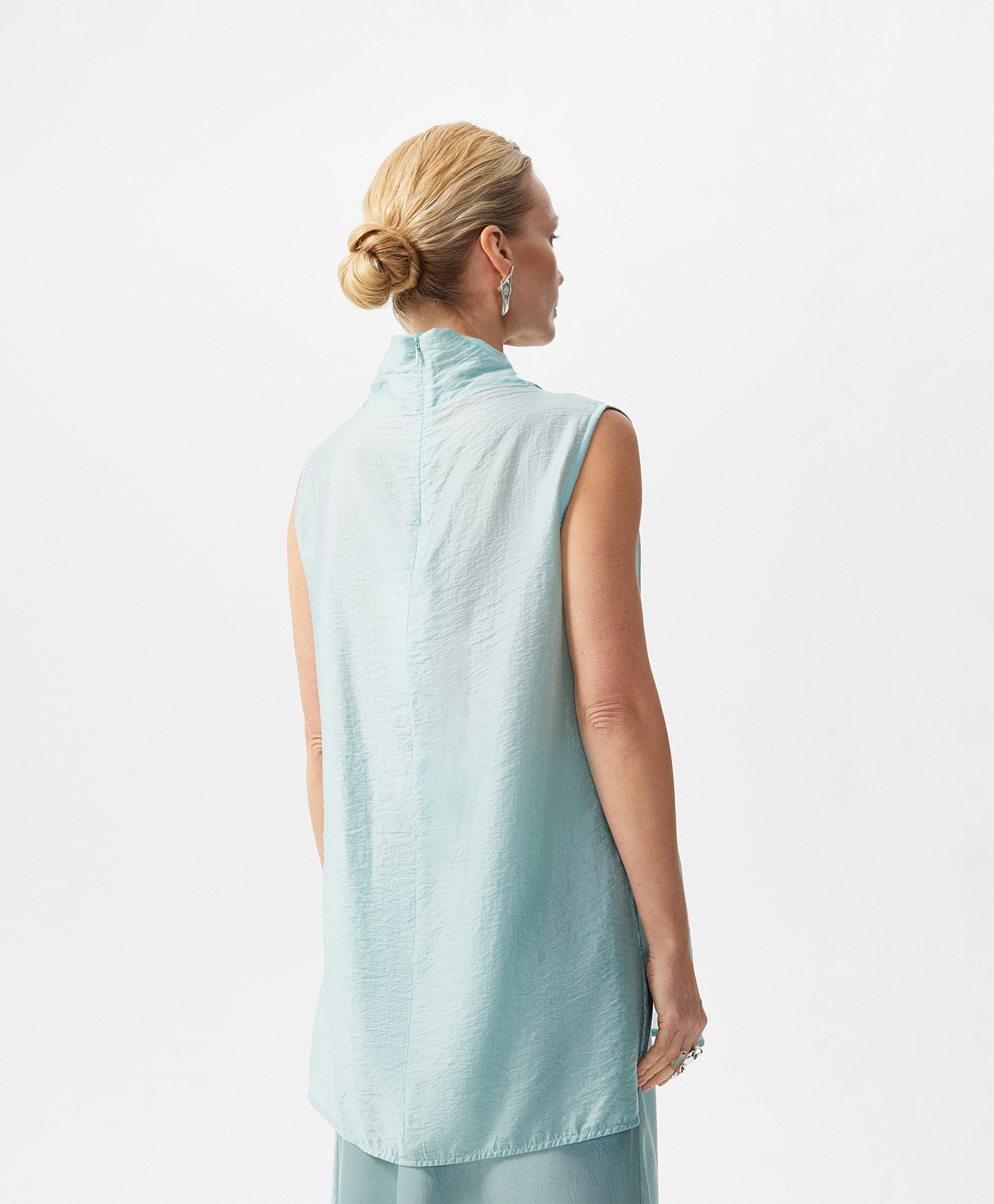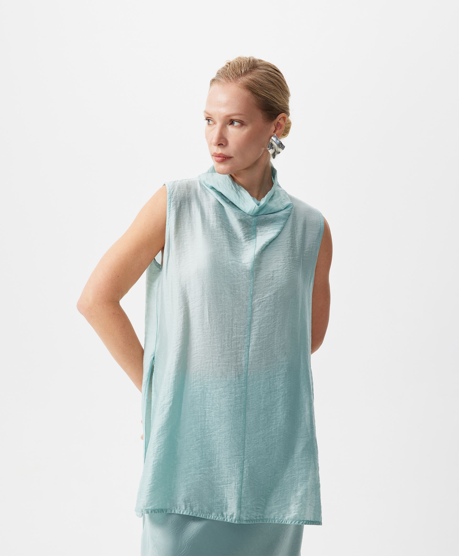 Белая удлиненная блузка трапециевидной формы без рукавов выполнена из мягкого воздушного тенселя, отражающего тренд на шелковистые ткани с крэш эффектом, наделяющим изделие деликатной фактурой. Минималистичный дизайн модели подчеркнут лаконичным архитектурным кроем. Высокий свободный воротник-стойка, переходящие в воротник вертикальные рельефы в средней части спинки и полочки придают модели остроту и концептуальность. Высокие разрезы в боковых швах создают красивый шлейфовый эффект при движении. Блузка застегивается на потайную молнию на спинке.