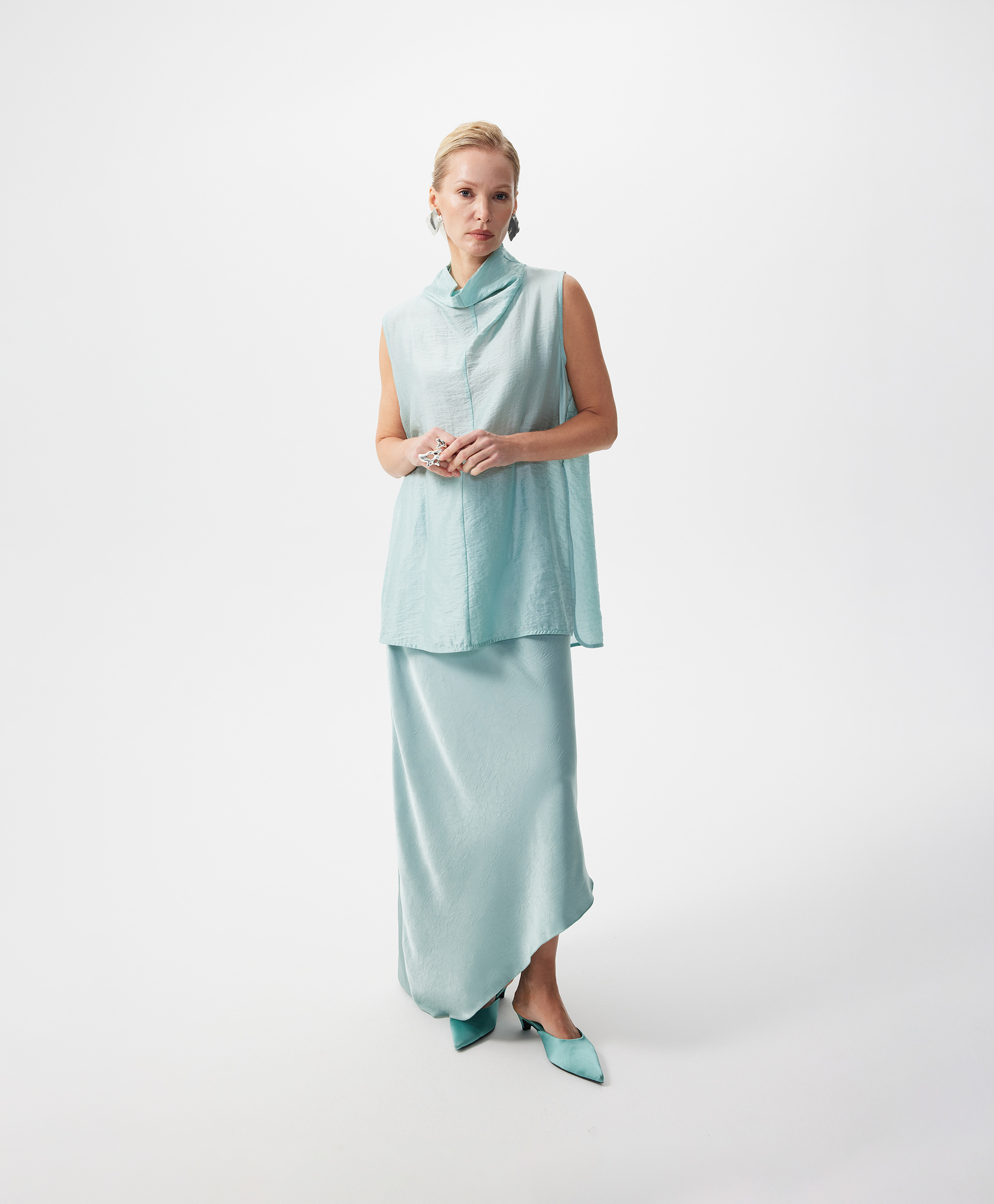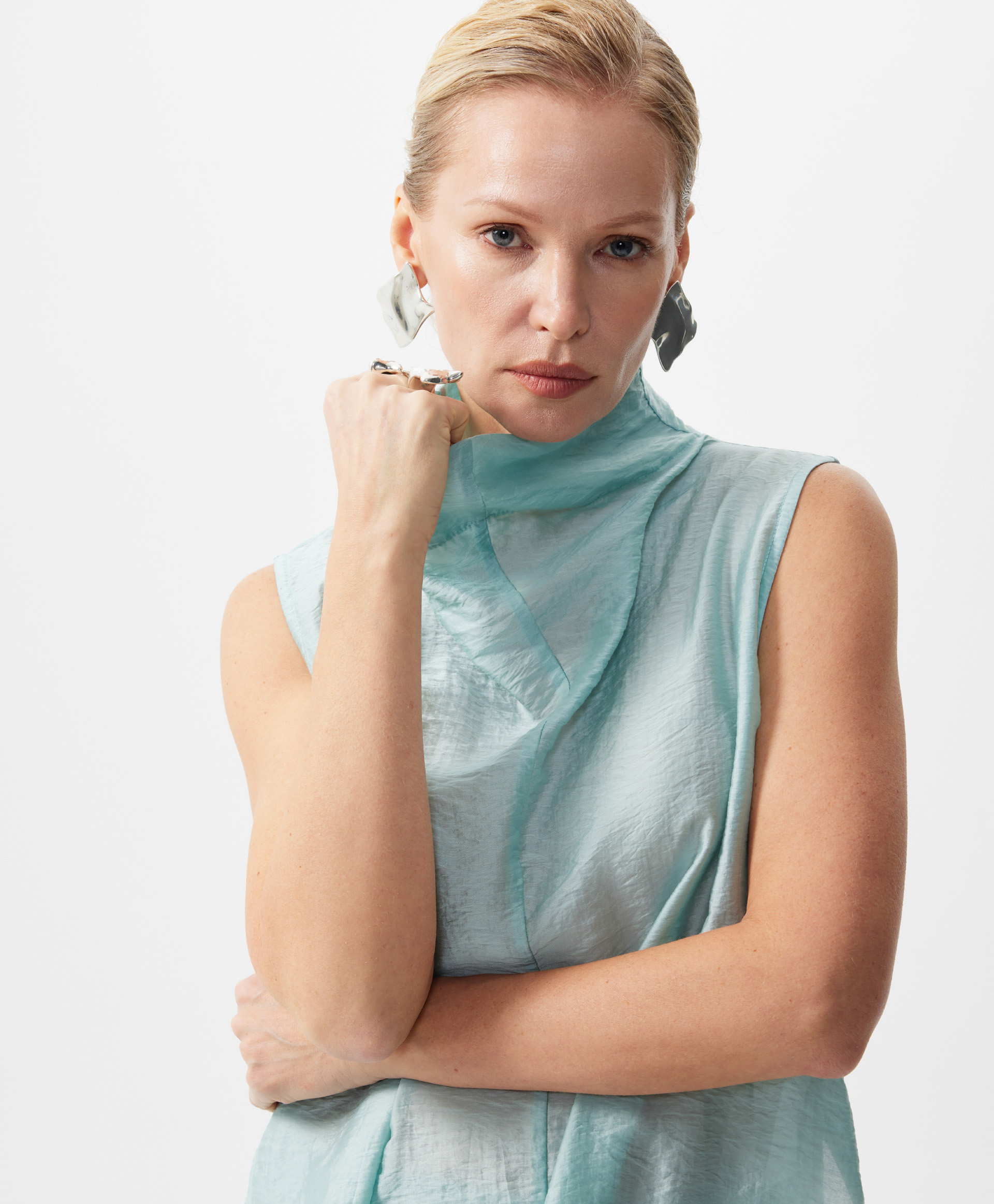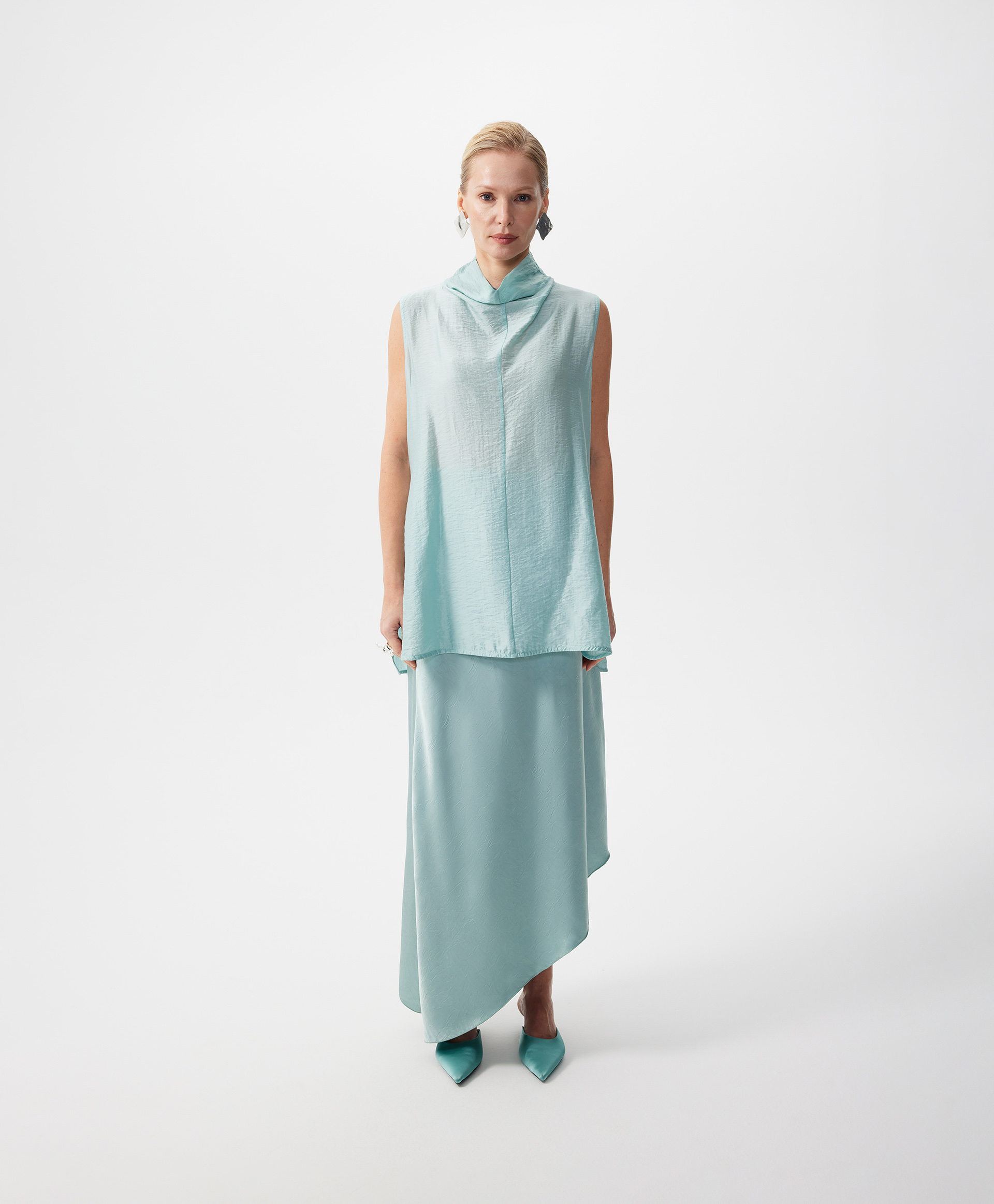Белая удлиненная блузка трапециевидной формы без рукавов выполнена из мягкого воздушного тенселя, отражающего тренд на шелковистые ткани с крэш эффектом, наделяющим изделие деликатной фактурой. Минималистичный дизайн модели подчеркнут лаконичным архитектурным кроем. Высокий свободный воротник-стойка, переходящие в воротник вертикальные рельефы в средней части спинки и полочки придают модели остроту и концептуальность. Высокие разрезы в боковых швах создают красивый шлейфовый эффект при движении. Блузка застегивается на потайную молнию на спинке.