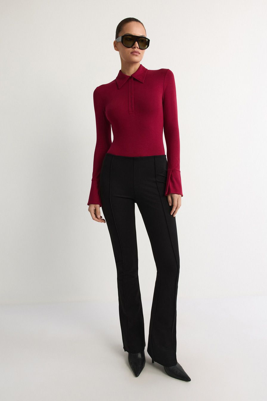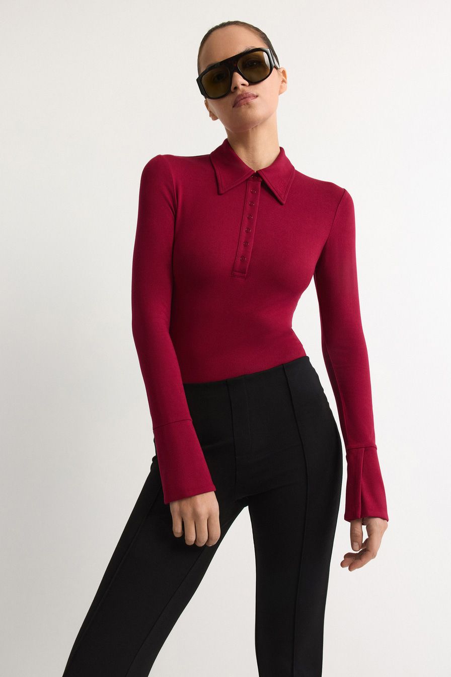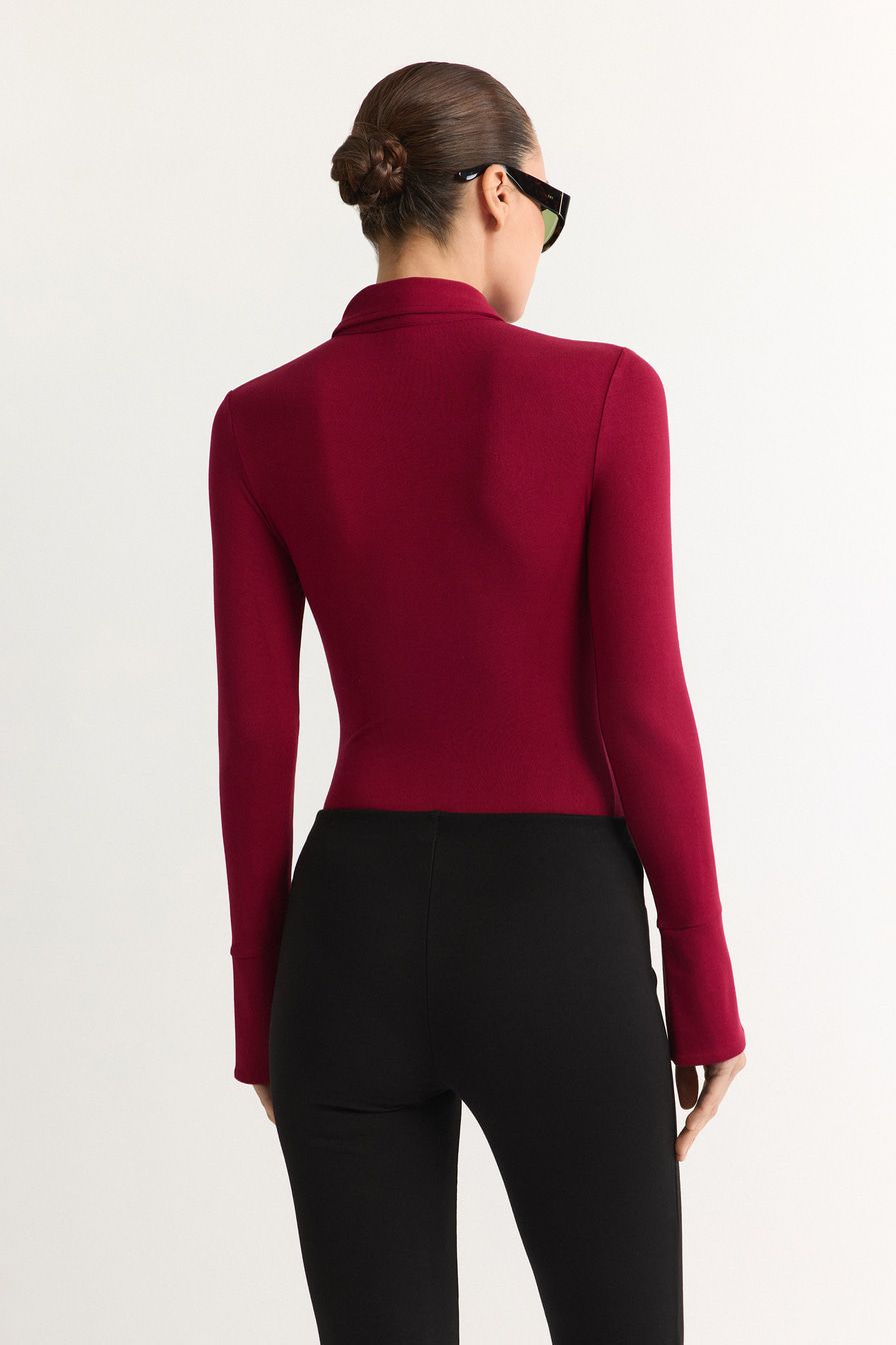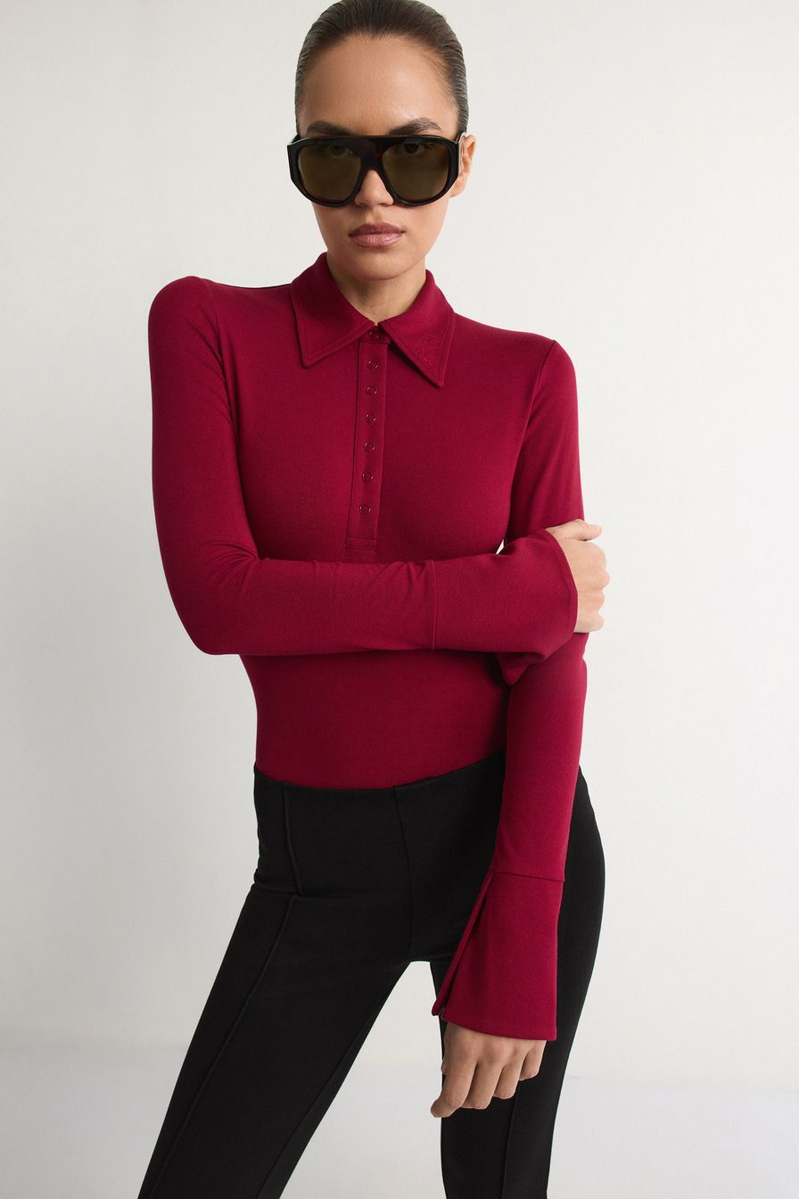 Бордовое боди из мягкой эластичной вискозы – модель облегающего кроя с длинными рукавами. Боди дополнено воротником-поло с застежкой на кнопки.