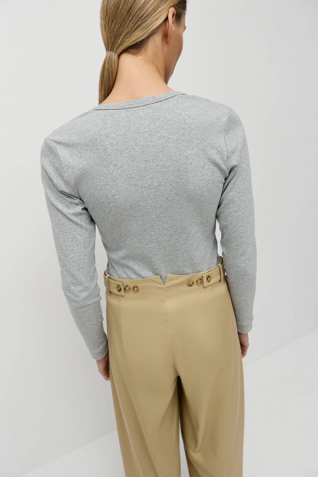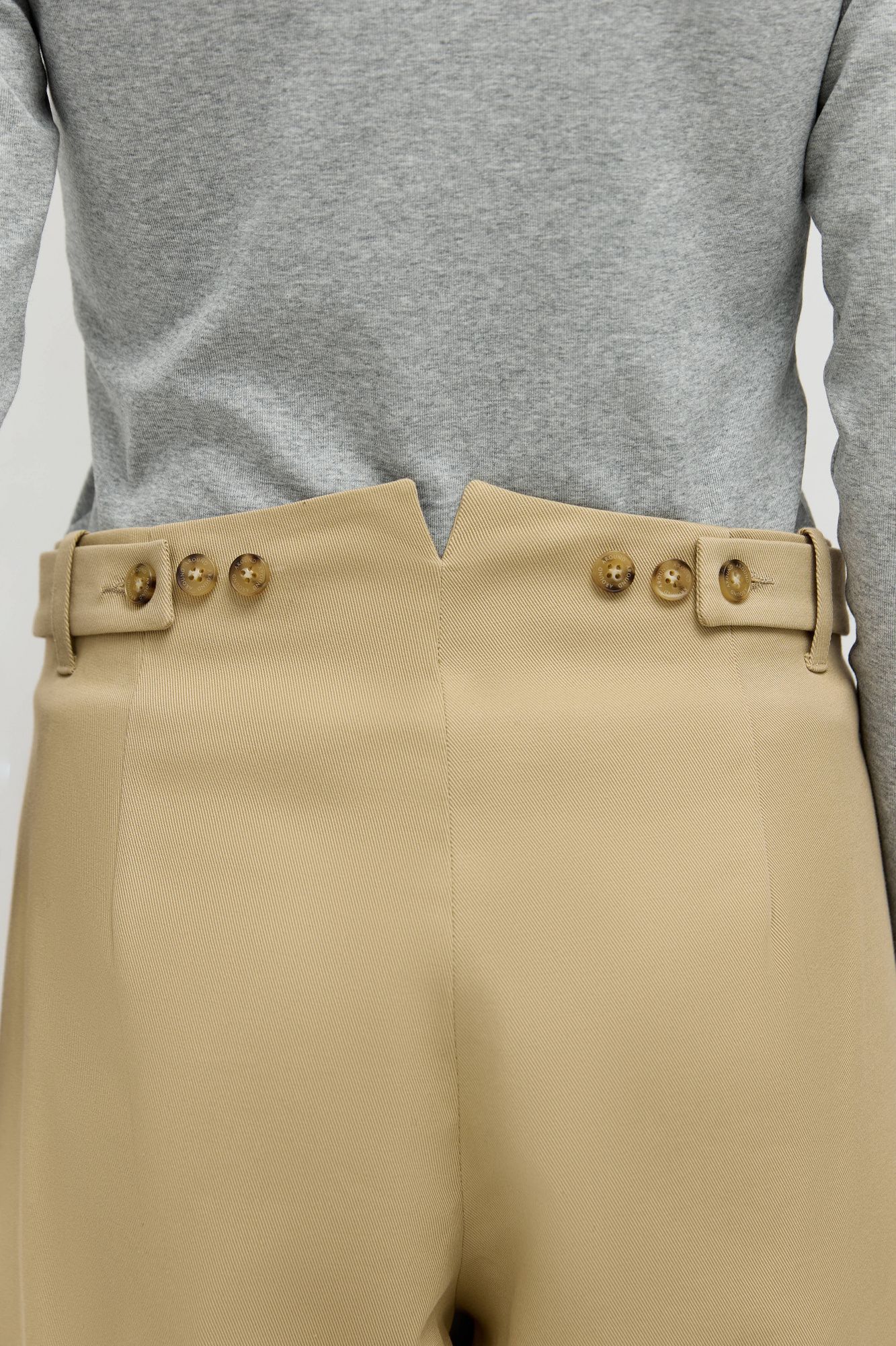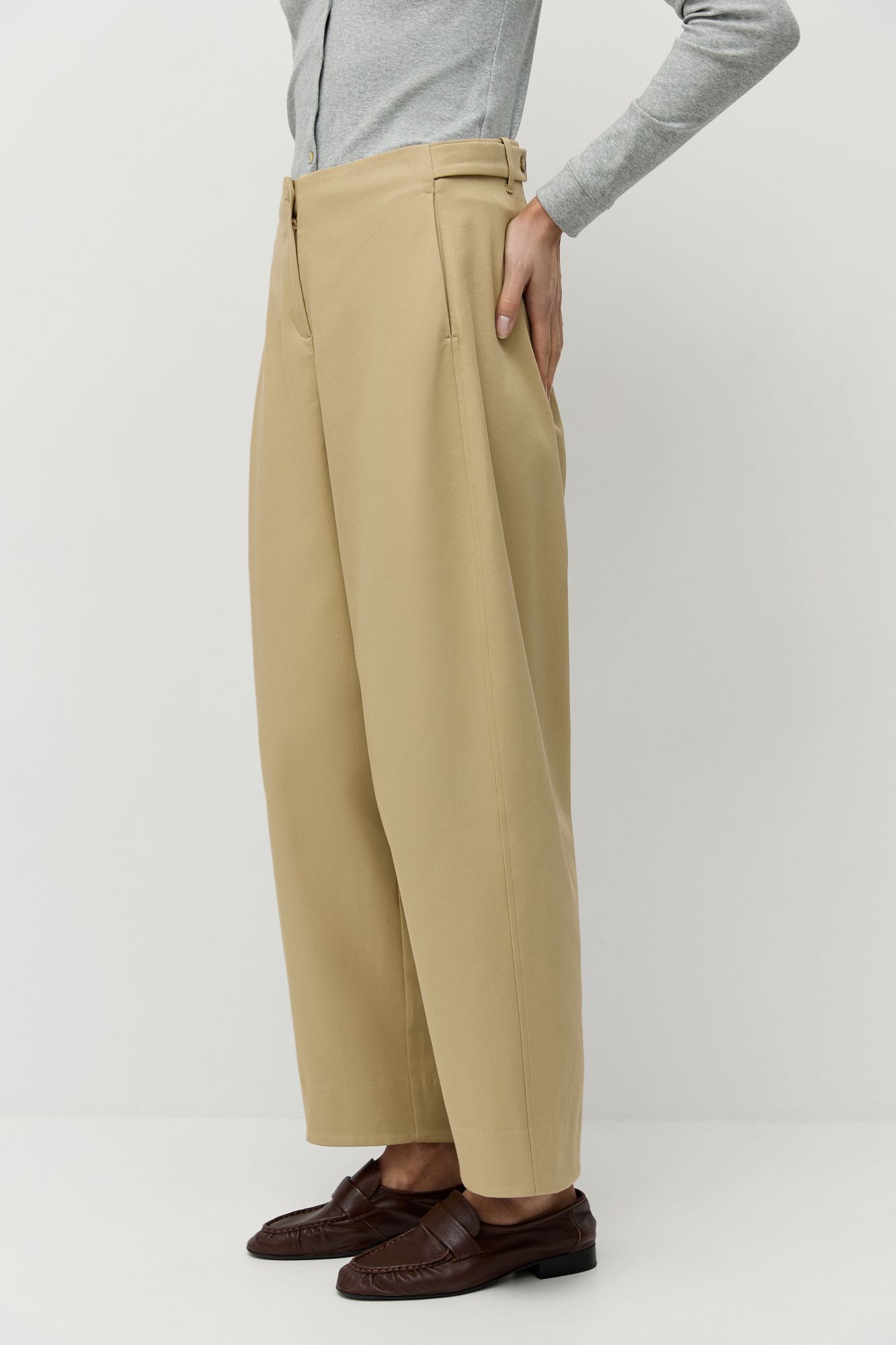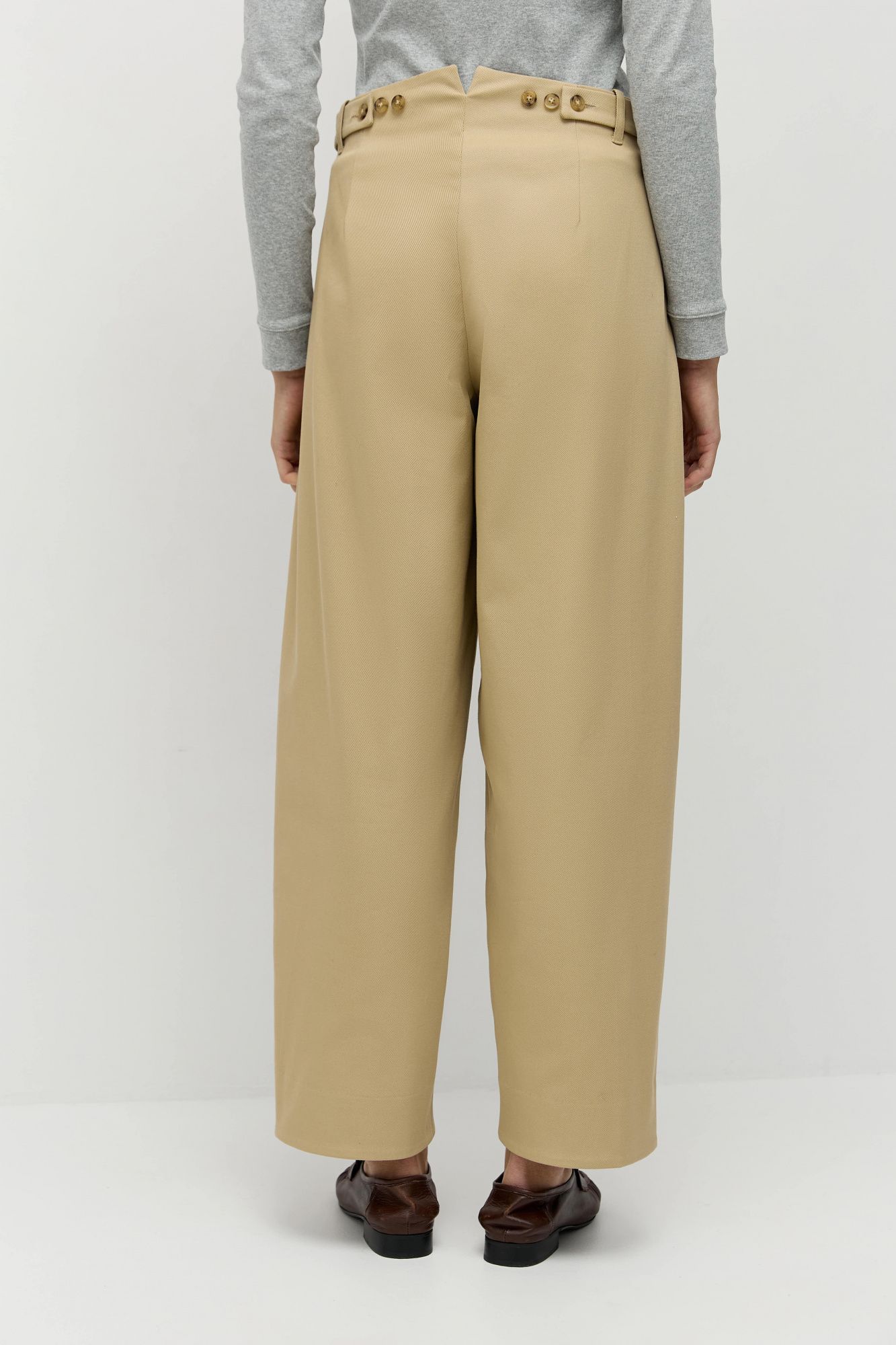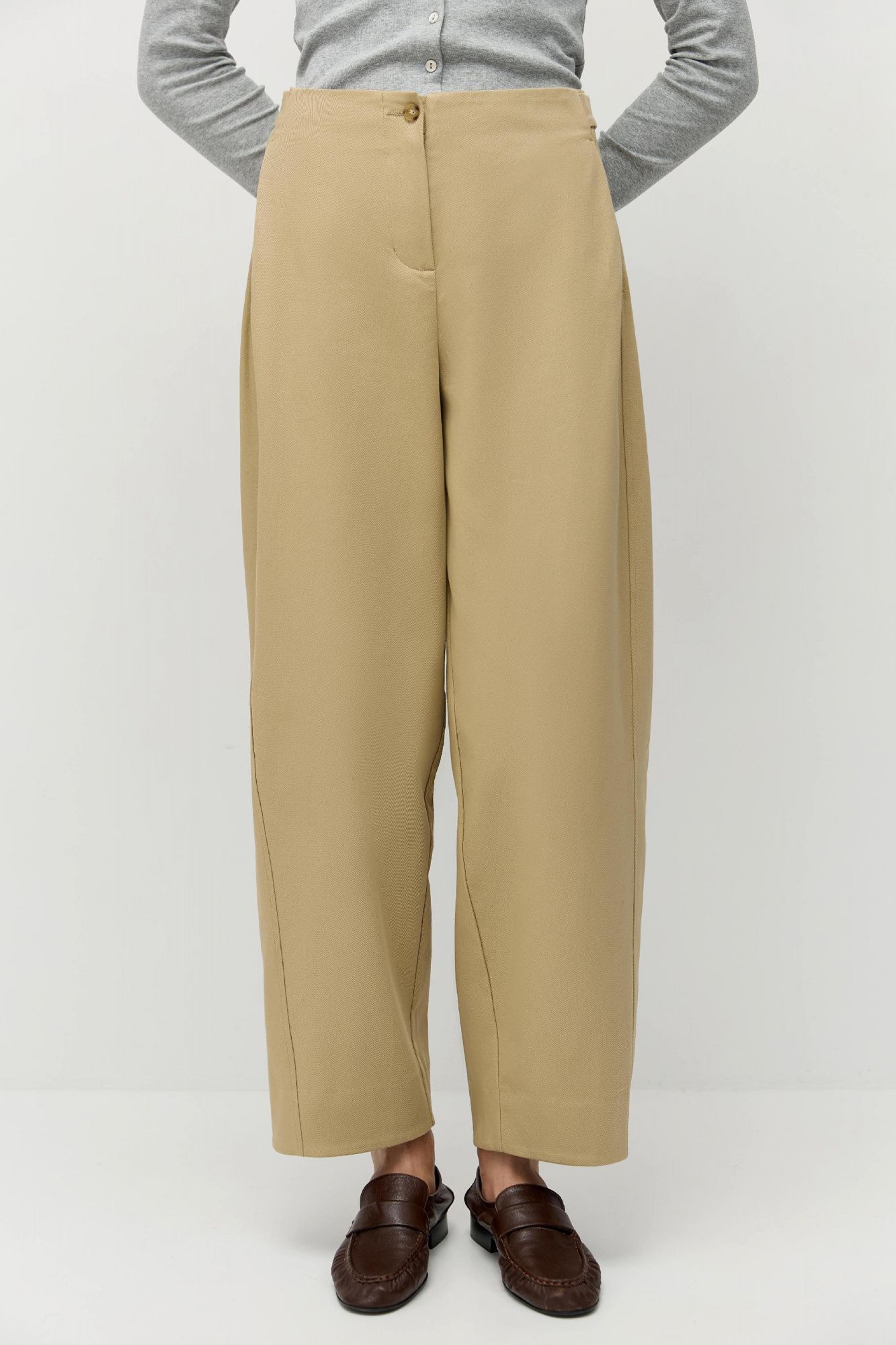 Брюки сшиты из итальянского хлопка в мелкий диагональный рубчик. Модель «брюки-бочонки»: особенность этих брюк в округлом силуэте, крой расширен в области колен и слегка заужен к низу. Без отрезного пояса, застегиваются на переднюю молнию и пуговицу. На талии предусмотрены конструктивные элементы, корректирующие посадку: средняя или слегка спущенная на бедра. По низу выполнена высокая обтачка, чтобы при желании брюки можно было бы подвернуть. Универсальная модель легко дополнит любой образ: от вечернего до повседневного или делового.