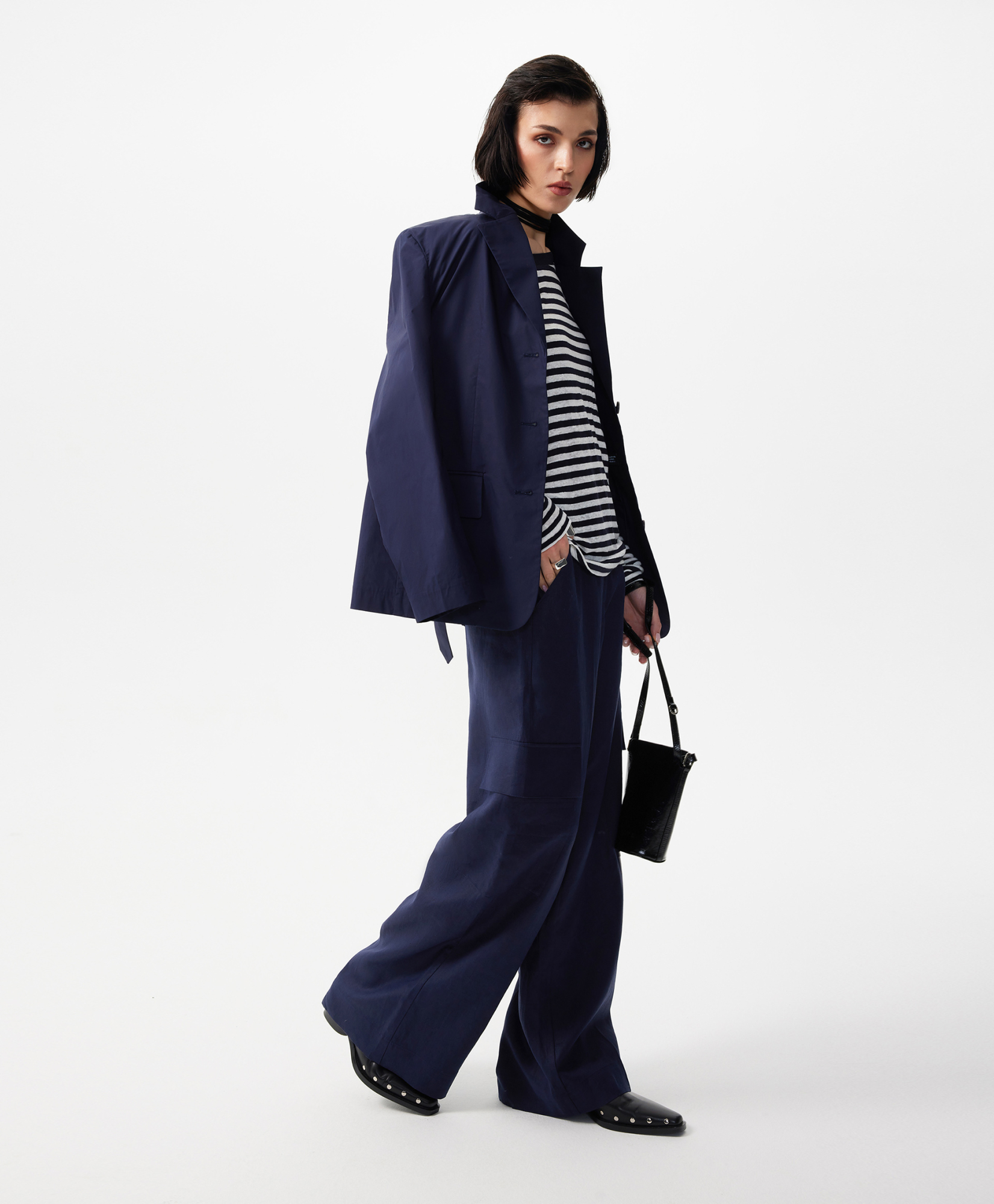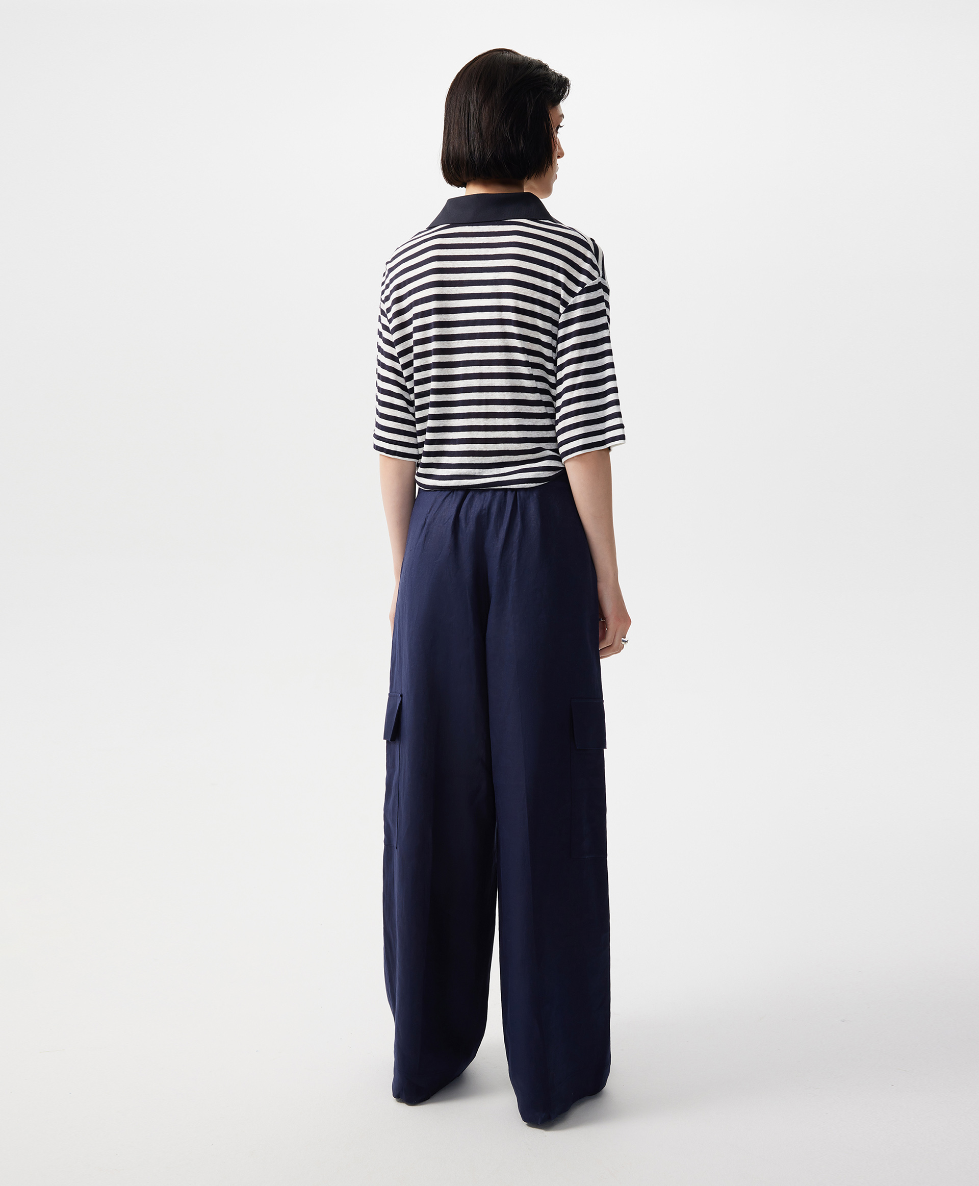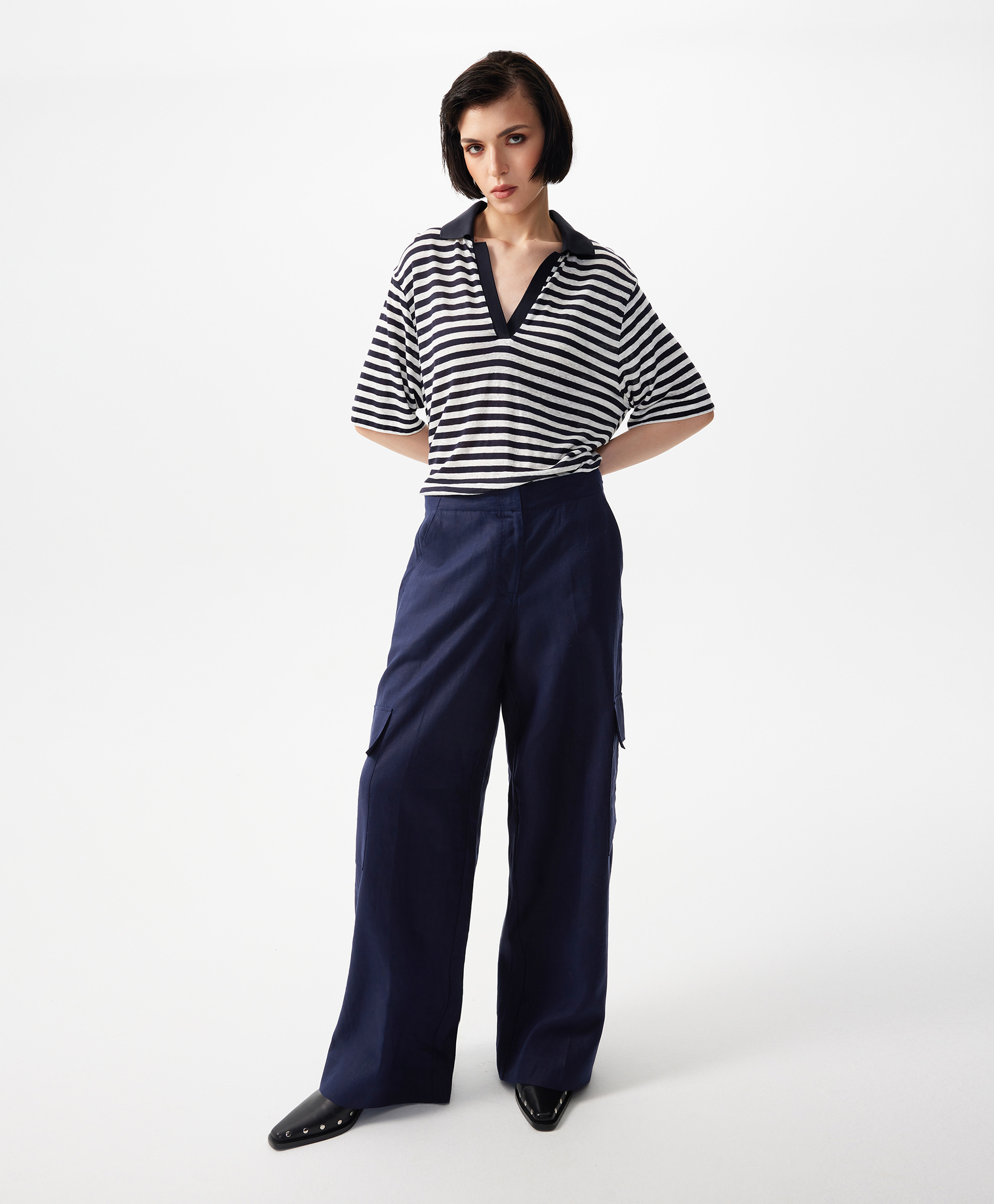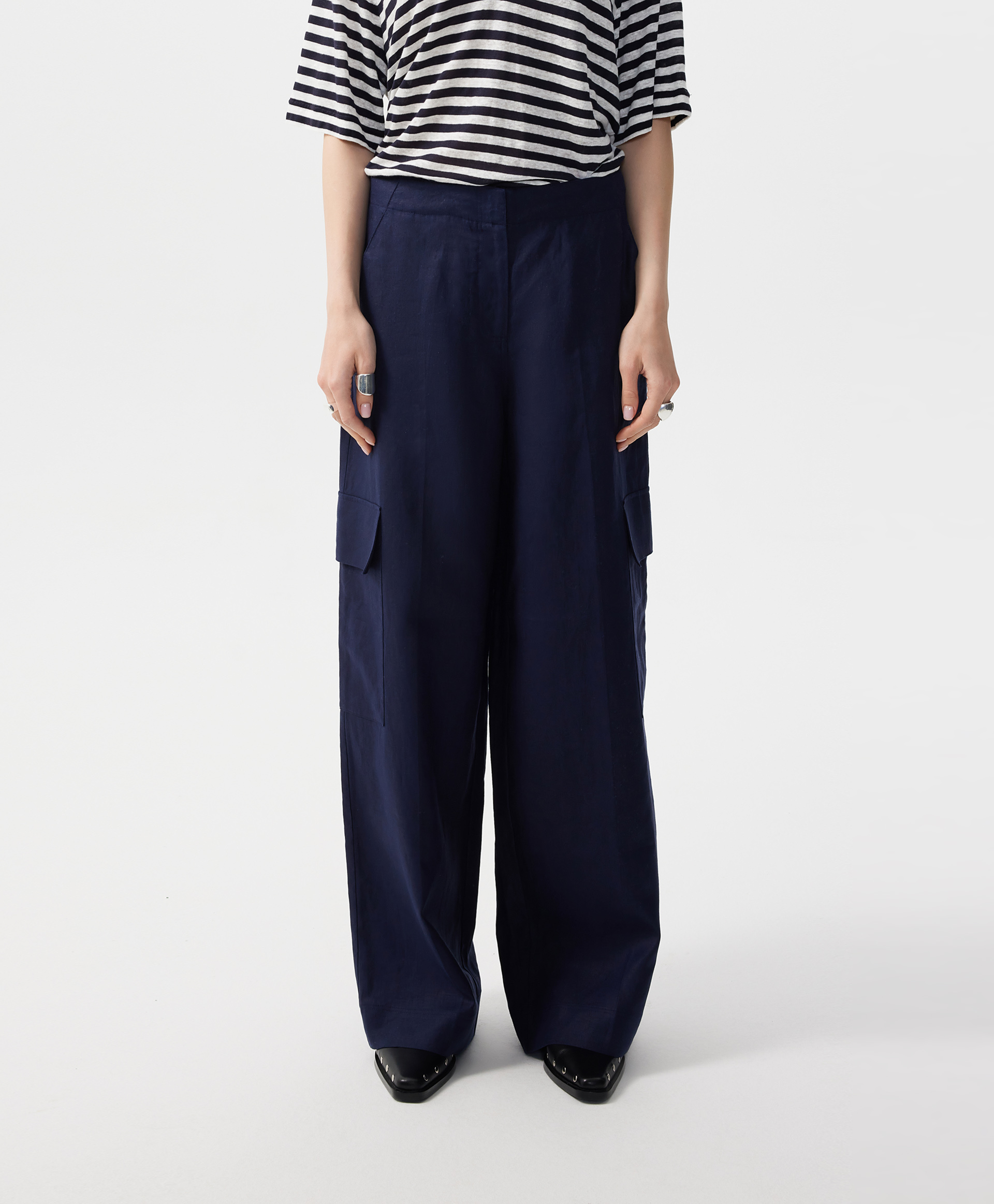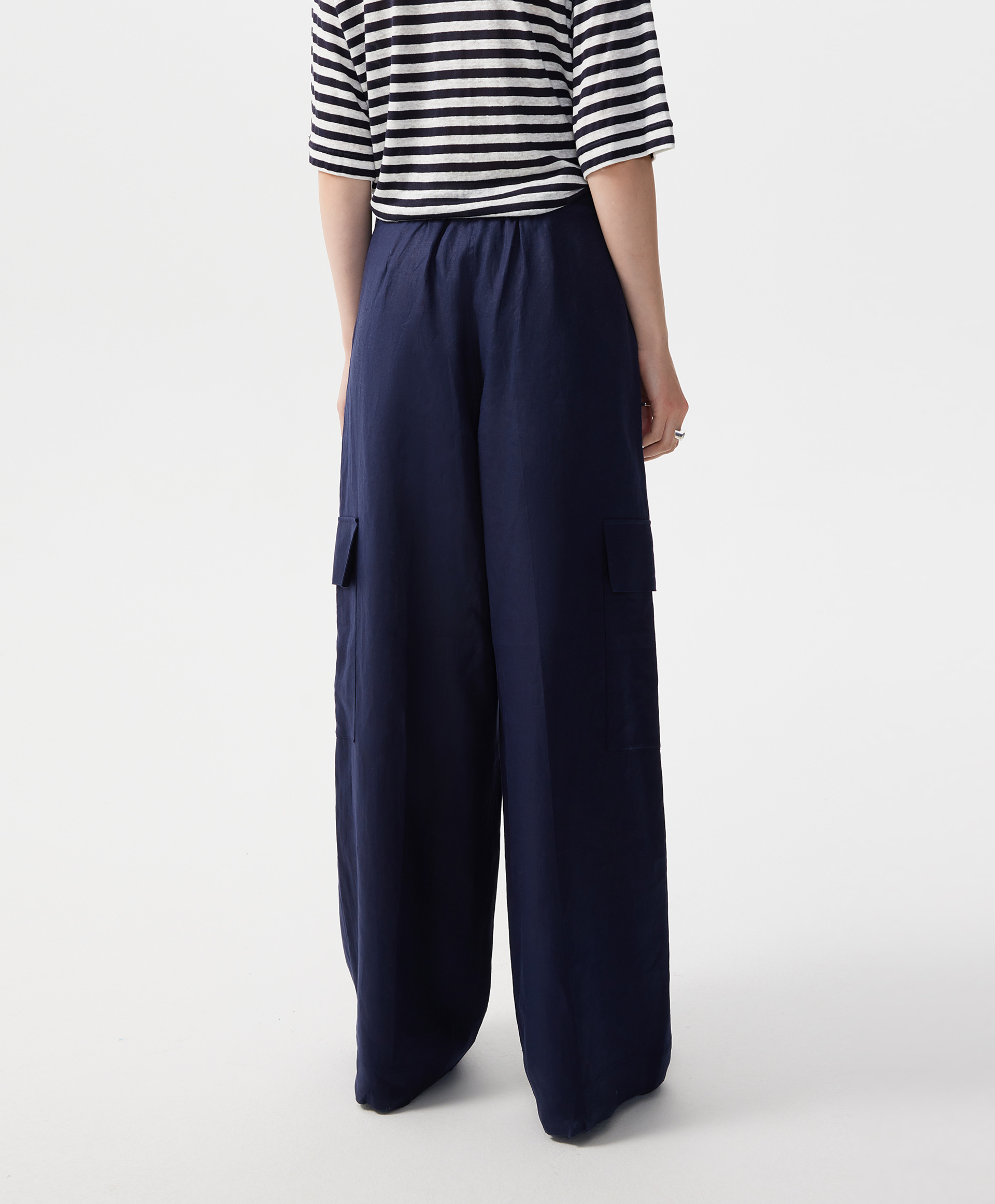 Прямые свободные брюки-трубы средней посадки с карманами-карго - прекрасный вариант и для трудовых будней, и для городских прогулок, и для загородных поездок, и для отдыха. Красивый синий цвет создает благоприятный эмоциональный фон, придает женщине уверенность и спокойствие. 100% лен, имеющий приятную благородную шероховатую текстуру, наделяет брюки беспрецедентными свойствами: воздухопроницаемостью, гигроскопичностью, гипоаллергенностью, антистатичностью, что особенно ценно в летний сезон. Его повышенная сминаемость не является недостатком. Это признак натуральности, своего рода знак качества, небрежный шик, который всегда в моде. Льняные брюки, действительно, универсальны, а значит, эта лучшая инвестиция в стиль, комфорт, огромные возможности в комбинаторике. С футболкой в полоску брюки создадут аристократичный образ в морском стиле, с рыхлым вязаным джемпером станут любимым городским вариантом. Брюки имеют удобные карманы с наклоном, застегиваются на молнию и крючок.