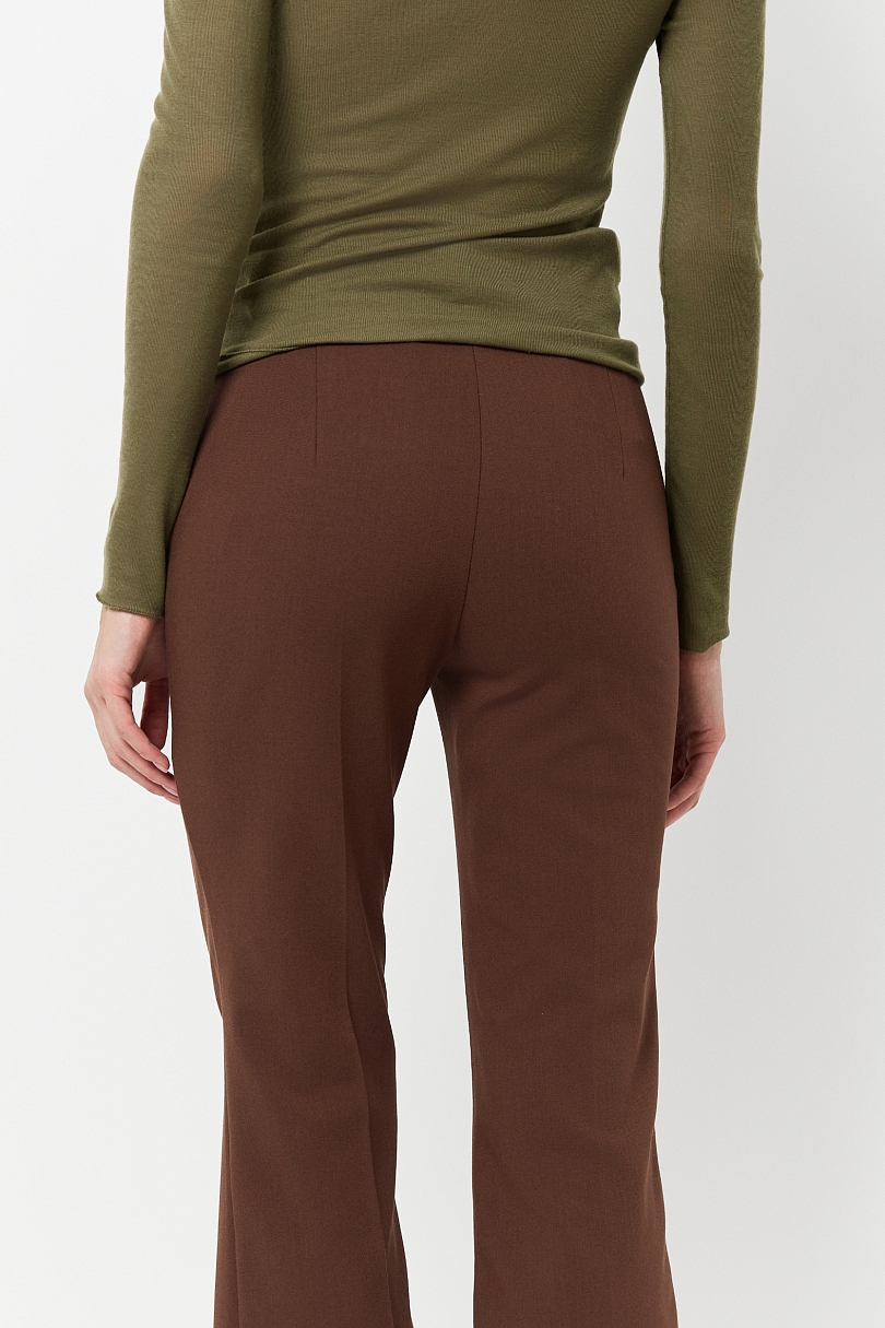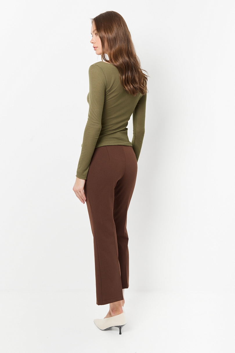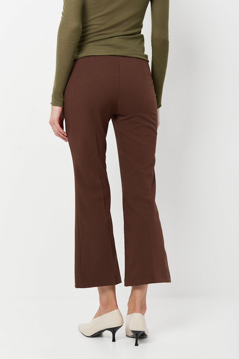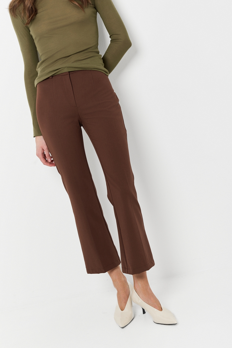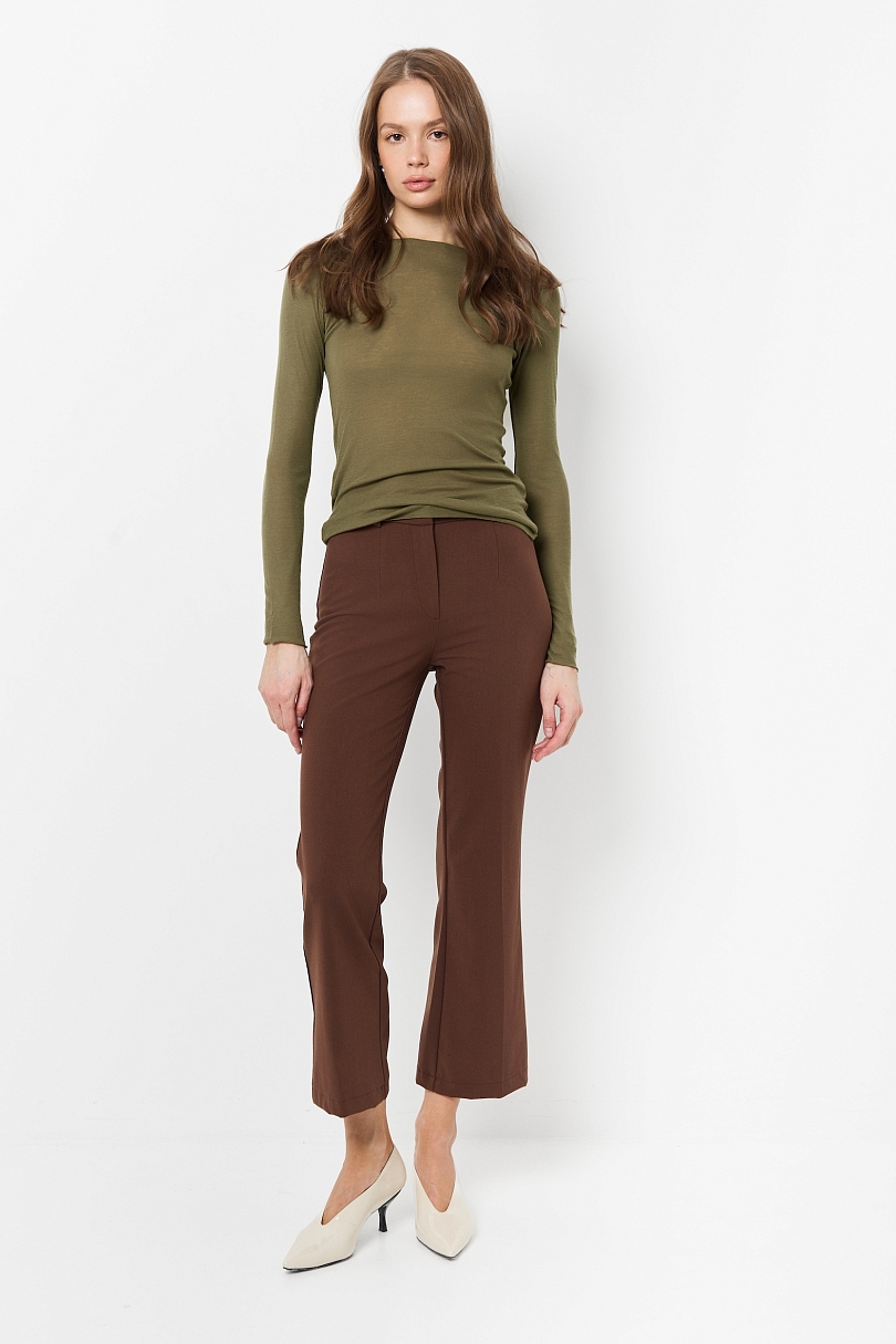 Стильные укороченные брюки — тренд 70-х в современном исполнении для легких повседневных образов! Расширение от бедра создает женственный силуэт, завышенная посадка подчеркивает талию, длина 7/8 открывает щиколотку. Из эластичного смесового трикотажа с вискозой — комфортная посадка, не сковывает движения.