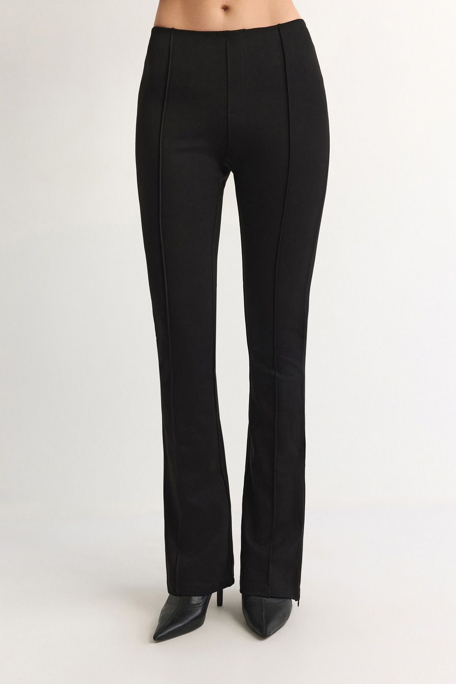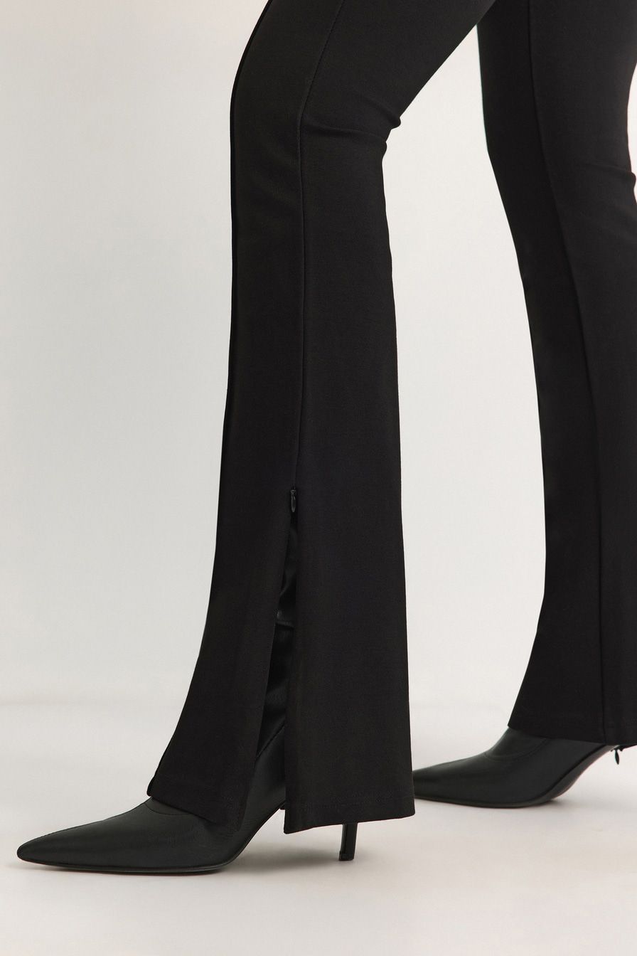 Узкие, слегка расклешенные книзу брюки черного цвета выполнены из смесового района – материала, который изготавливается из целлюлозы. Брюки дополнены фактурными стрелками и застежками-молниями снизу.