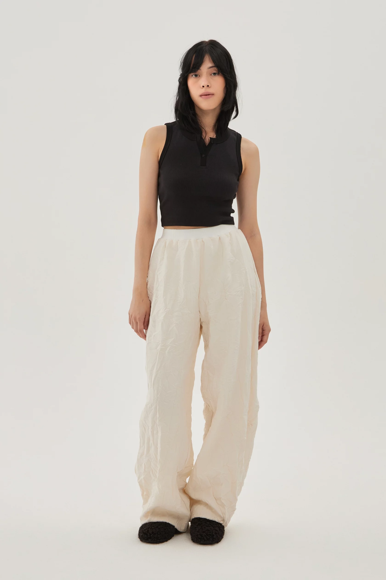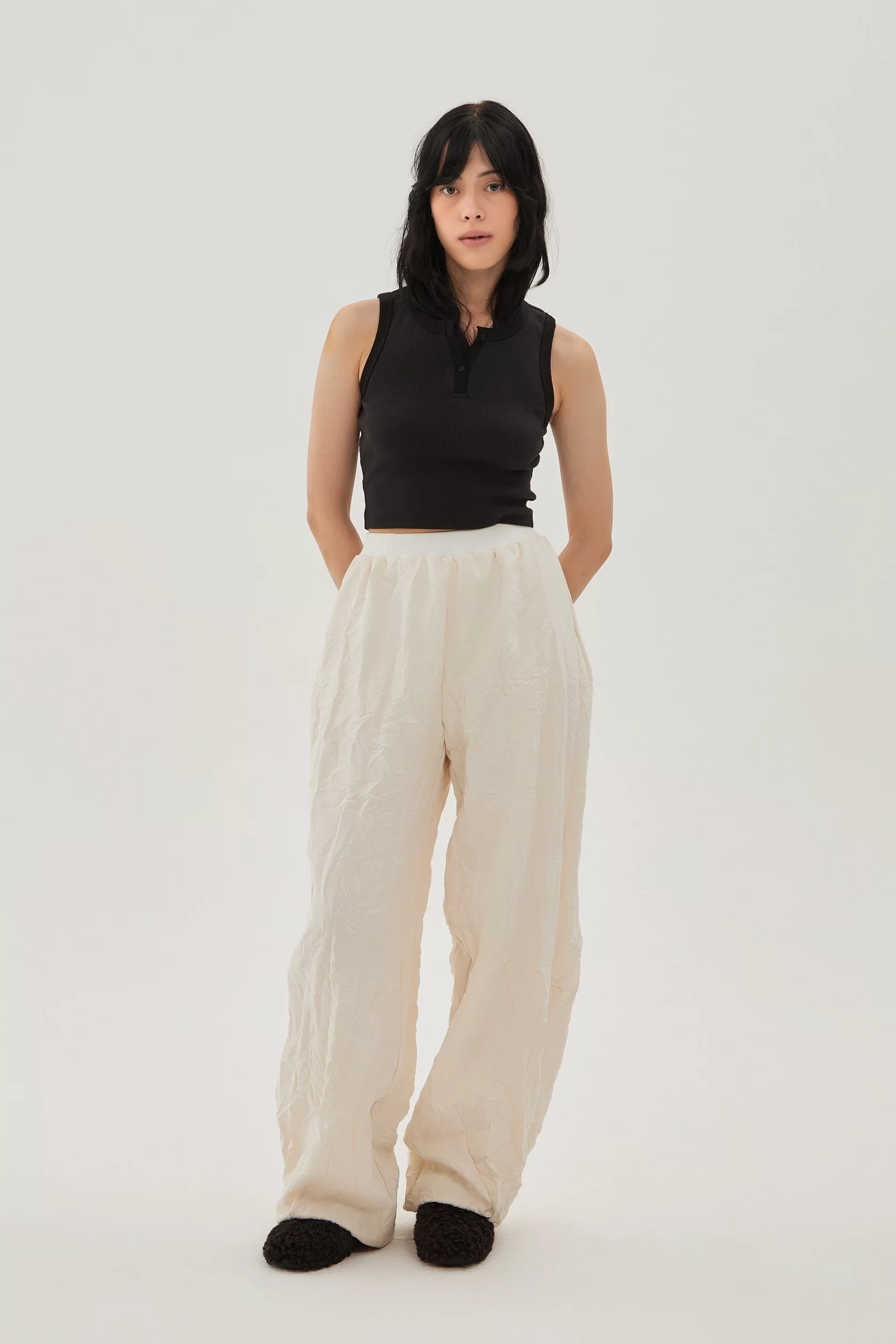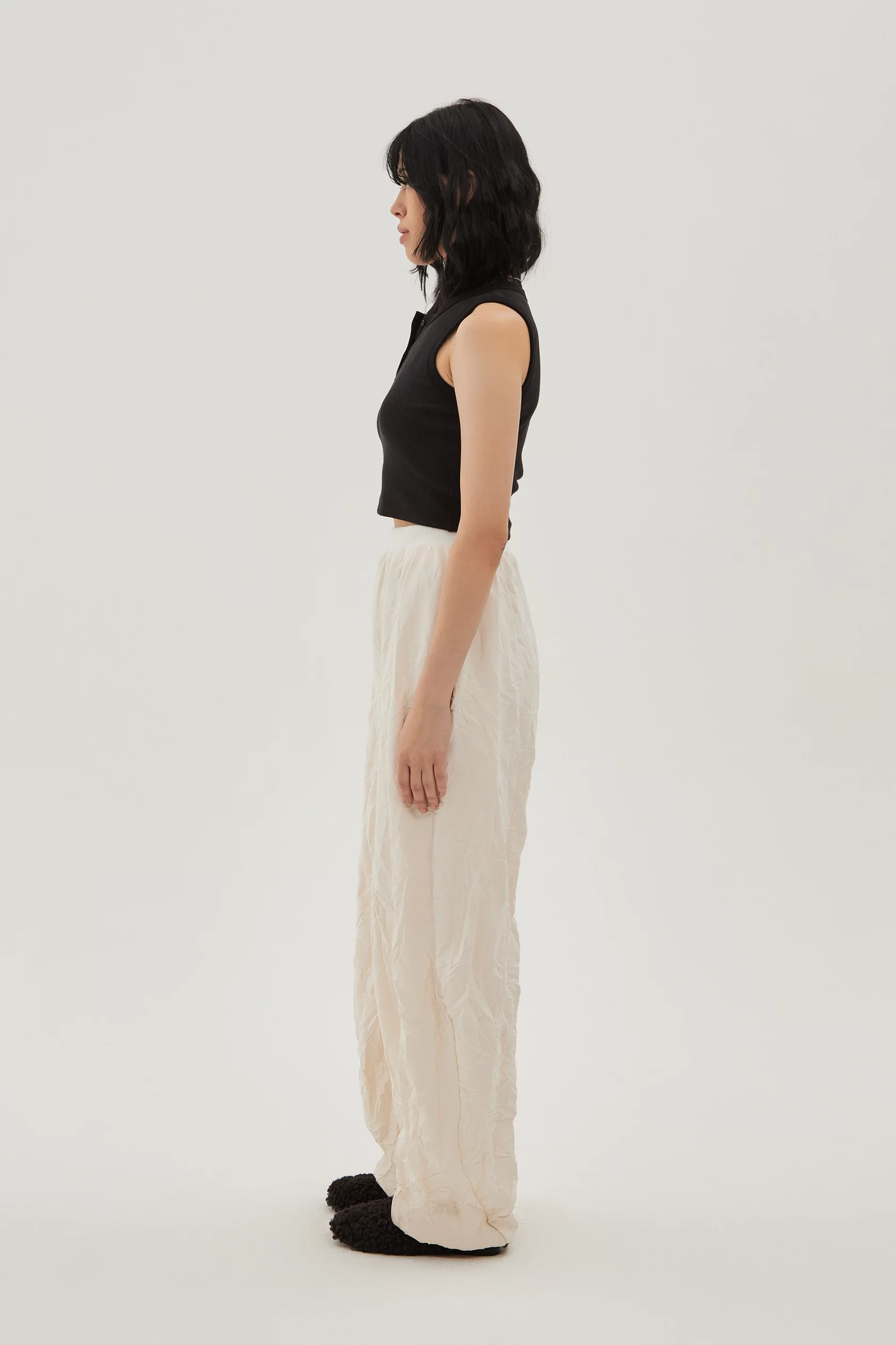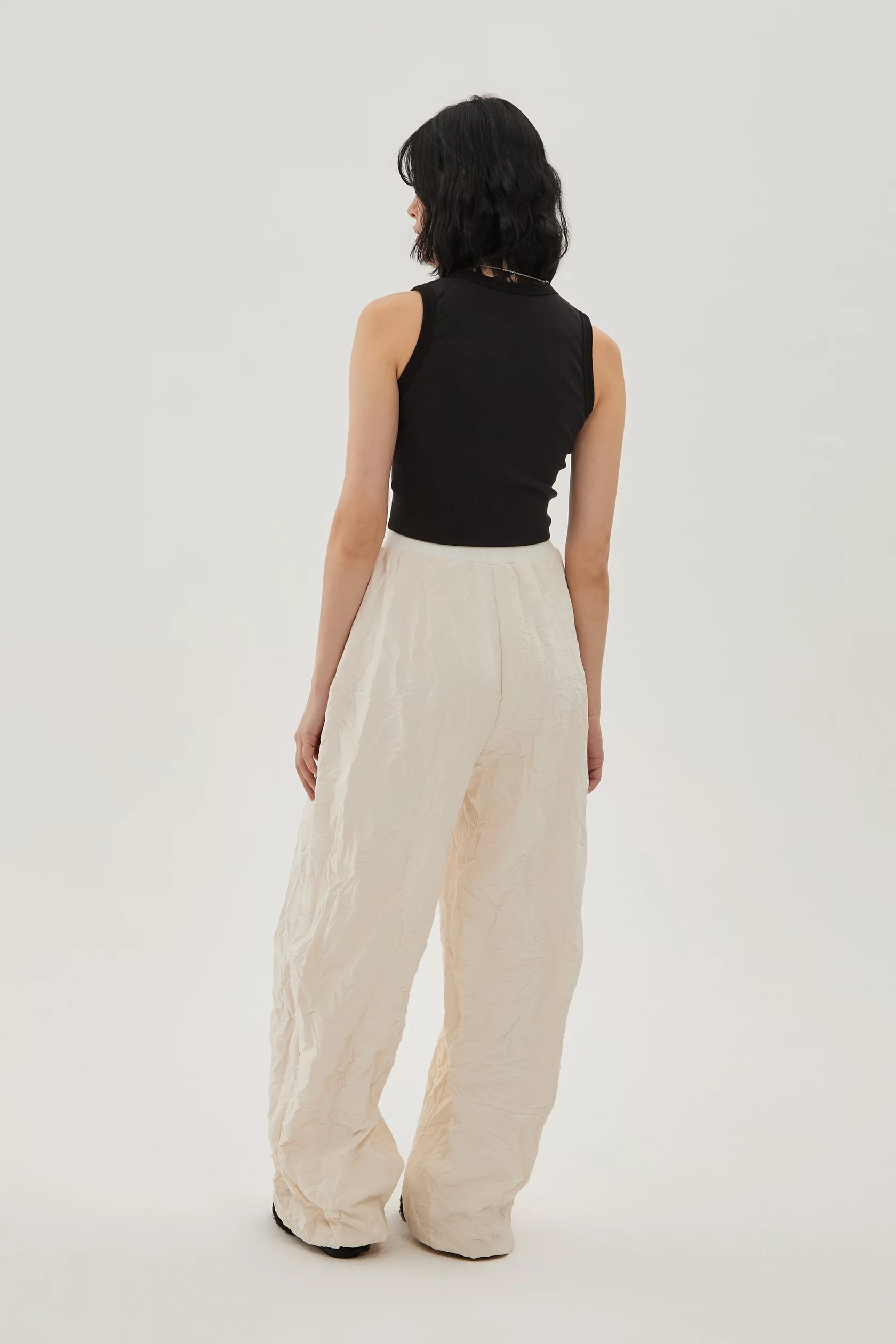 Брюки из мягкой ткани с фактурой смятой мокрой бумаги на хлопковой подкладке. Комфортная посадка за счет резинки вверху, свободный крой, низ брюк сделан баллоном.