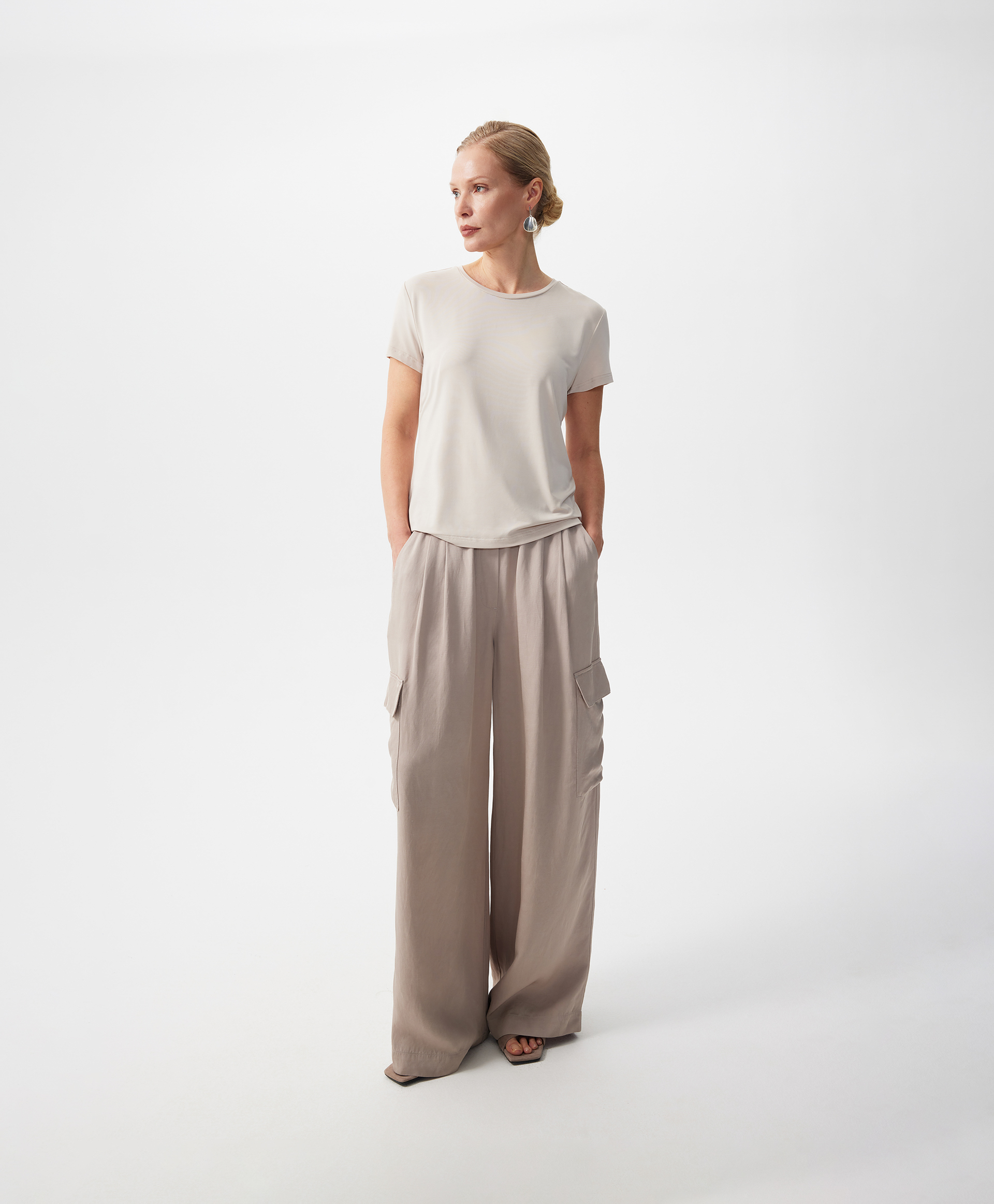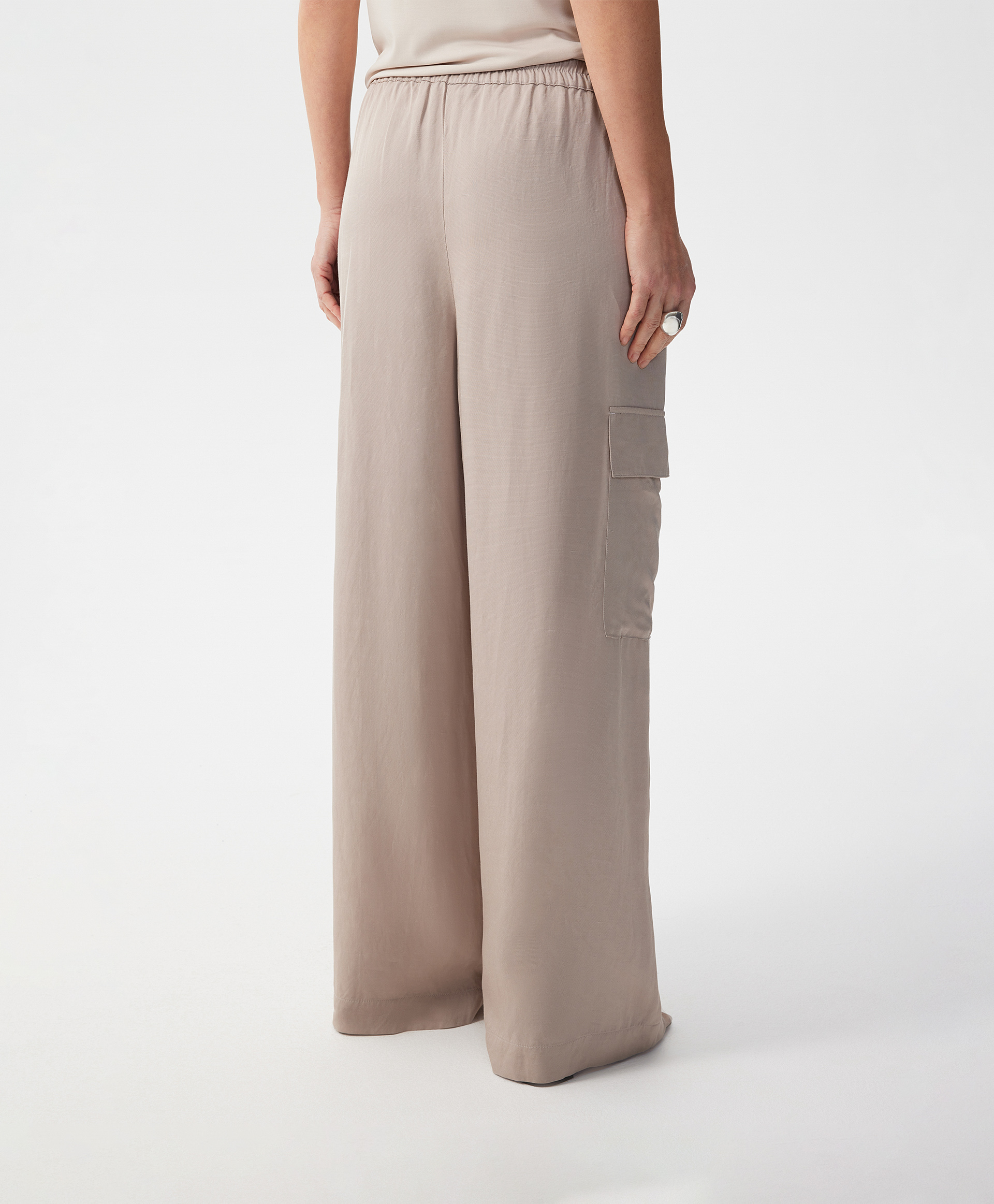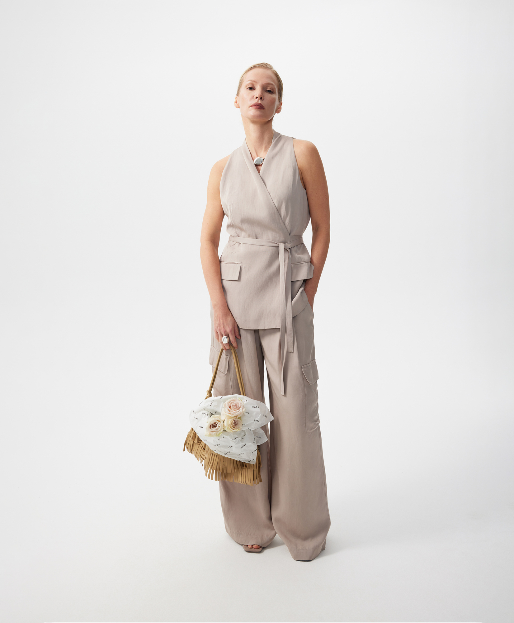 Брюки-палаццо с карманами-карго стали классикой городского стиля, позволяя формировать самые разные образы - от прогулочных до элегантных выходных. Независимо от цвета, формы, материала, в карманах-карго всегда есть нотка дерзкого приключенческого настроения, придающего любым комплектам с ними остроту, молодость, динамику. Брюки-палаццо высокой посадки выполнены из шелковистой вискозной ткани с достойным содержанием льна, образующего еле заметную узелковую структуру - свидетельство присутствия натуральных волокон. Сложный дымчатый оттенок пыльной розы, ассоциирующийся с мягкостью, уютом, покоем, поддерживает модный тренд на экологичные цвета, которые всегда выглядят дорого, сдержанно, уместны в любой ситуации. Брюки имеют удобные карманы с наклоном, а также пояс на резинке - важный функциональный элемент для комфортной носки.