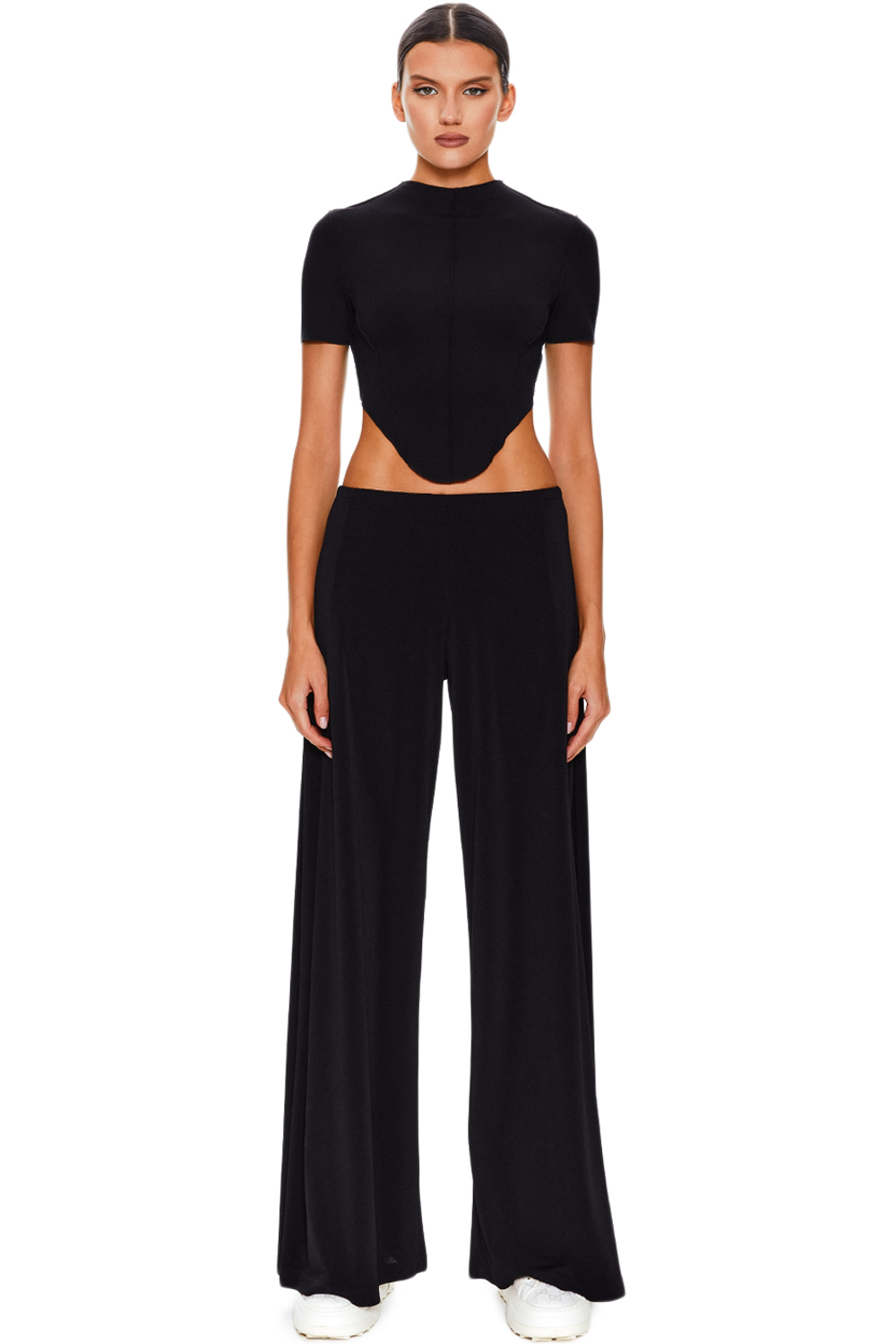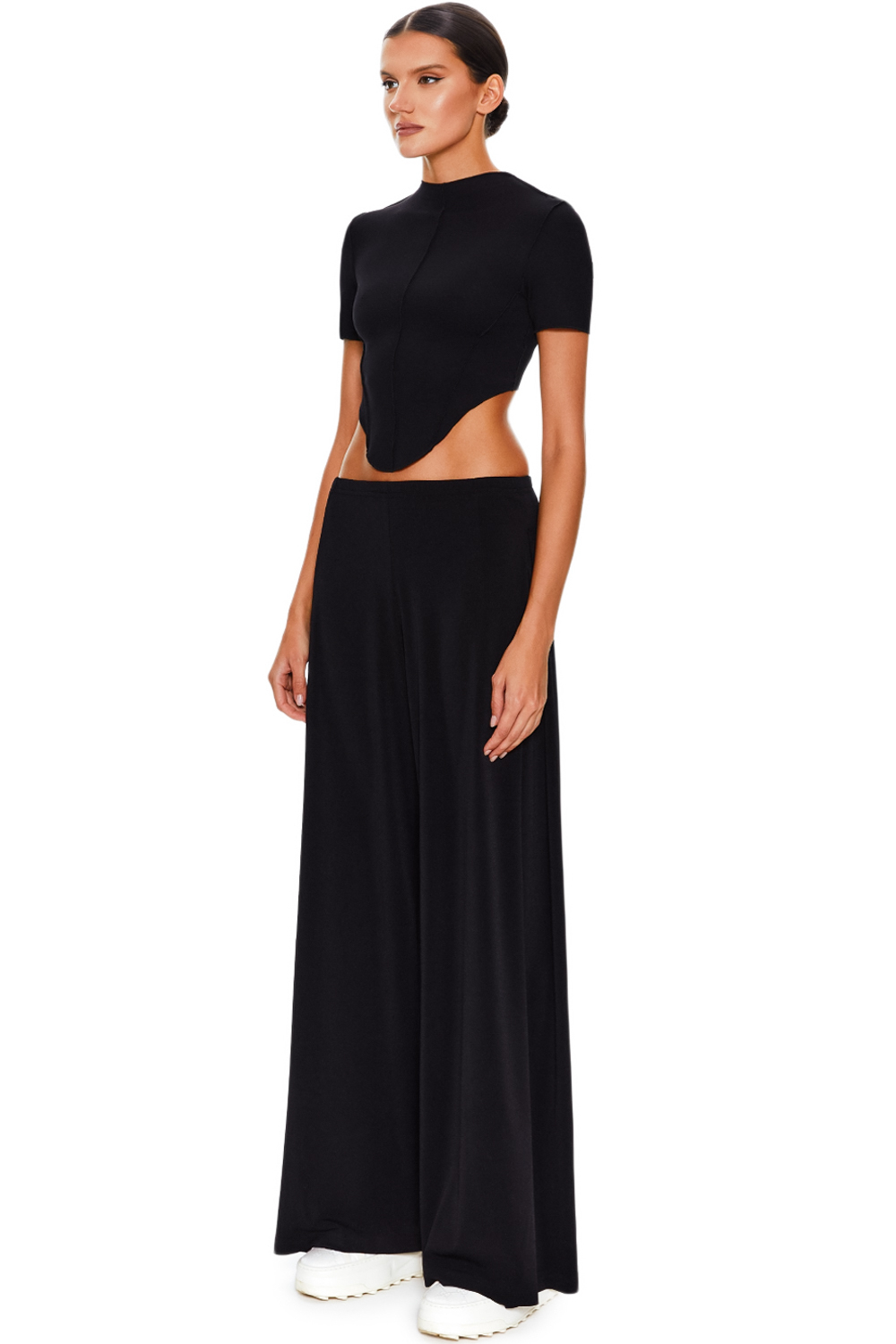 Брюки со складками — уникальное сочетание женственности и безупречного стиля. Эффектная модель, которая создаёт стройнящую вертикальную линию, визуально подчеркивая стройность силуэта. Брюки изготовлены из лёгкой, струящейся, немнущейся вискозной ткани, отличаются подчеркнуто низкой посадкой, контрастирующей со свободным кроем брюк и складками по бокам. Эластичный пояс, длина макси и свободный крой обеспечивают абсолютный комфорт. Универсальные брюки можно носить с кроссовками и топом для повседневного дневного образа или стилизовать с туфлями на шпильке и кожаным топом для вечернего.