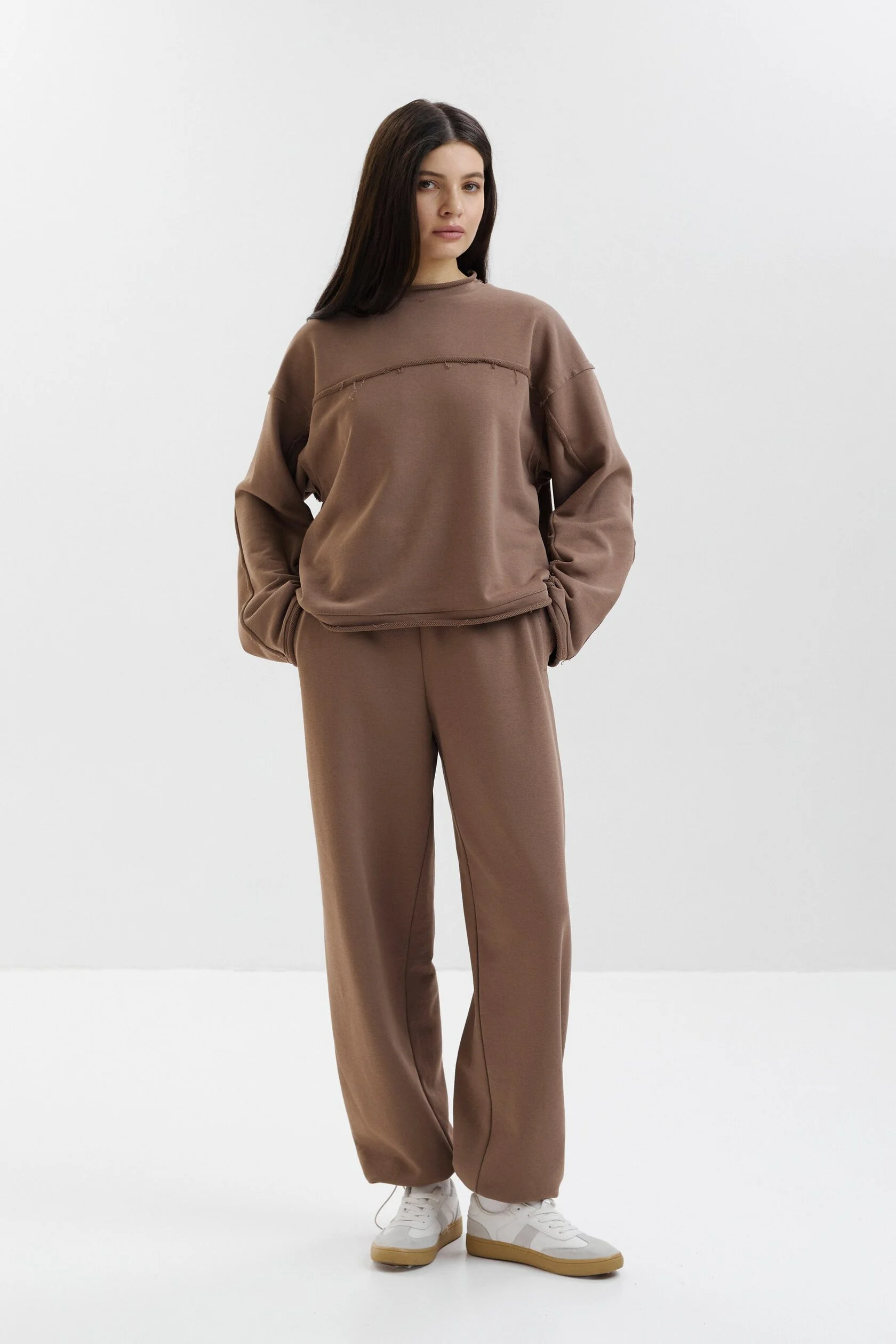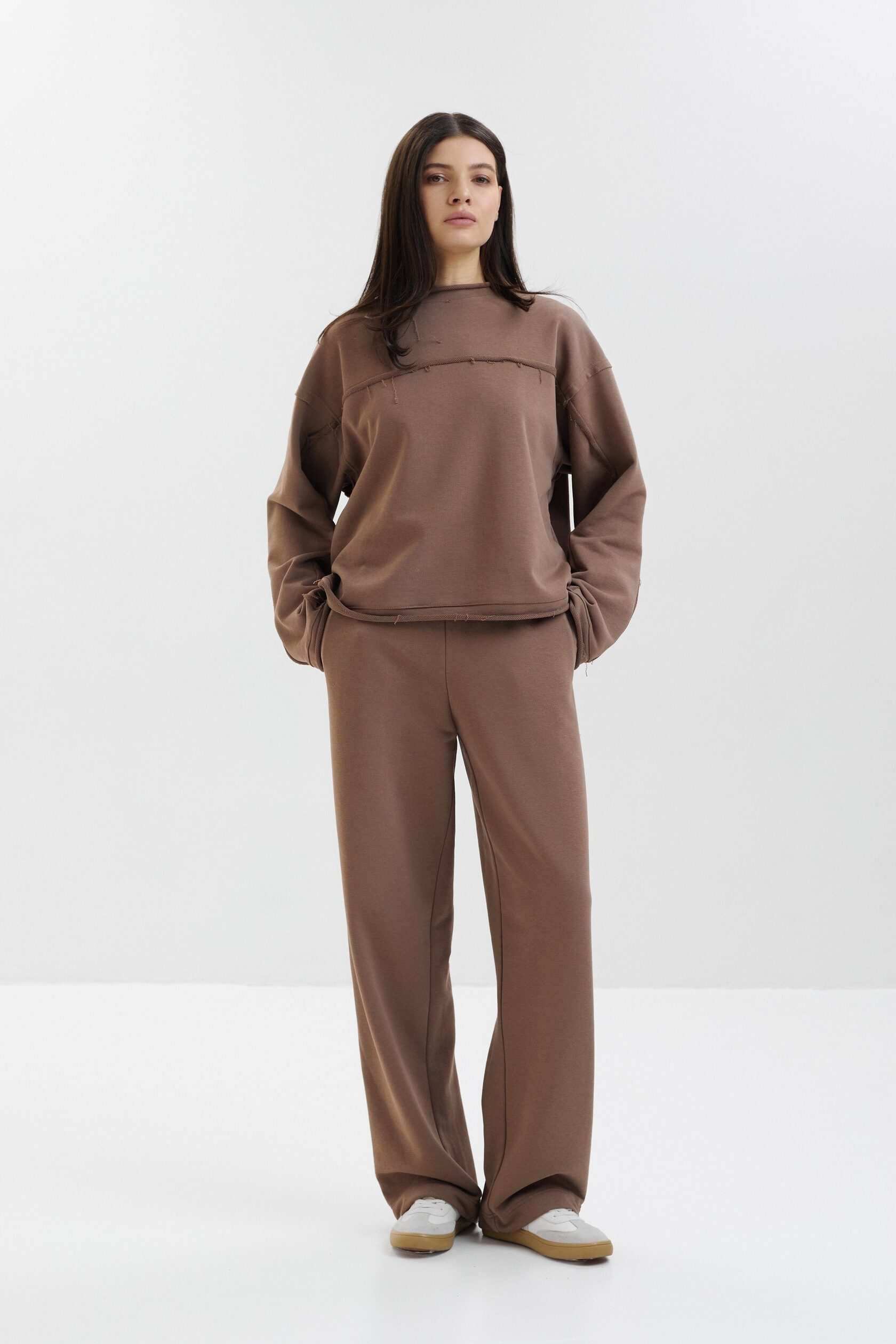 Рекомендуем сочетать брюки со свитшотом из той же коллекции или как самостоятельное изделие с футболками, топами.