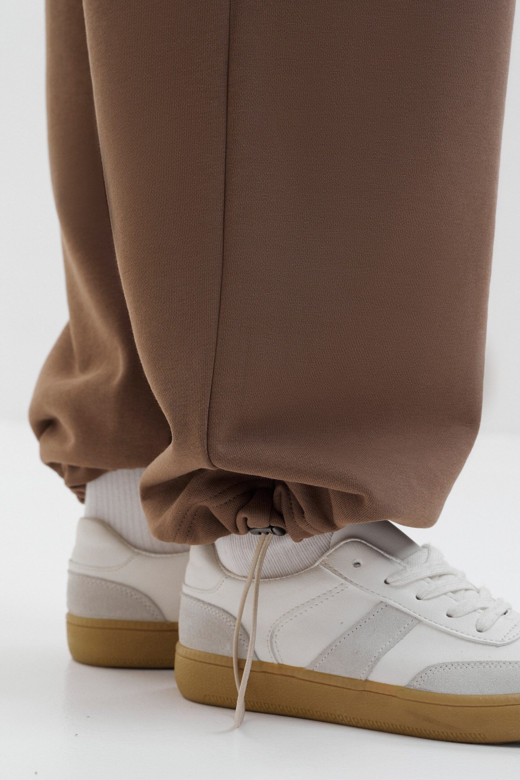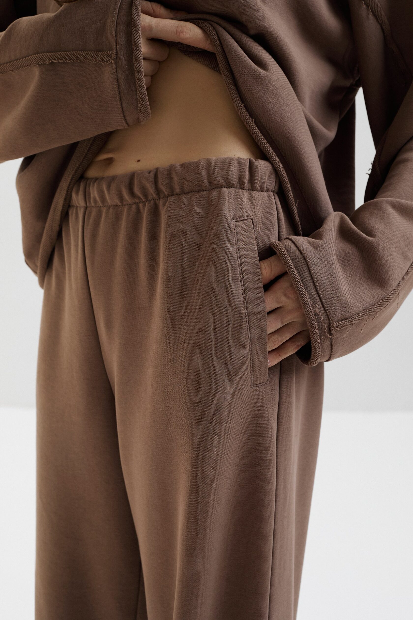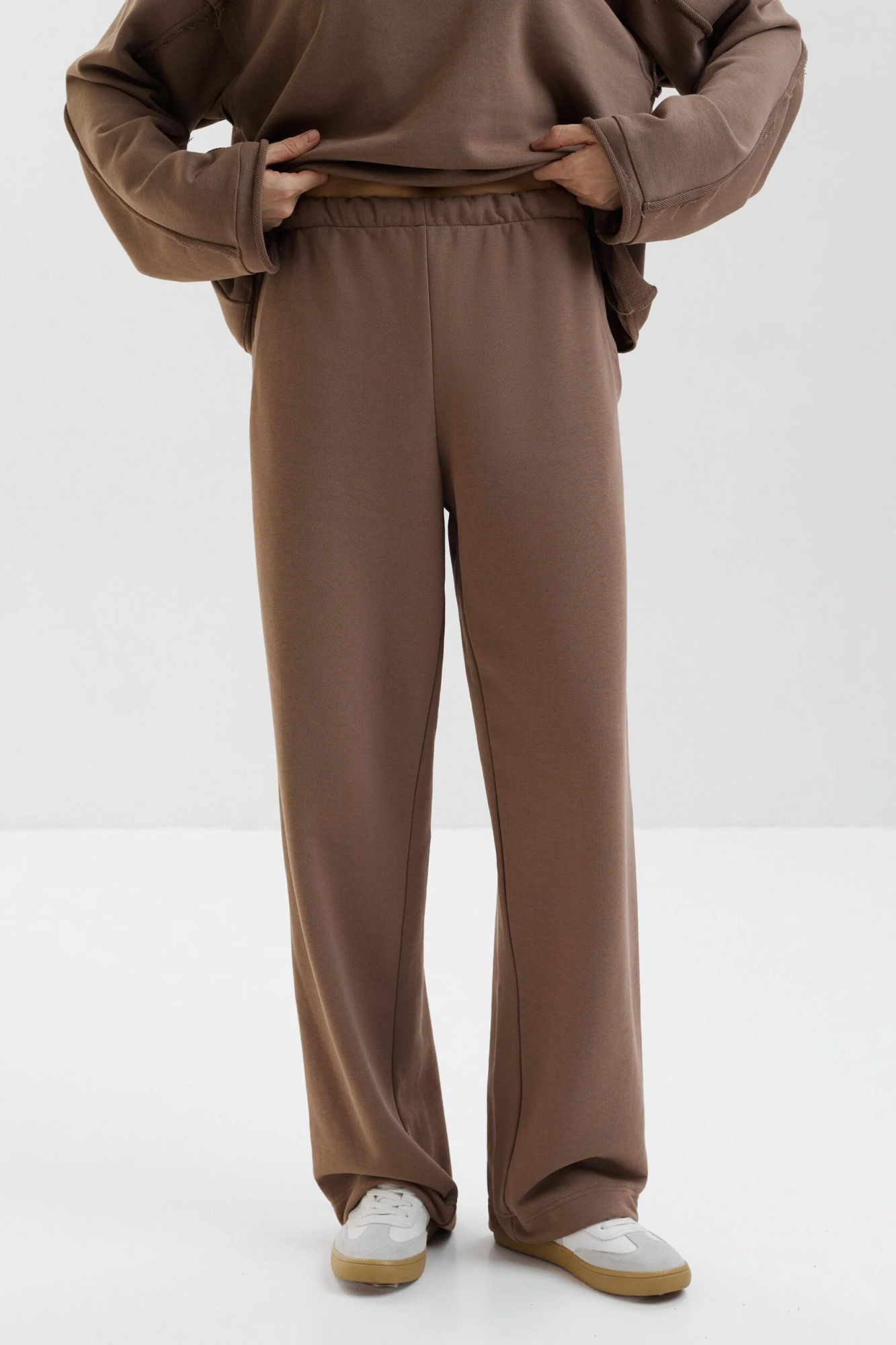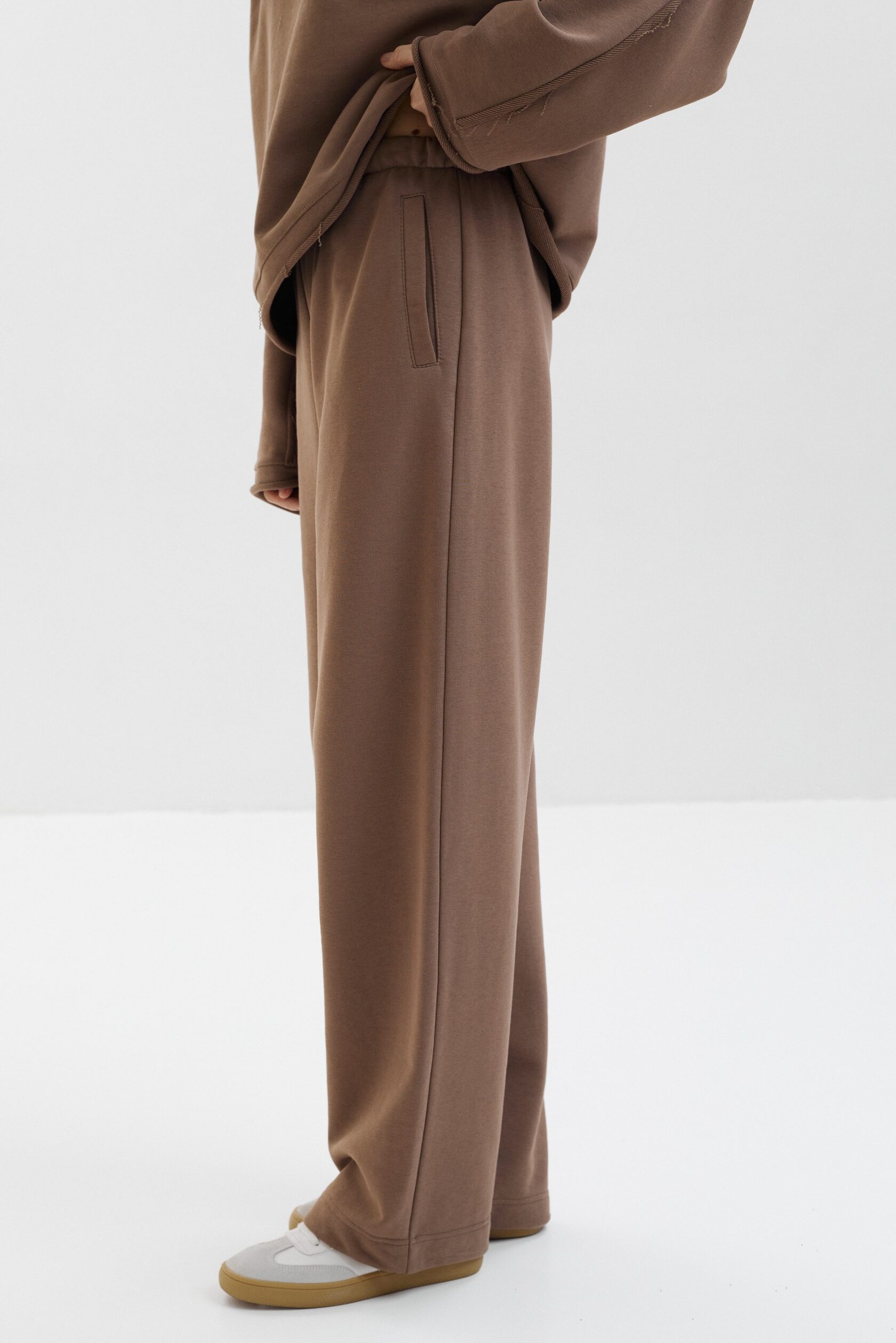Прямые брюки из мягкого футера. Эластичная резинка на талии, вместительные карманы и свободный крой обеспечивают комфортную носку каждый день, а благодаря кулиске по низу можно регулировать длину и объем брюк.