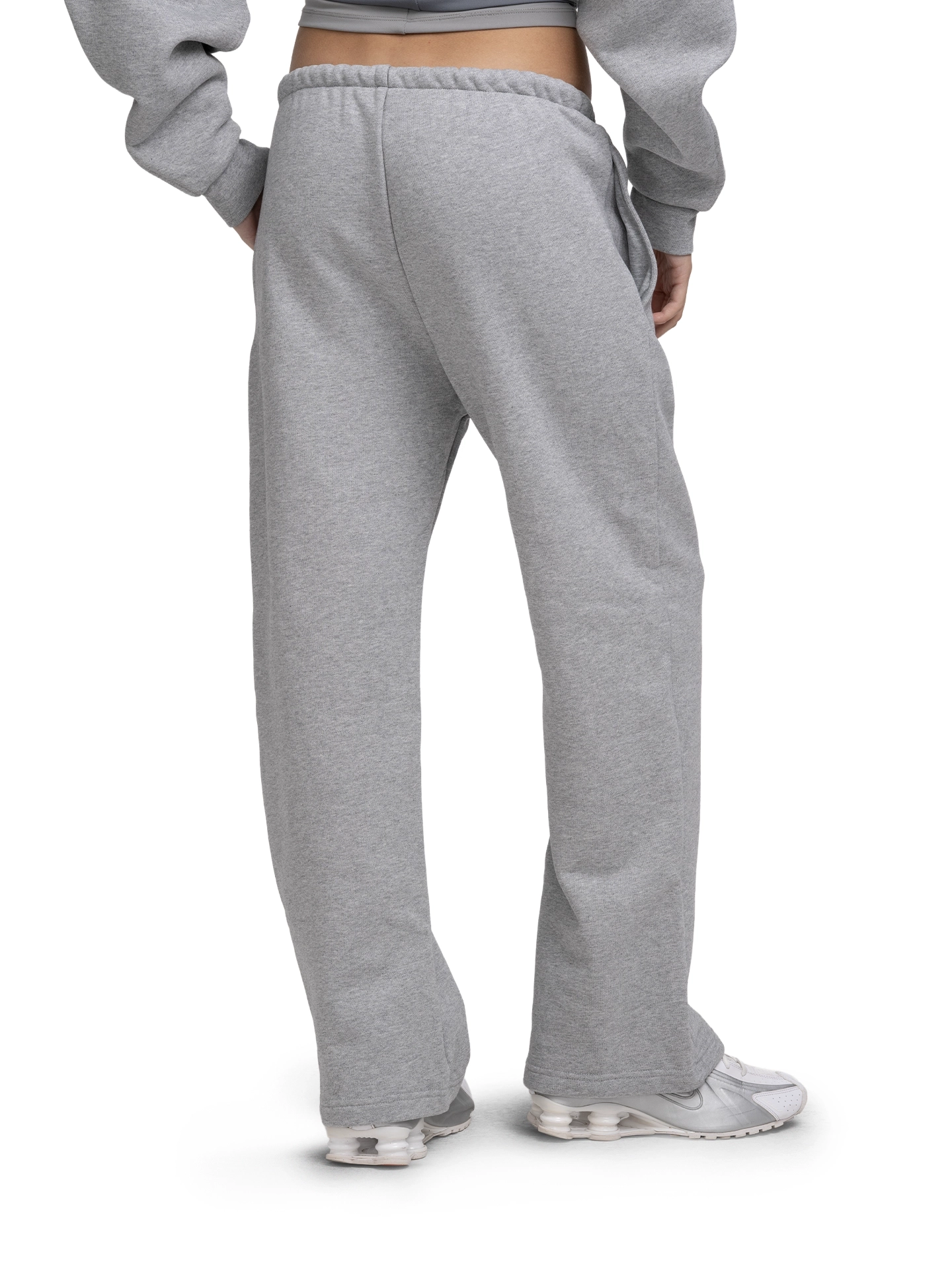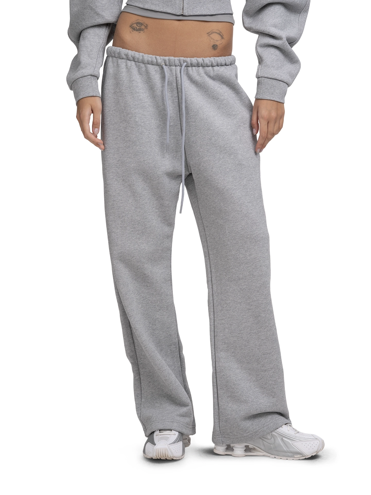 Брюки на низкой посадке из премиального футера (плотность 650 г/м², 16 ниток) с удобной резинкой на талии, регулируемыми шнурками и двумя вместительными внешними карманами.