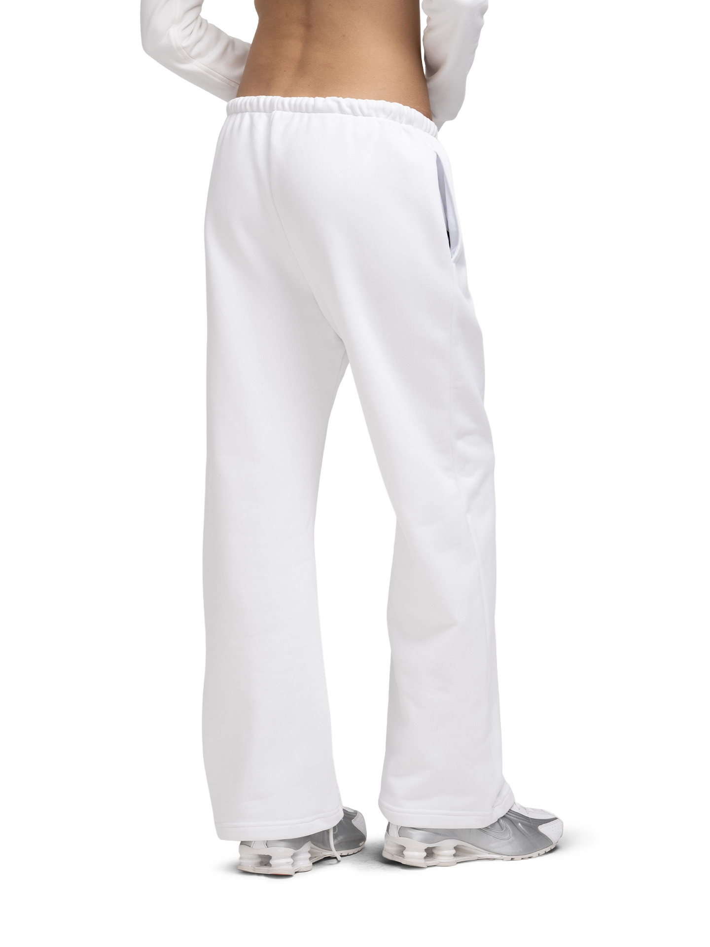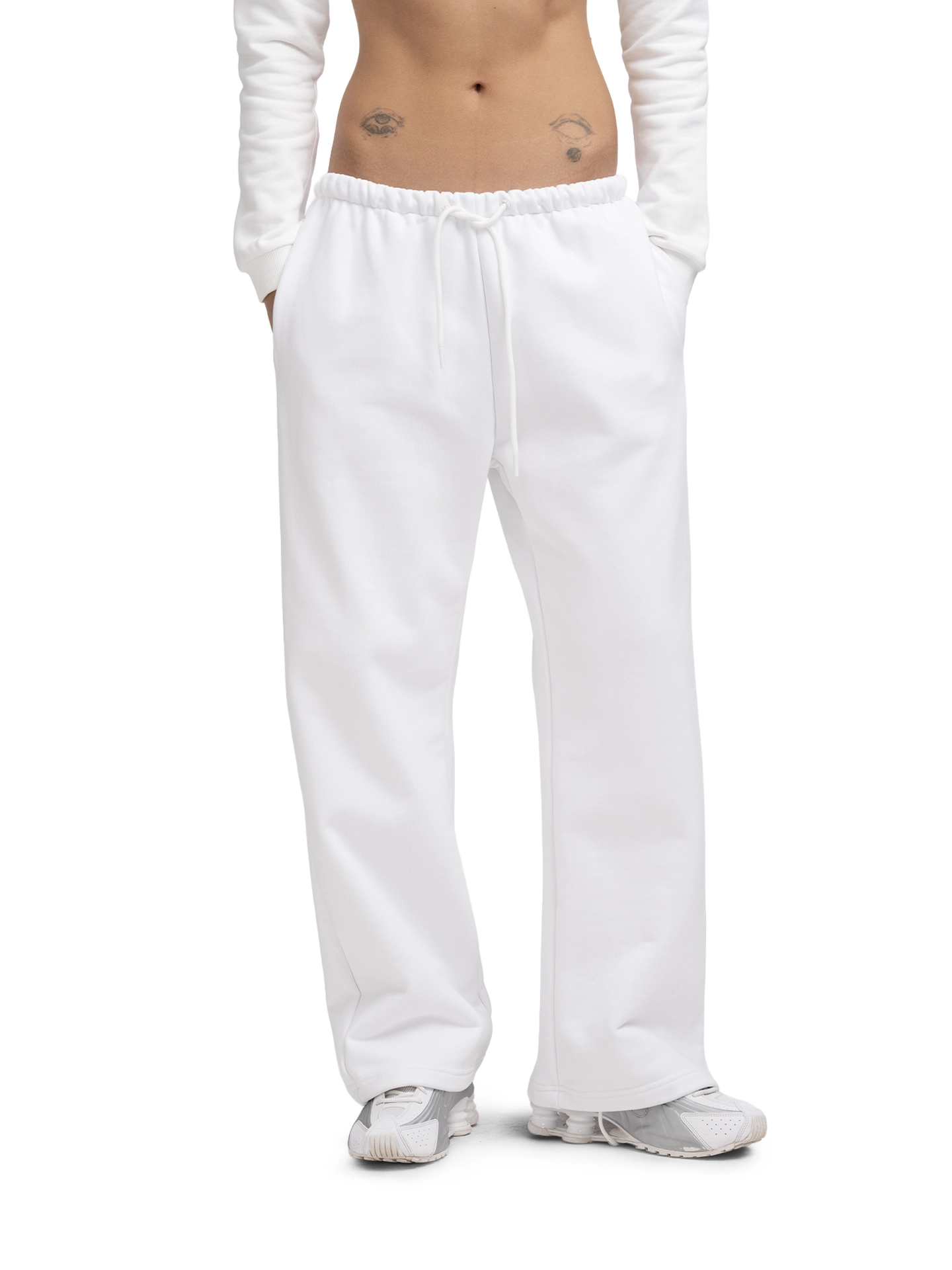 Брюки на низкой посадке из премиального футера (плотность 650 г/м², 16 ниток) с удобной резинкой на талии, регулируемыми шнурками и двумя вместительными внешними карманами.