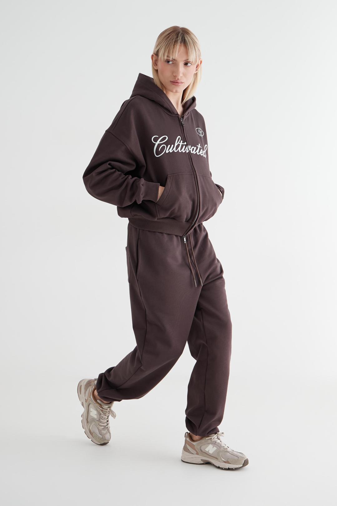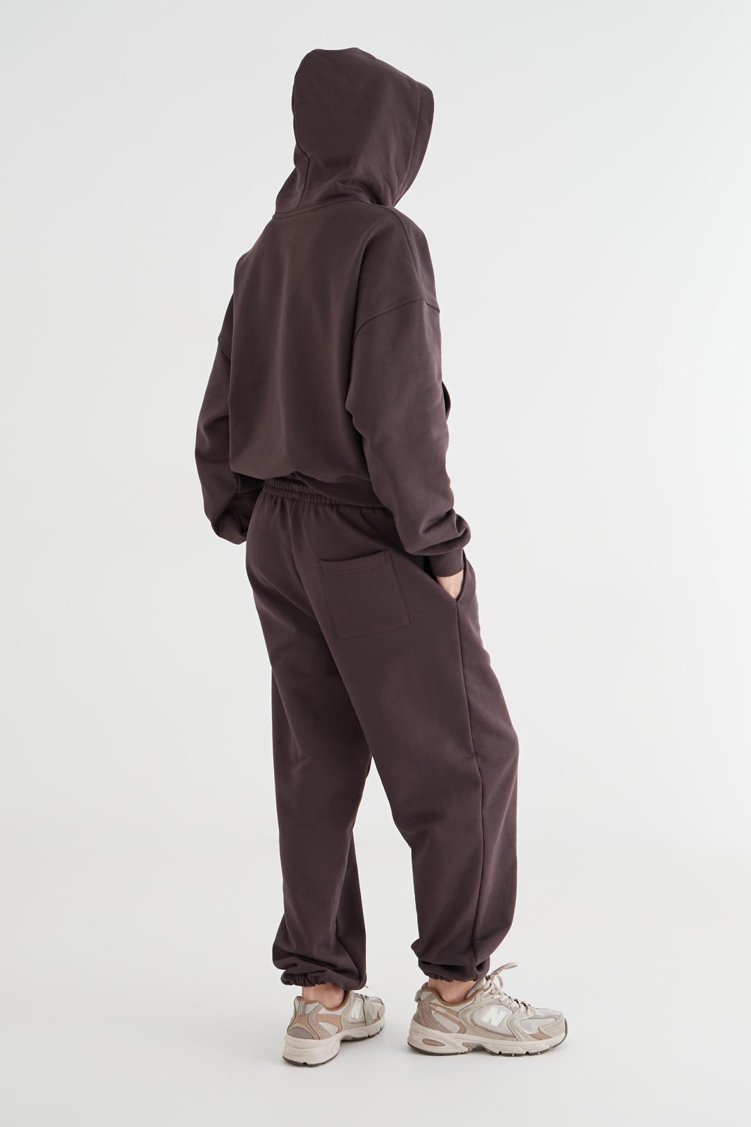 Это та базовая вещь, которая сочетается со всем. Джоггеры cоставляют костюм с худи на молнии из коллекции.