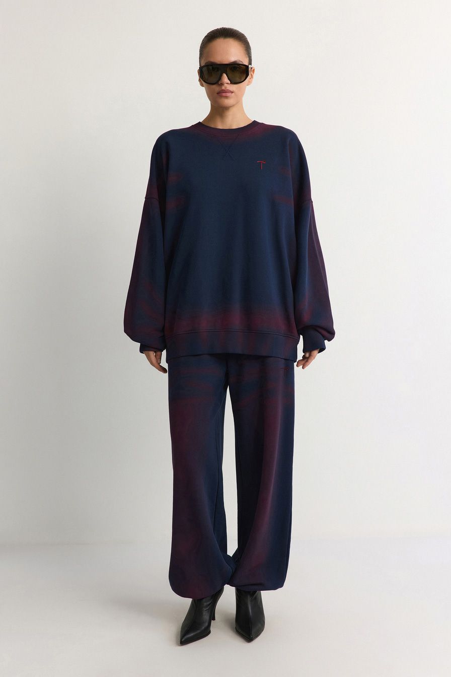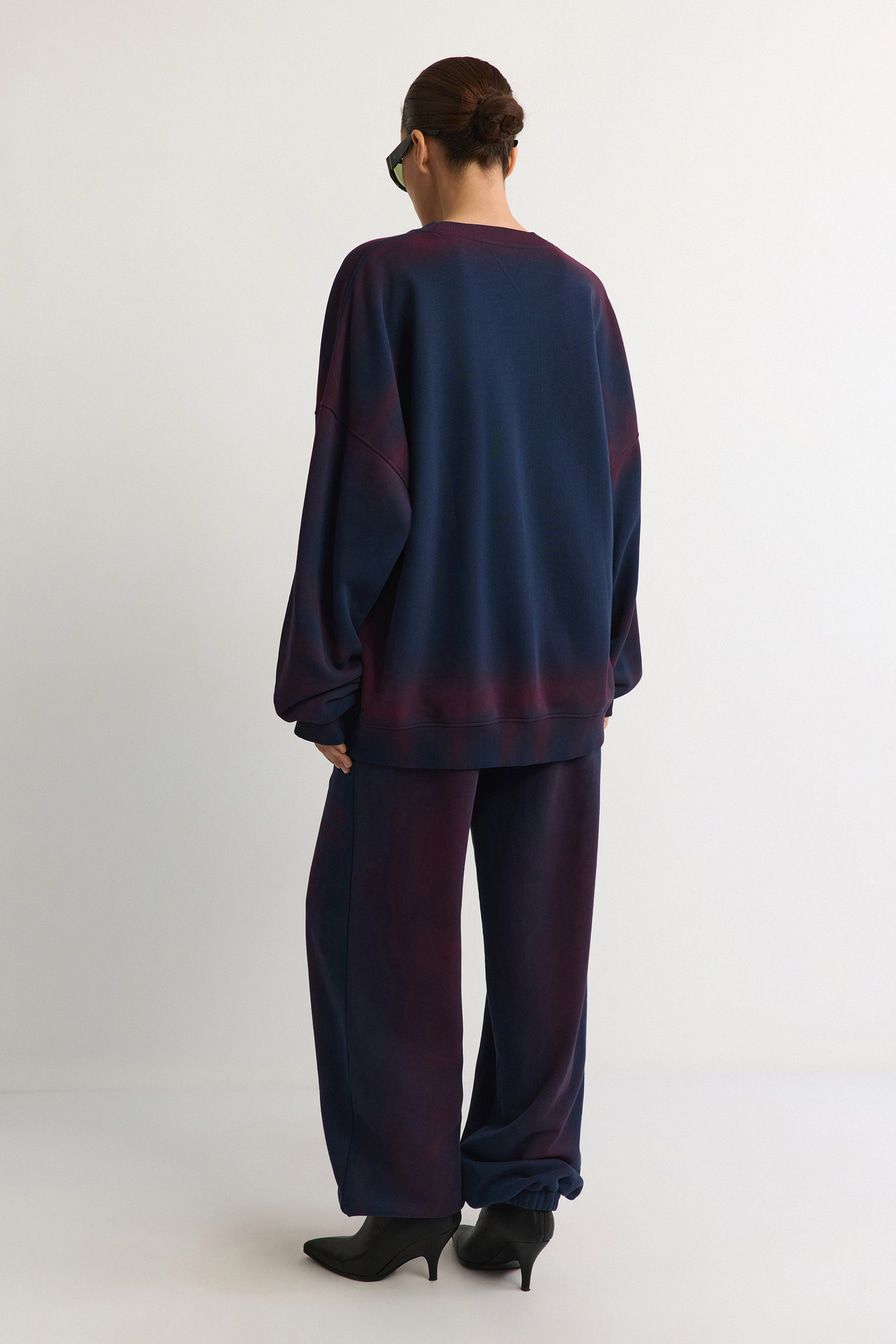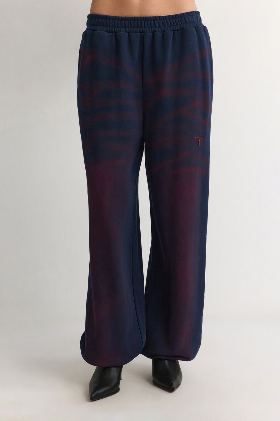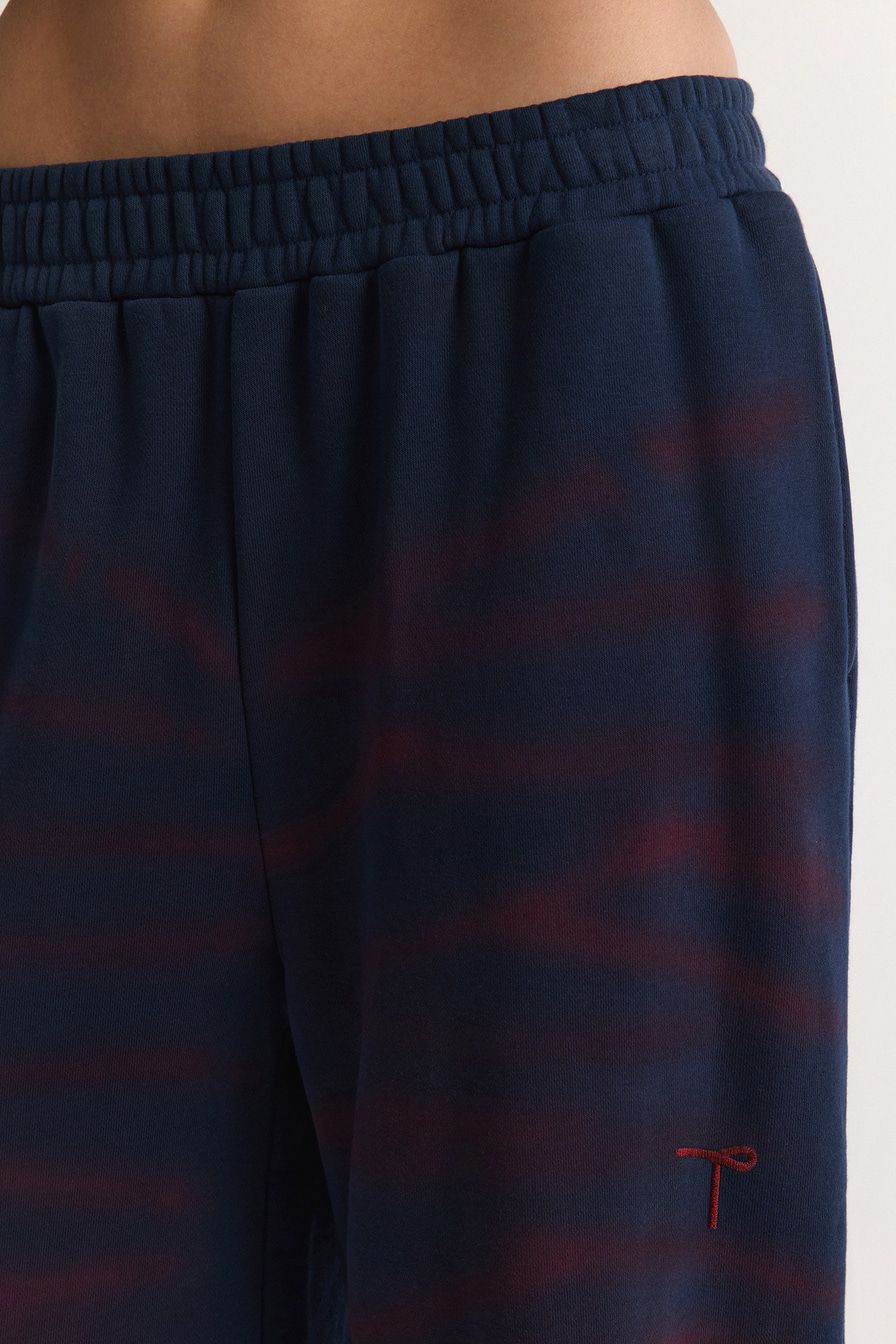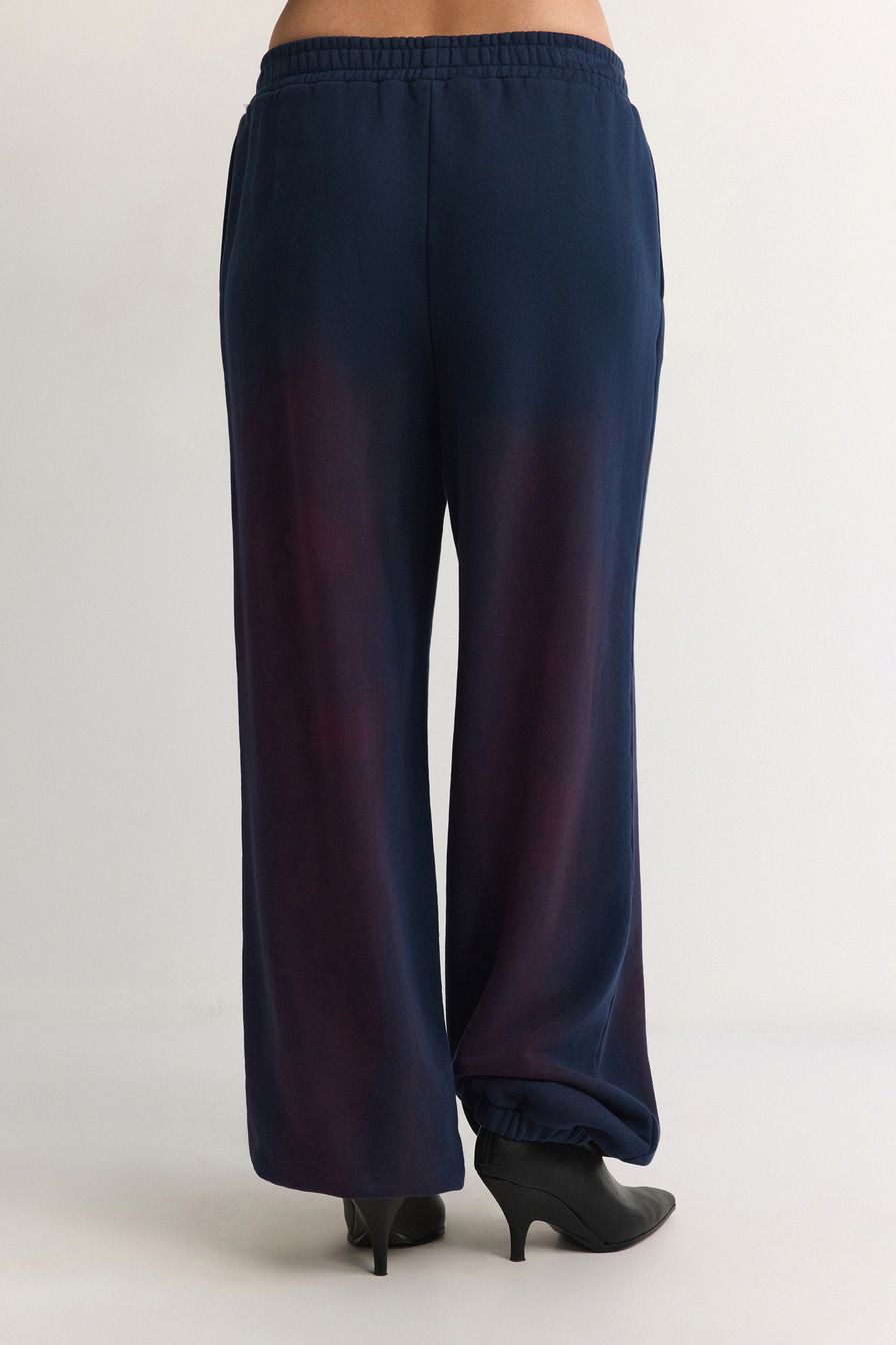 Темно-синие брюки-джоггеры с контрастным спрей-эффектом выполнены из 100% хлопка.