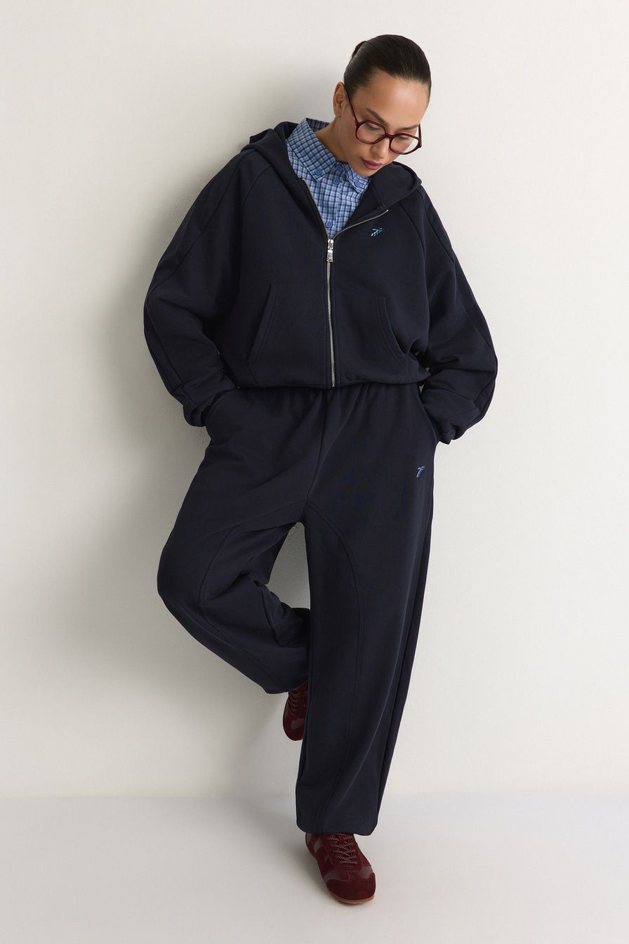 «Для спортивного обзраза сочетайте брюки с принтованной футболкой, худи из комплекта и кожаными кроссовками».