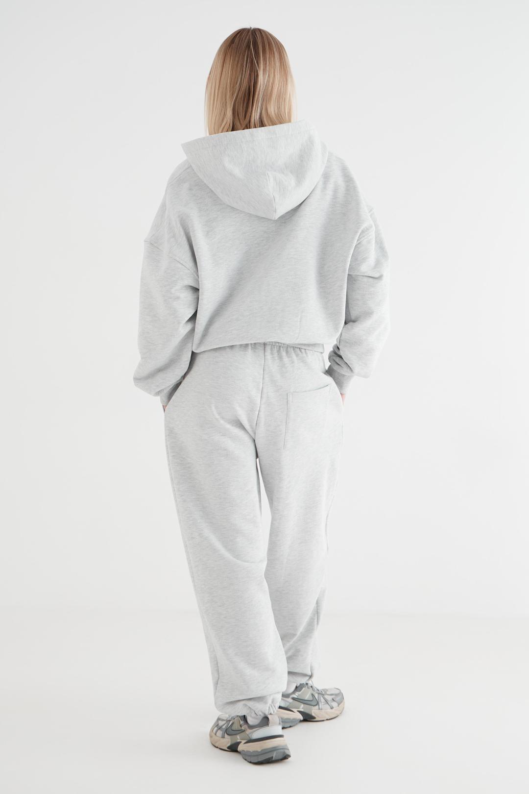 Это та базовая вещь, которая сочетается со всем. Джоггеры cоставляют костюм с худи на молнии из коллекции.