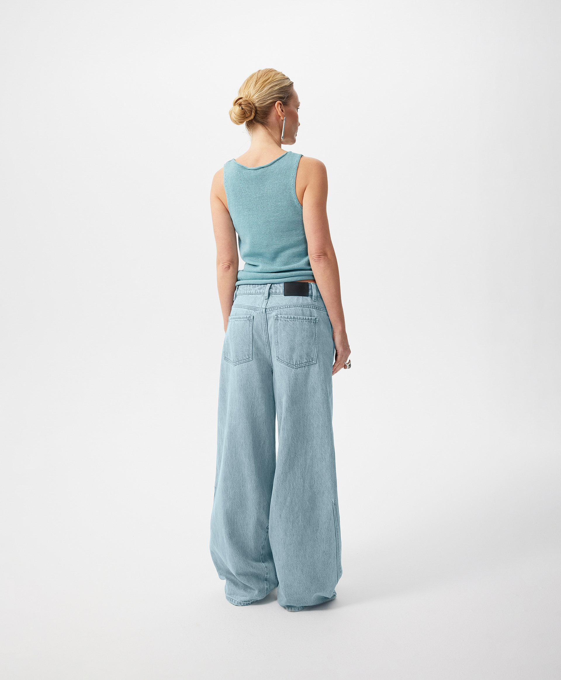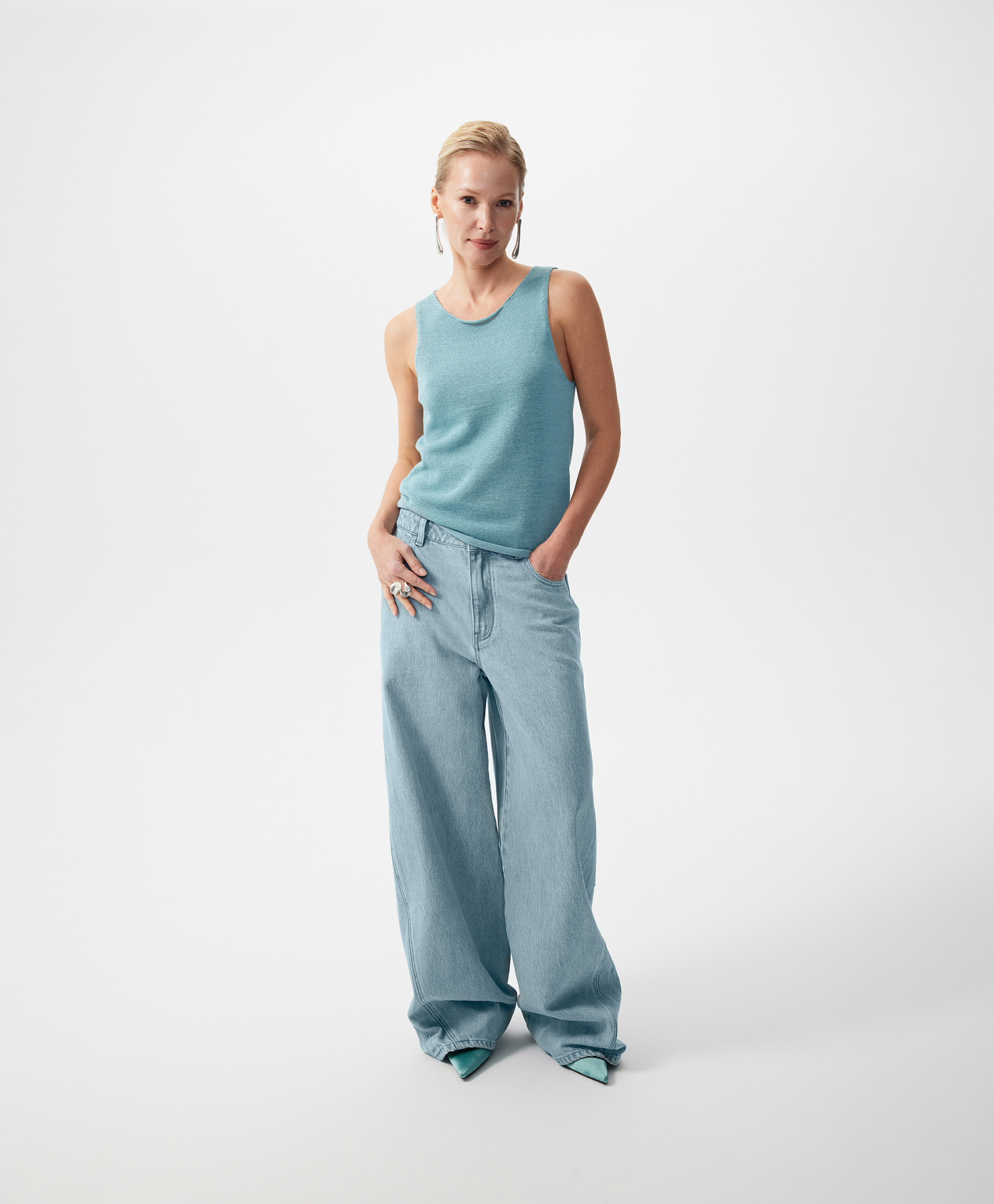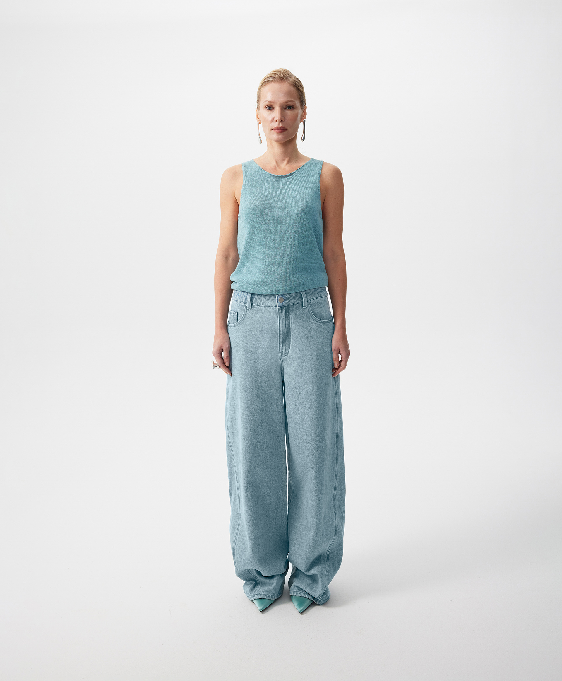 Голубые джинсы-багги средней посадки - непременный атрибут стильных расслабленных весенних образов женщины. Широкие мешковатые джинсы с небольшим заужением к низу придадут любому комплекту с ними свободу и непринужденность городского стиля, отразят остроту современных трендов, сформируют динамичный аутфит в ногу со временем, подчеркнут энергию и драйв молодости, требующей модных экспериментов в поиске самовыражения. Джинсы выполнены из плотного формоустойчивого денима с равномерной варкой по всей длине и деталям. Изюминка модели - интересный спиралевидный крой, акцентирующий внимание на фигурном боковом шве. Джинсы имеют традиционные 5 карманов, застегиваются на молнию и пуговицу-болт.