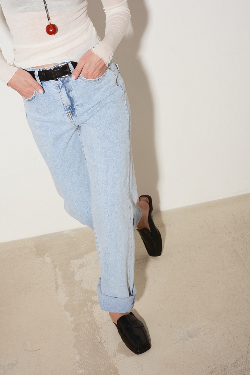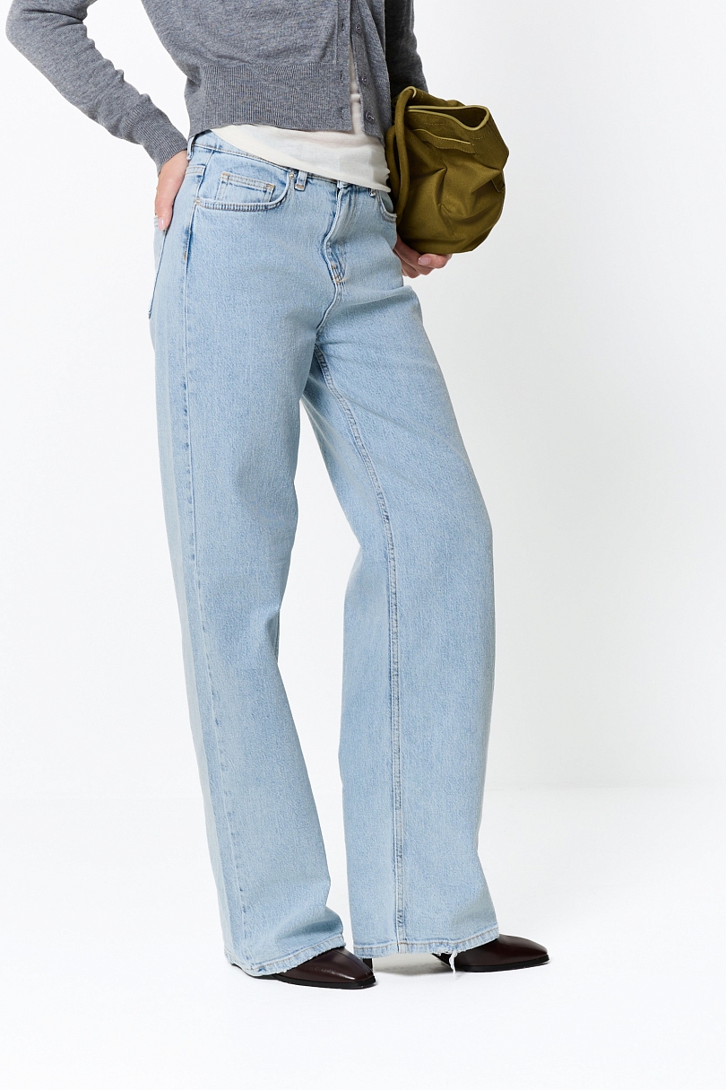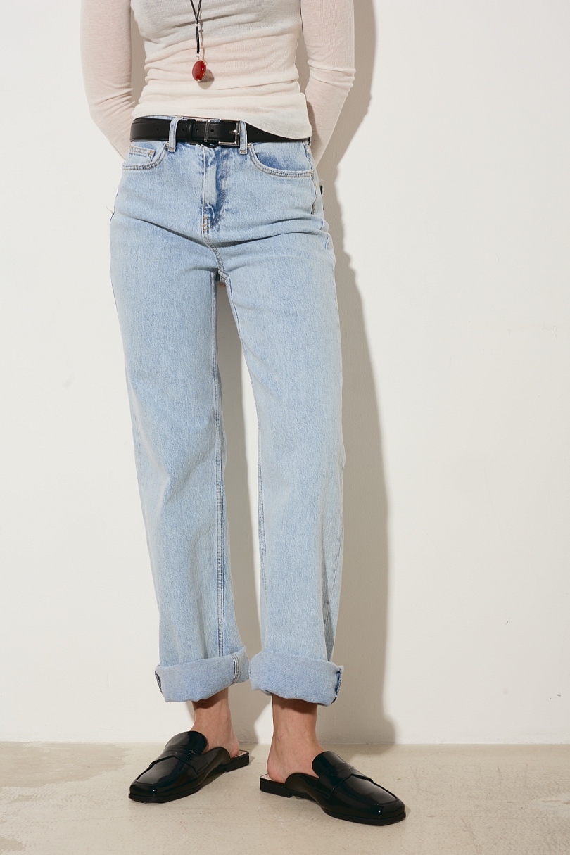 Джинсы прямого кроя с завышенной посадкой голубого цвета.