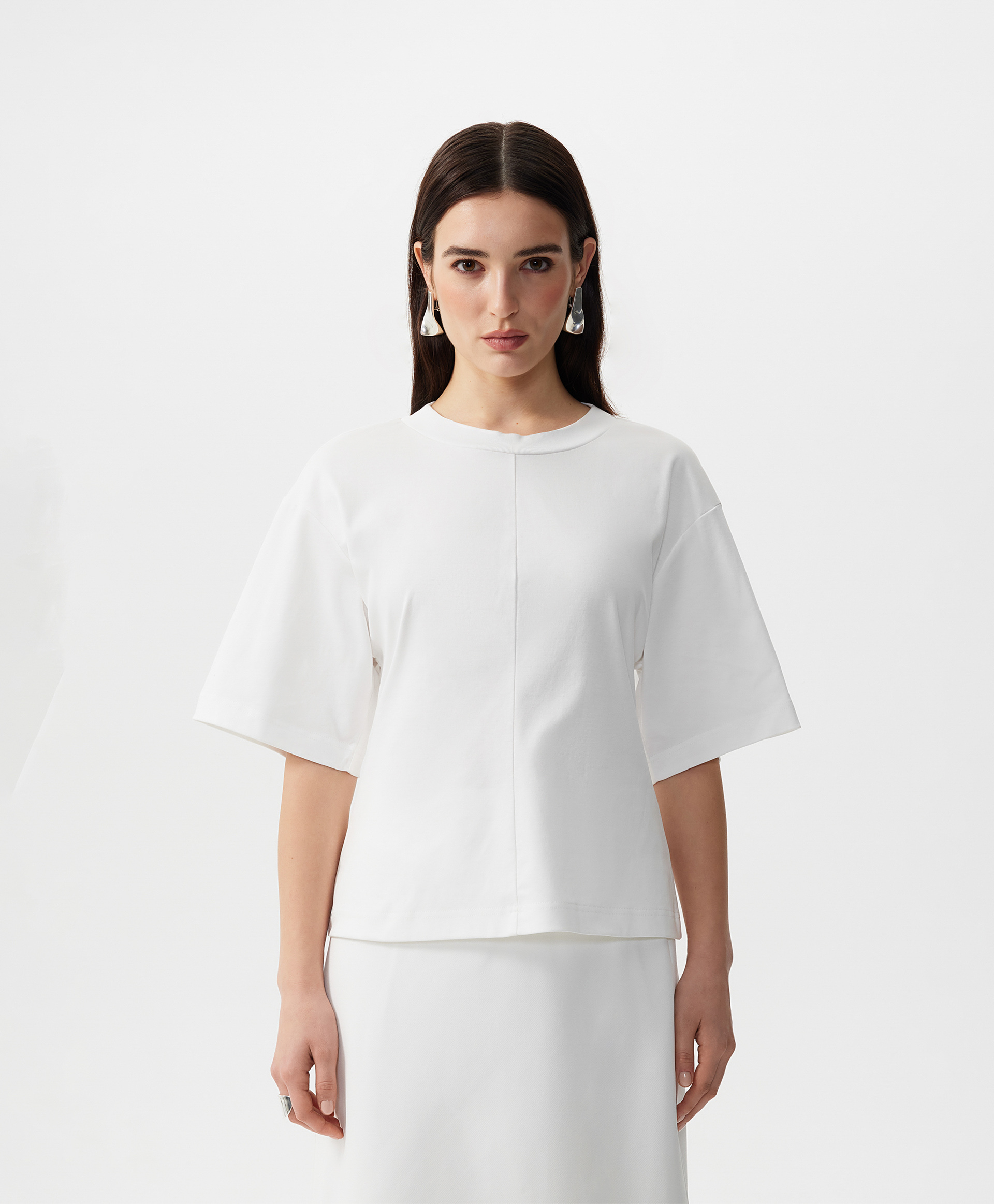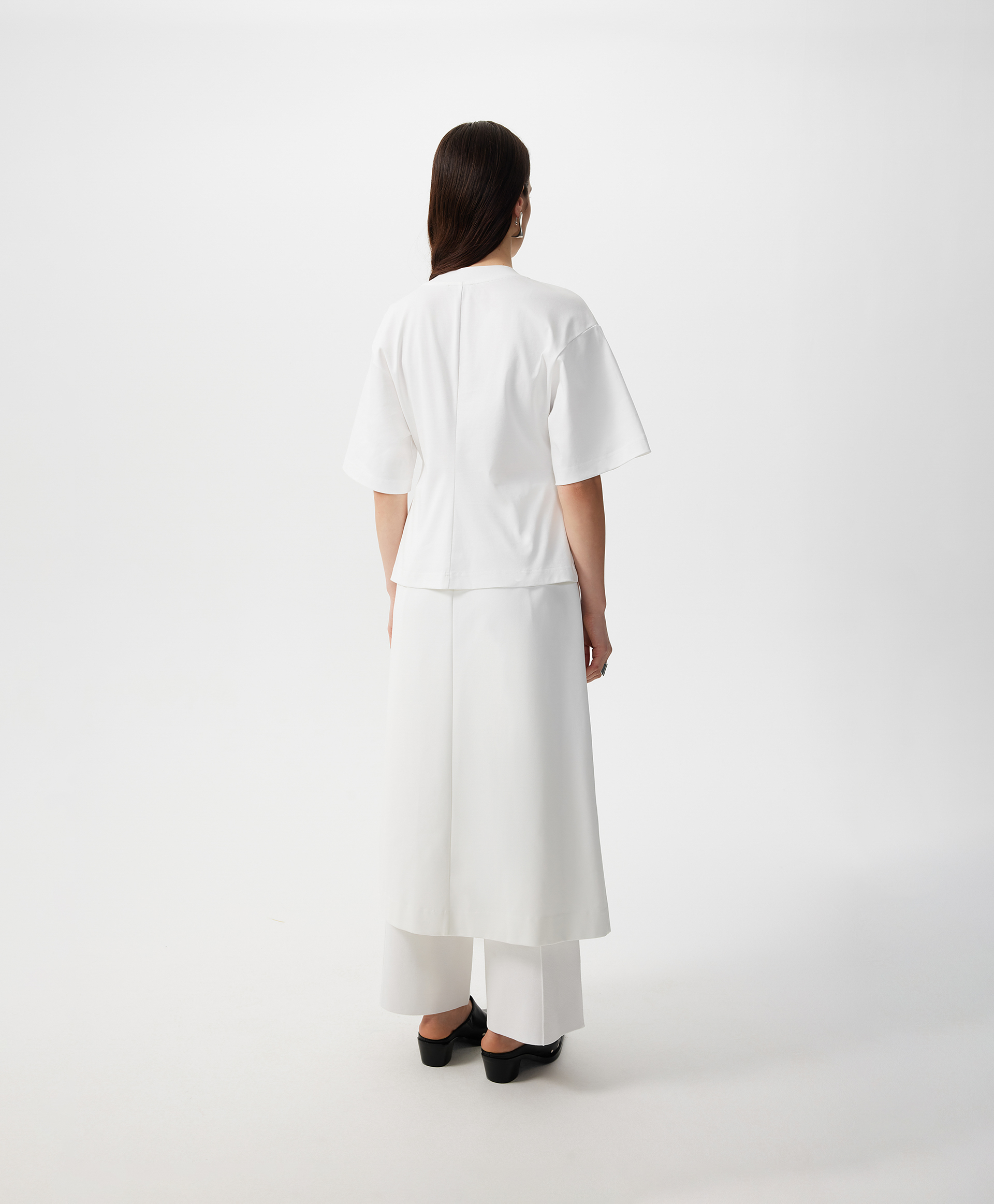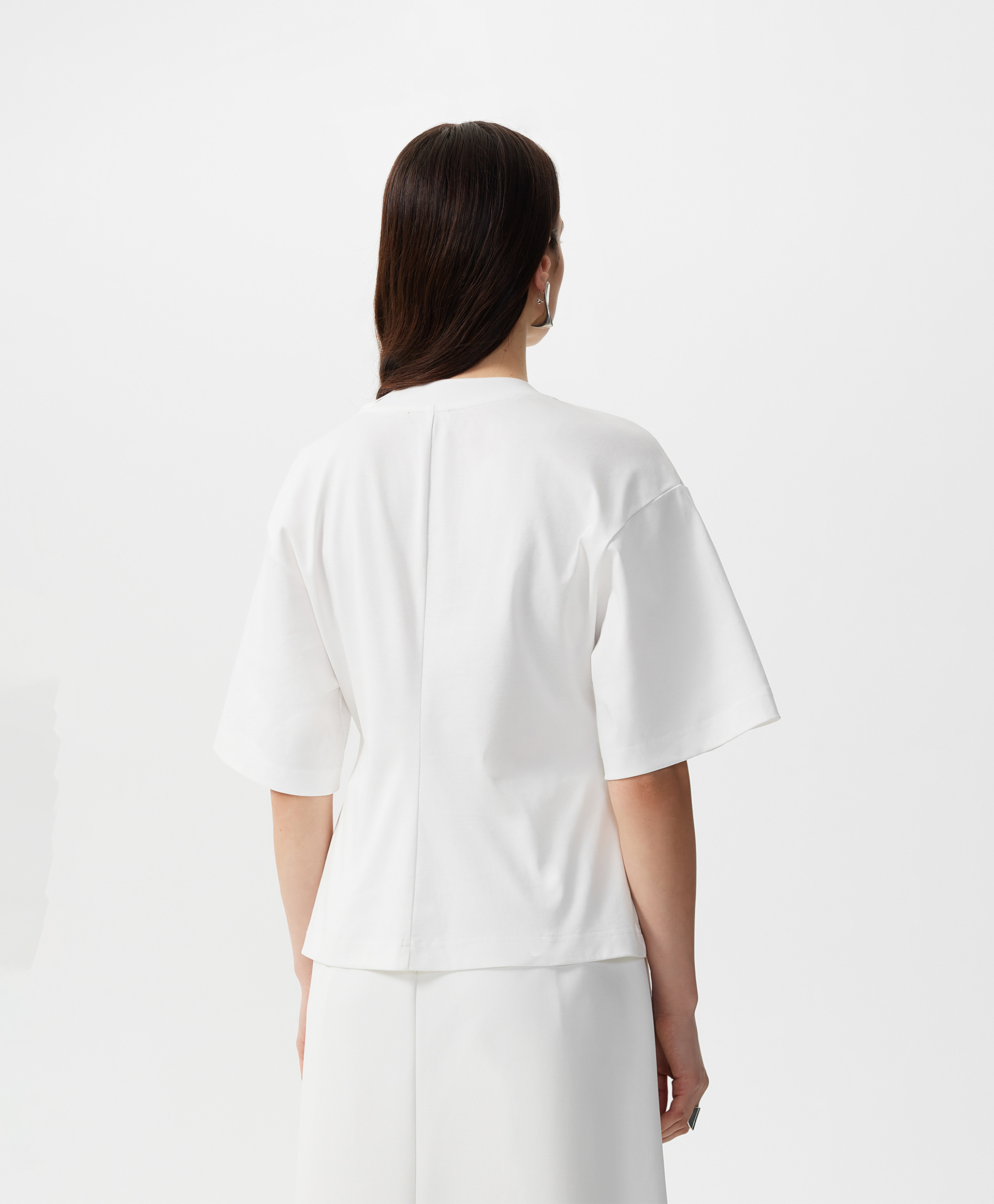 Новая форма делает базовую вещь гардероба элегантным акцентом образа! Футболка GLVR приталенного силуэта - не банального кроя по фигуре, а выведенного посредством модного архитектурного кроя с вертикальным членением полочки и спинки по центру - позволит придать любому комплекту с ней свежесть, женственность, утонченность. Спущенная линия плеч способствует комфорту и свободе движений. Шелковистый формоустойчивый хлопковый интерлок создает приятный тактильный контакт, делает футболку стильной, привлекательной, дорогой по восприятию.