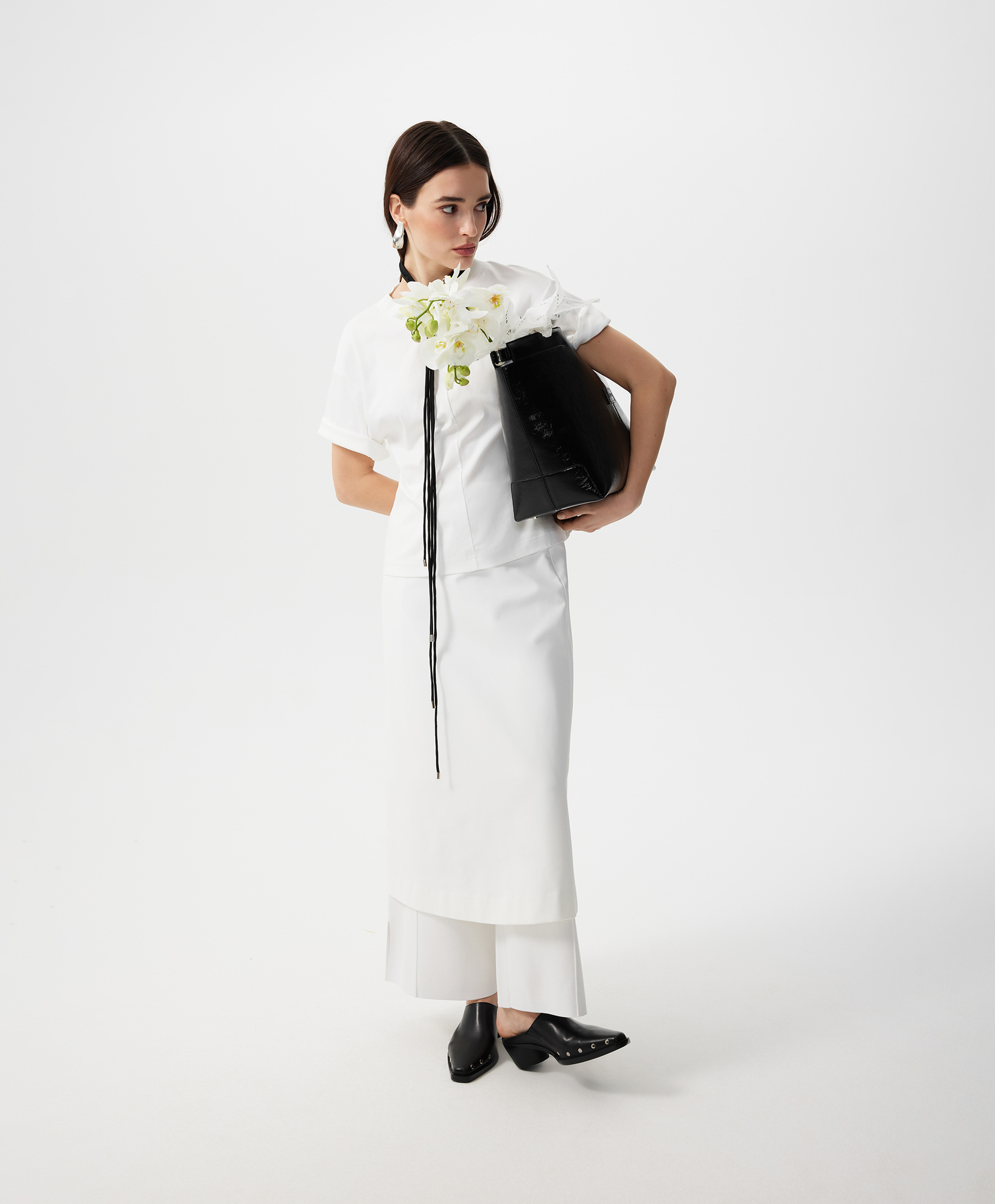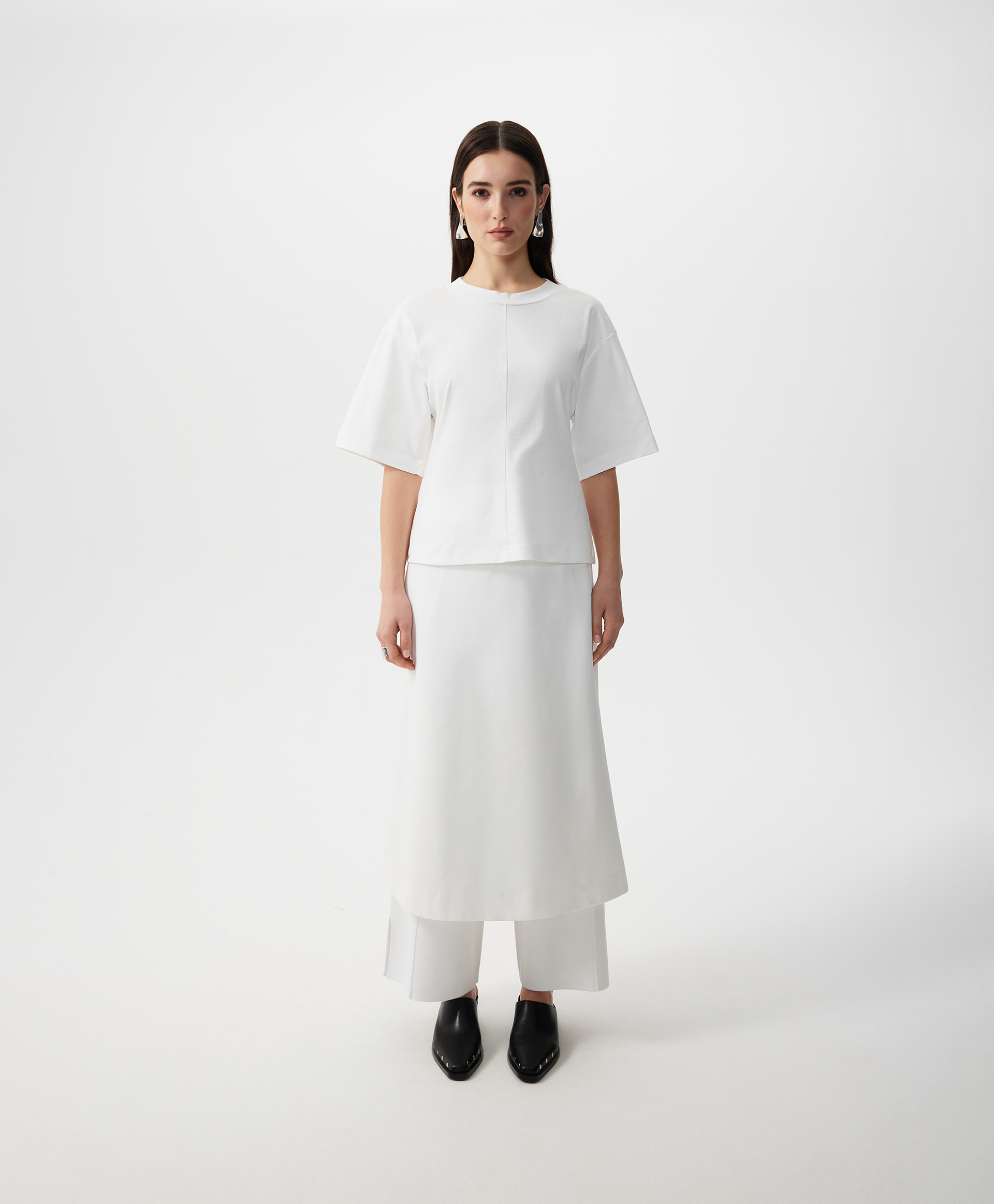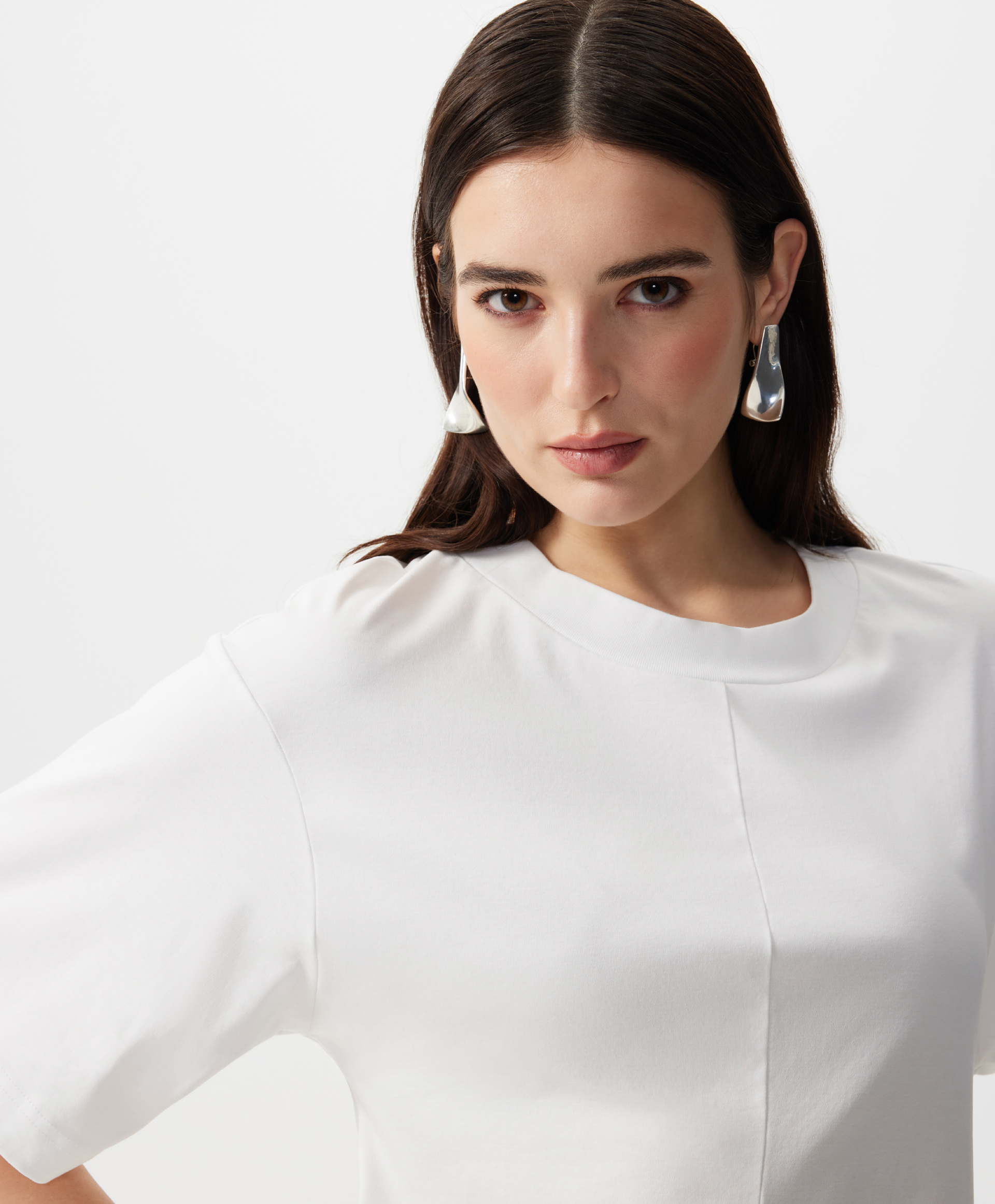 Новая форма делает базовую вещь гардероба элегантным акцентом образа! Футболка GLVR приталенного силуэта - не банального кроя по фигуре, а выведенного посредством модного архитектурного кроя с вертикальным членением полочки и спинки по центру - позволит придать любому комплекту с ней свежесть, женственность, утонченность. Спущенная линия плеч способствует комфорту и свободе движений. Шелковистый формоустойчивый хлопковый интерлок создает приятный тактильный контакт, делает футболку стильной, привлекательной, дорогой по восприятию.