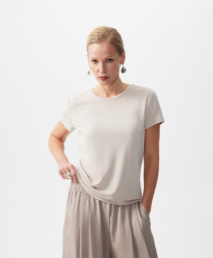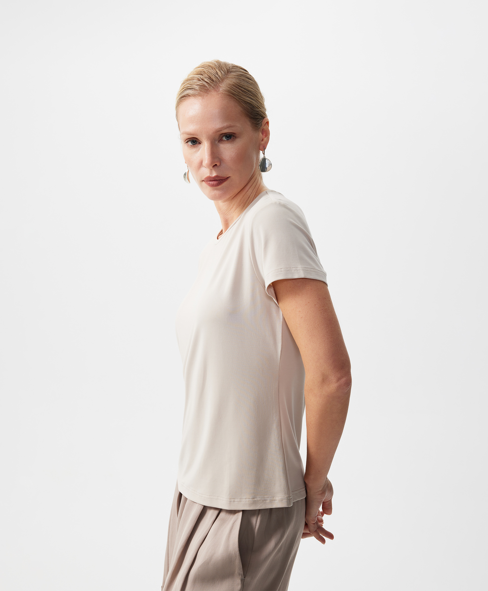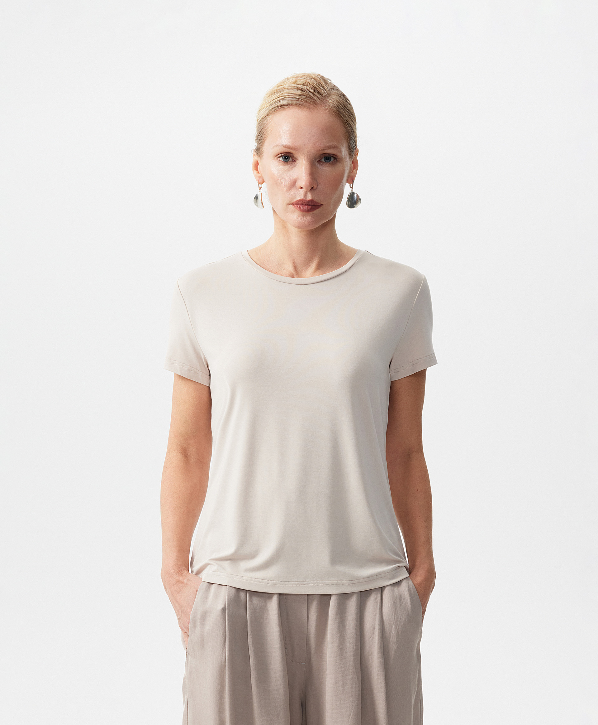 Футболка прилегающего силуэта - отличная инвестиция в качество, стиль, возможности комбинаторики. Выполненная из мягчайшего трикотажного полотна на основе вискозы с нейлоном и спандексом, мягкая, пластичная, приятная на ощупь, футболка с коротким рукавом напомнит, что тренды приходят и уходят, а качественная база остается неизменной, служа долгие годы. Она будет прекрасным единичным изделием в жаркий день в комплекте с юбкой, брюками, шортами, а также безупречным первым слоем в сочетании с пиджаком, кардиганом, блузкой. В любом случае, она подарит тактильное удовольствие, став лучшей базовой вещью элегантного женского гардероба.