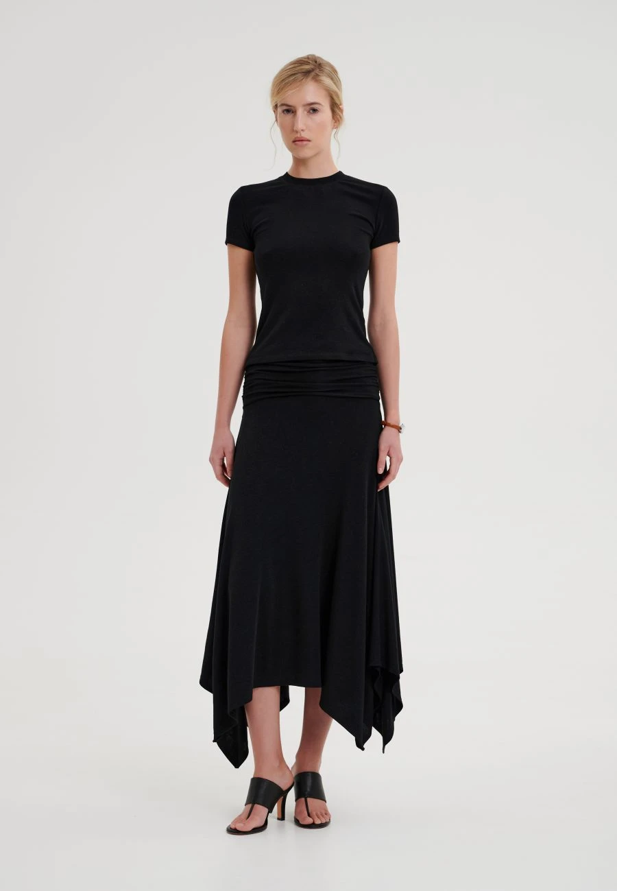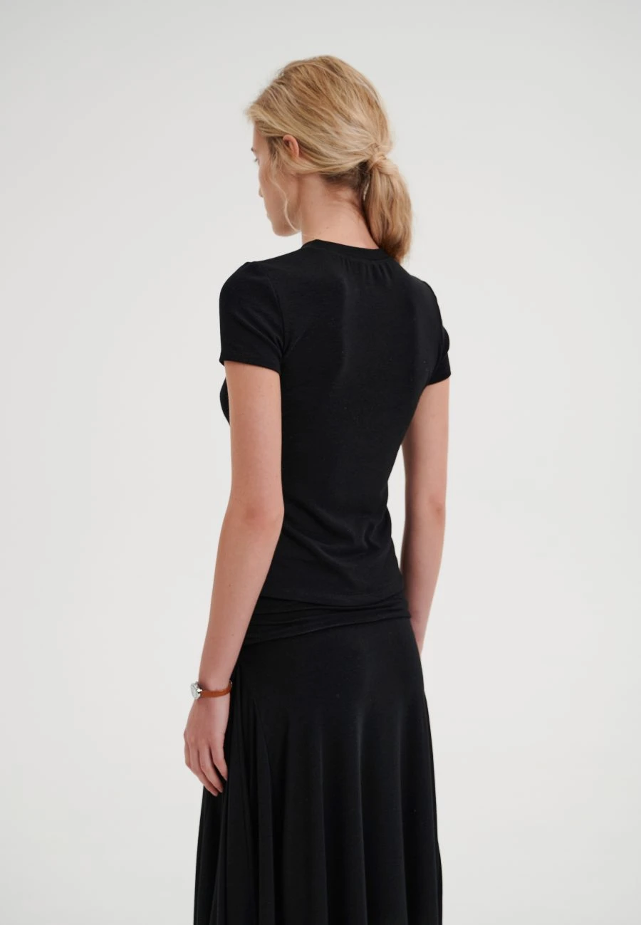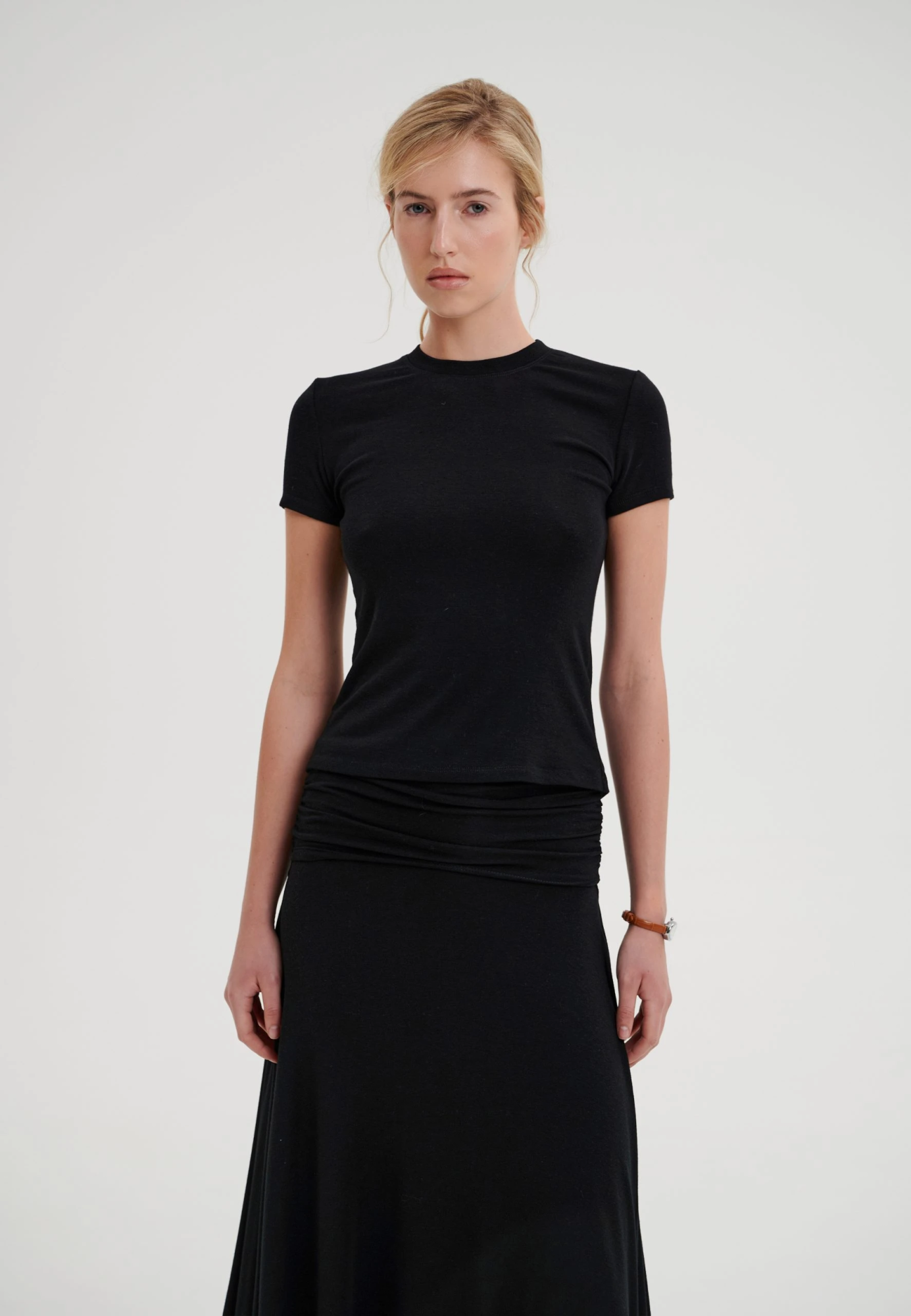 Футболка прилегающего силуэта в универсальном черном оттенке – базовая модель с акцентом на качество и посадку. Футболка выполнена из премиального тенселя с добавлением шерсти. Материал отличается мягкостью, пластичностью и комфортом в носке. Футболка идеально сочетается с одноноименной юбкой. Носите ее самостоятельно или используйте как основу для многослойных образов.