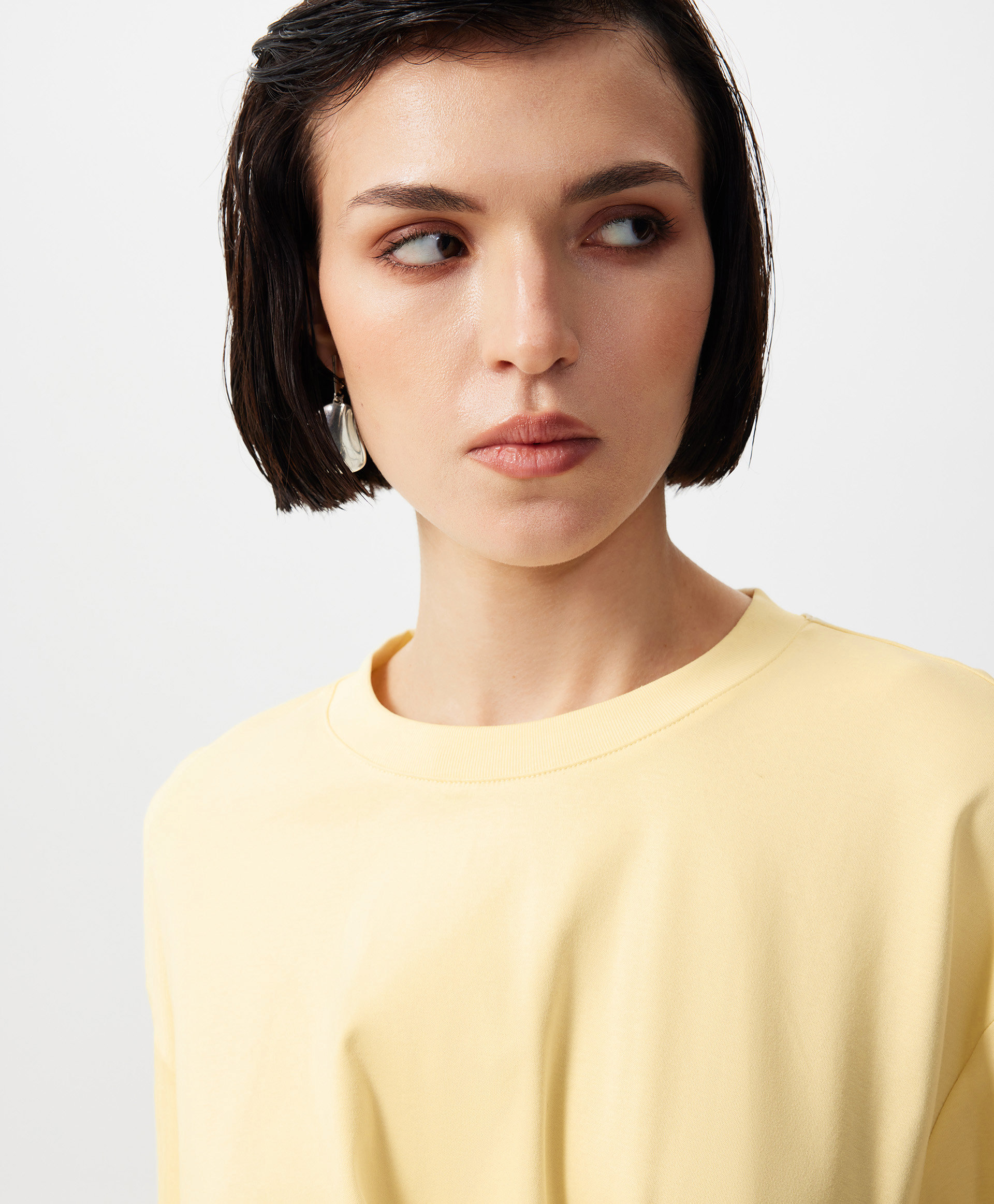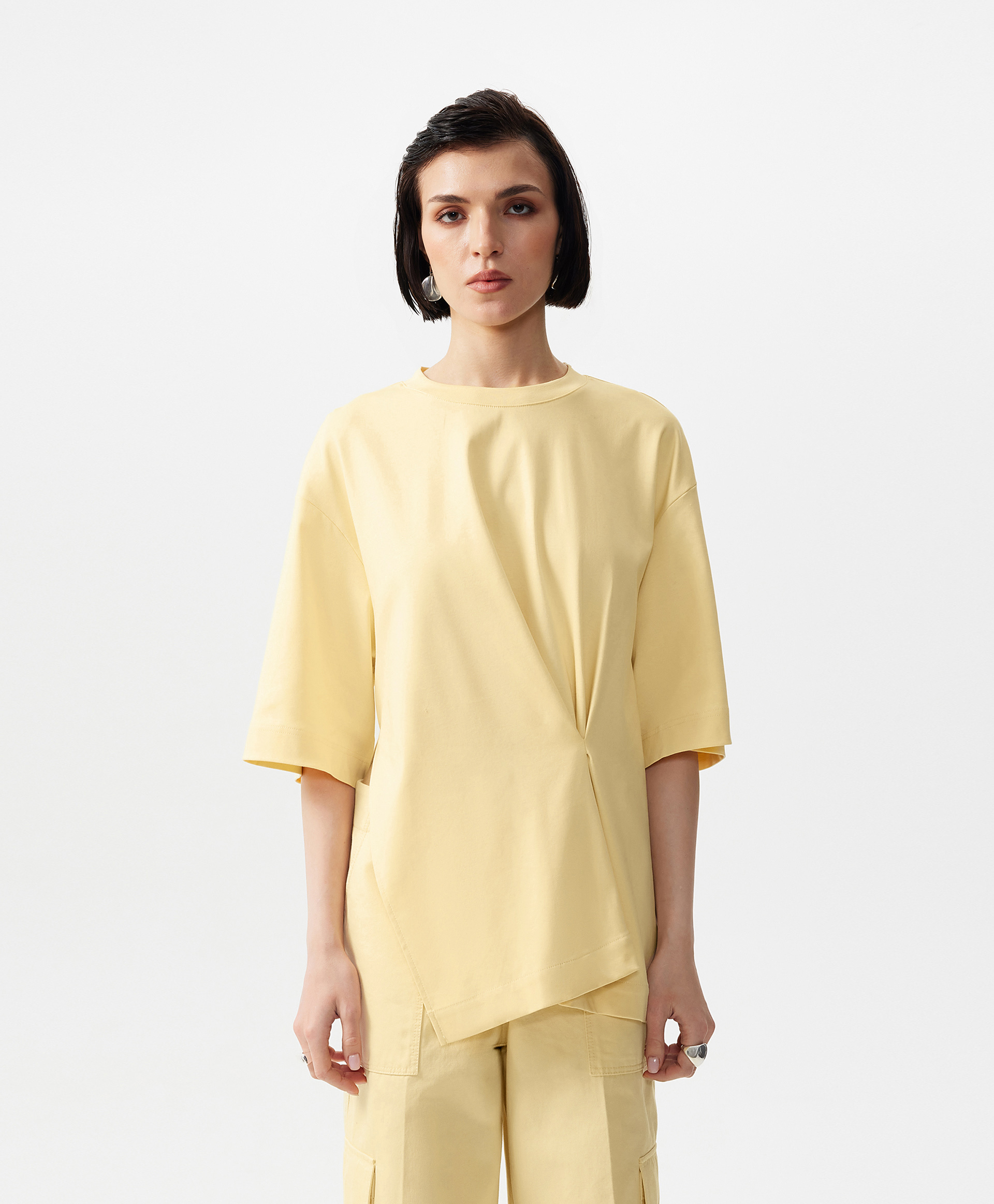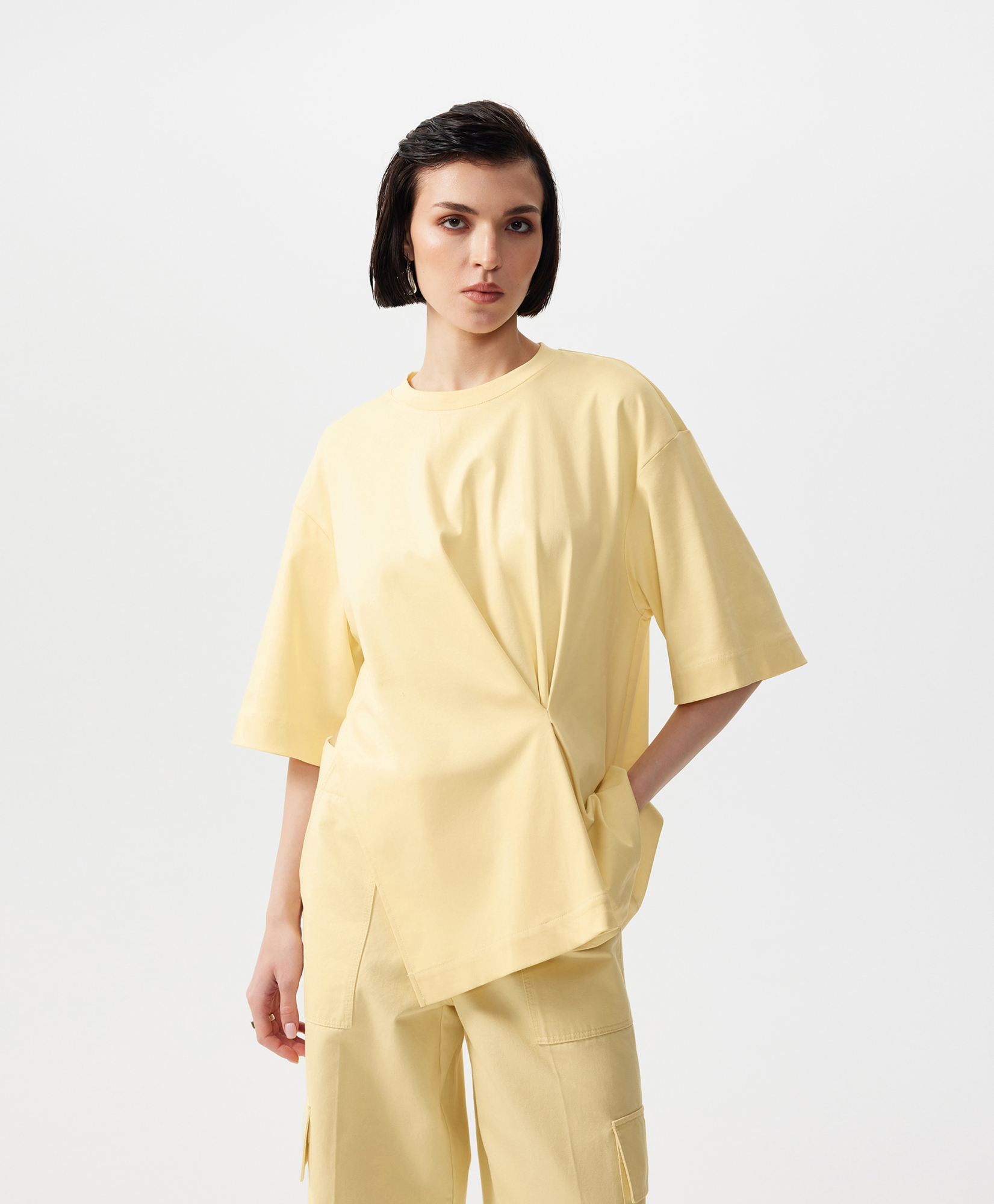 Футболка силуэта оверсайз - стильная лаконичная вещь, способная придать образу женщины остроту современных трендов! Крупный асимметричный защип в области талии формирует легкую вертикальную драпировку, созданную, как будто случайным, непроизвольным образом. Неровная линия низа, как следствие оригинальной деформации передней части, и высокий разрез со смещением поддерживает неформальный непринужденный вайб, делает образ расслабленным и комфортным. Желтый цвет ароматной мимозы со сладковатыми медовыми и цитрусовыми нотками на мягком, шелковистом, приятным к телу интерлоке транслирует солнечное настроение, настраивает на позитив, способствует пробуждению креативных способностей женщины.