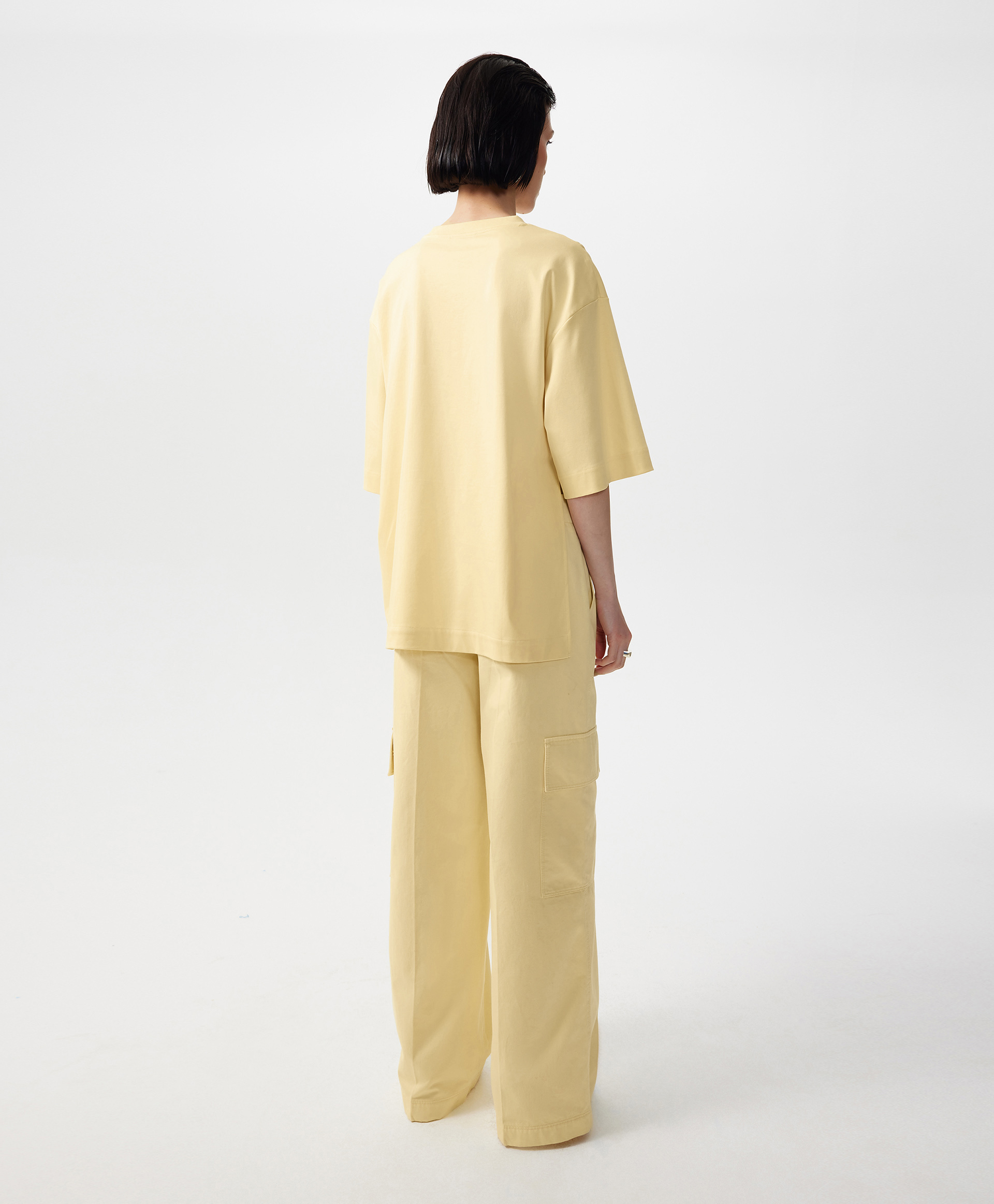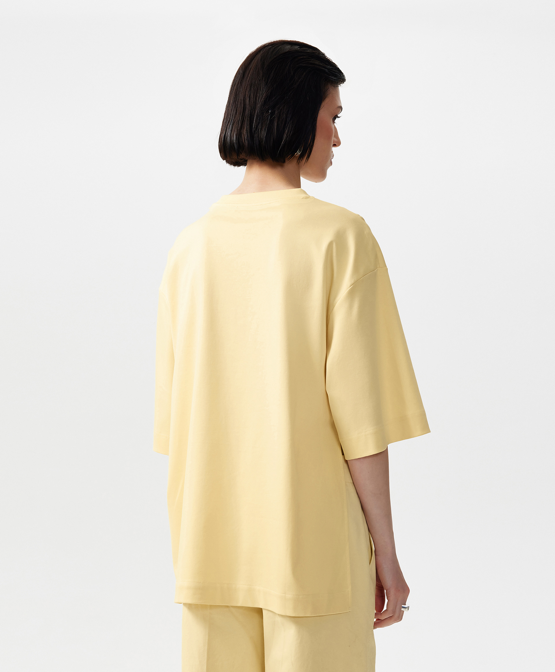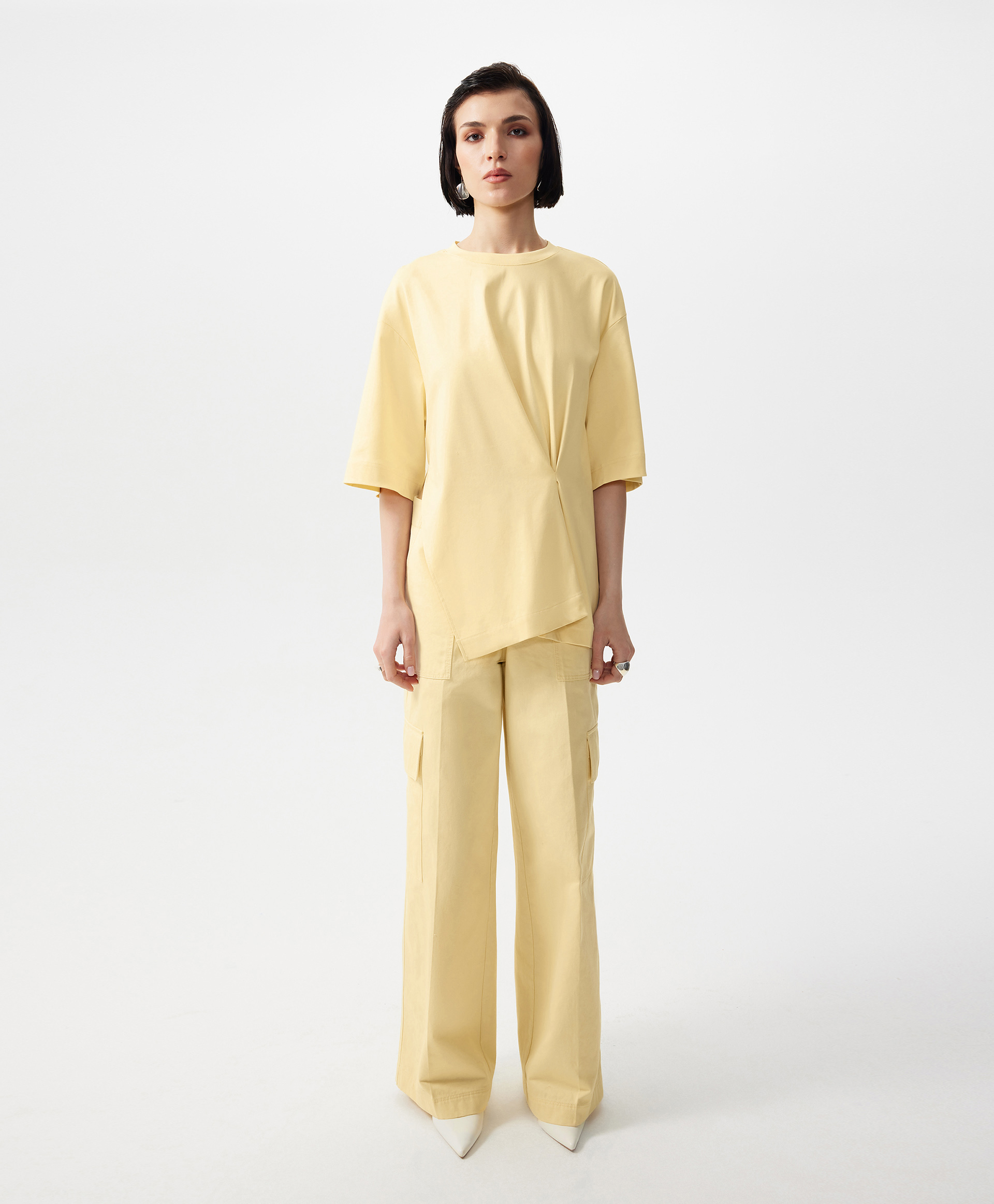 Футболка силуэта оверсайз - стильная лаконичная вещь, способная придать образу женщины остроту современных трендов! Крупный асимметричный защип в области талии формирует легкую вертикальную драпировку, созданную, как будто случайным, непроизвольным образом. Неровная линия низа, как следствие оригинальной деформации передней части, и высокий разрез со смещением поддерживает неформальный непринужденный вайб, делает образ расслабленным и комфортным. Желтый цвет ароматной мимозы со сладковатыми медовыми и цитрусовыми нотками на мягком, шелковистом, приятным к телу интерлоке транслирует солнечное настроение, настраивает на позитив, способствует пробуждению креативных способностей женщины.