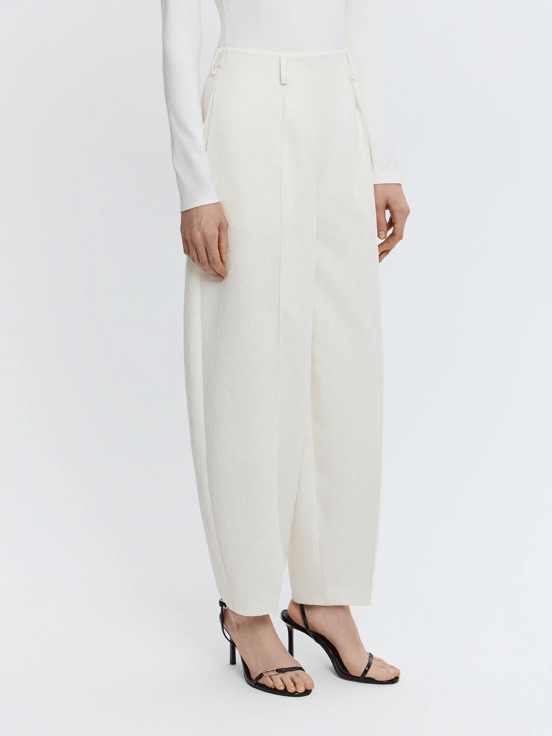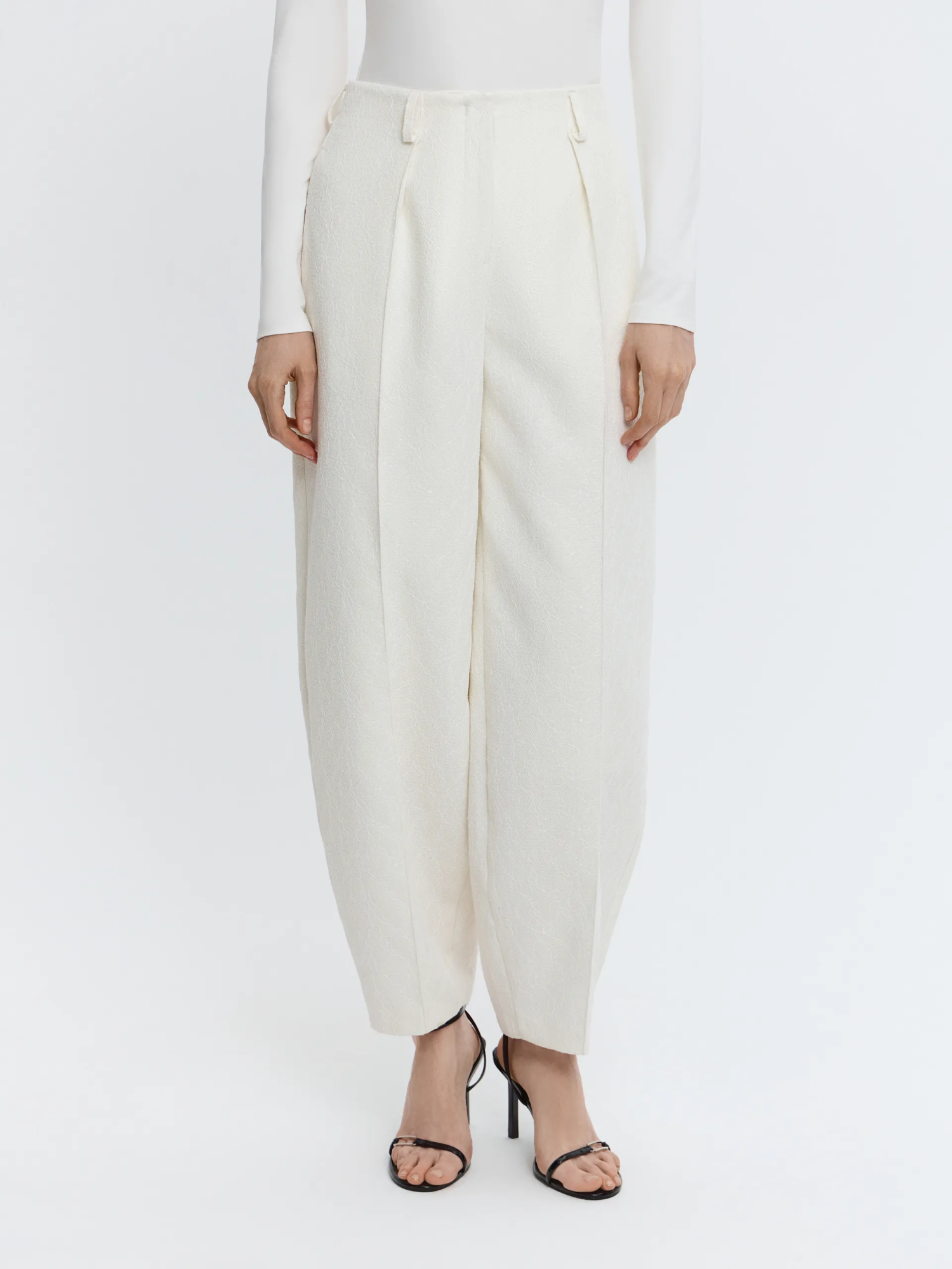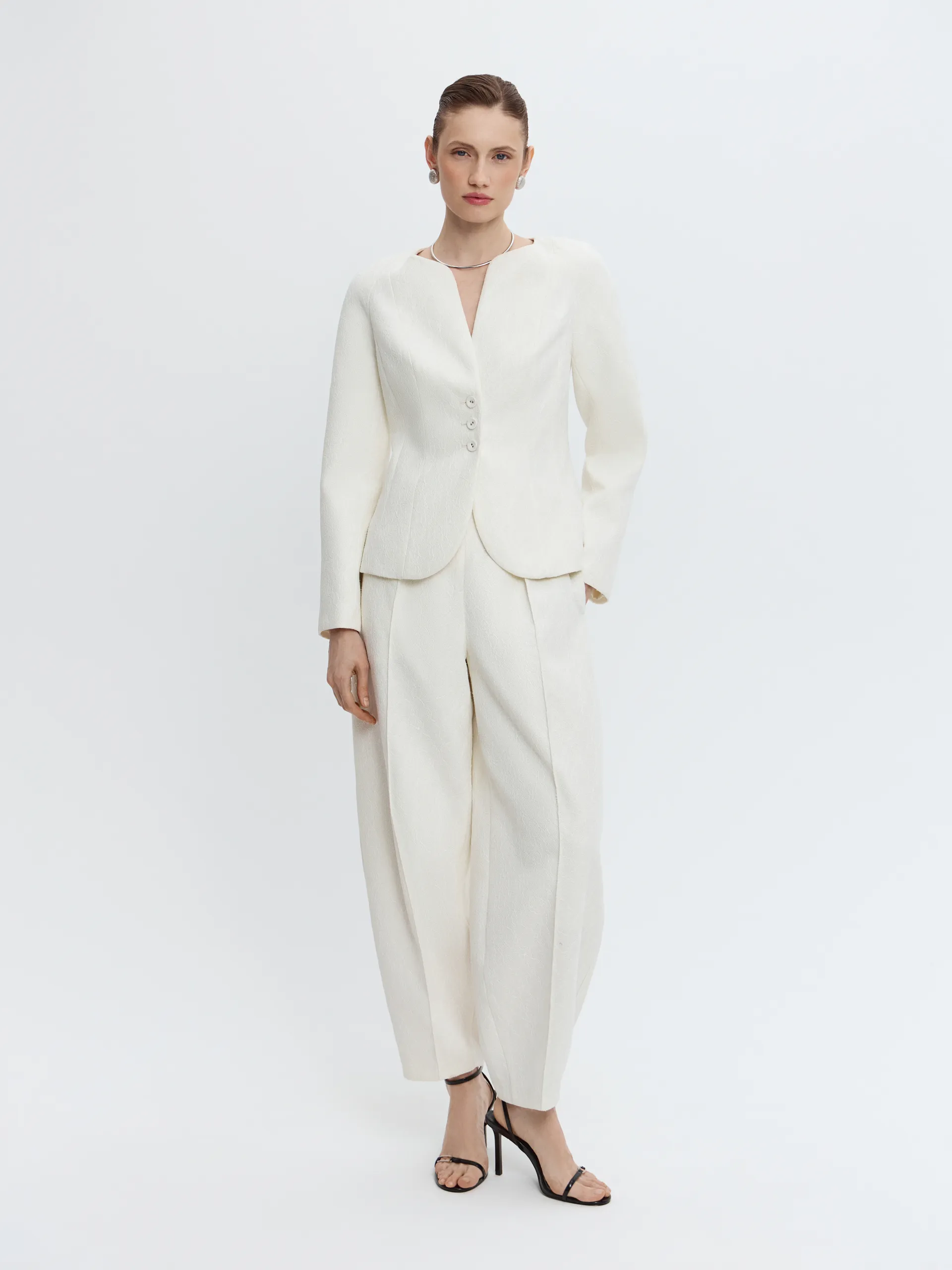 Выполнены из плотного кружева, которое хорошо держит форму, не просвечивает и выглядит выразительно благодаря рельефному рисунку. Ткань создаёт ощущение глубины и фактуры, добавляя изделию визуальной ценности. Трендовый О-силуэт и декоративные отстрочки визуально вытягивают ноги и формируют стройный силуэт. Брюки комфортны в носке и легко сочетаются с приталенным жакетом из комплекта, а также с базовыми топами, рубашками и трикотажем нейтральных оттенков.