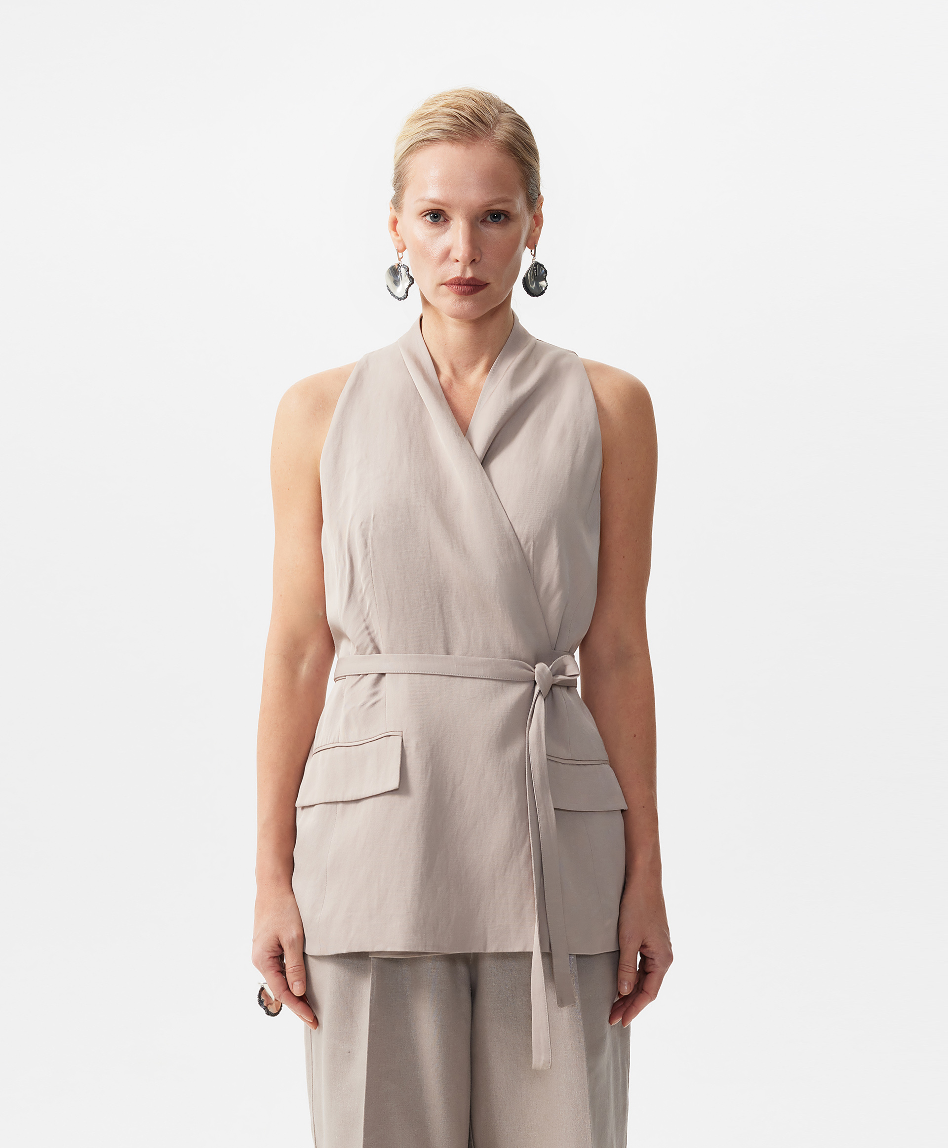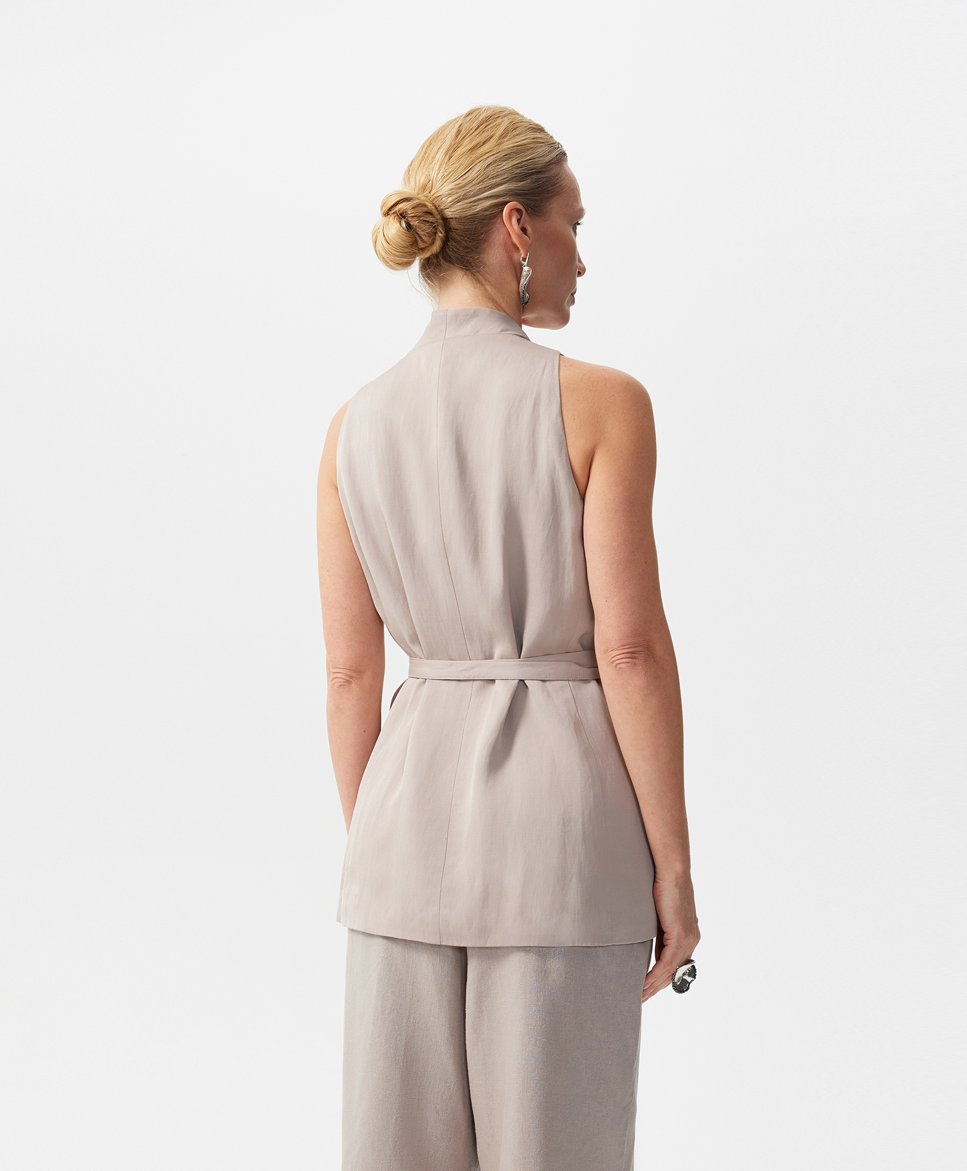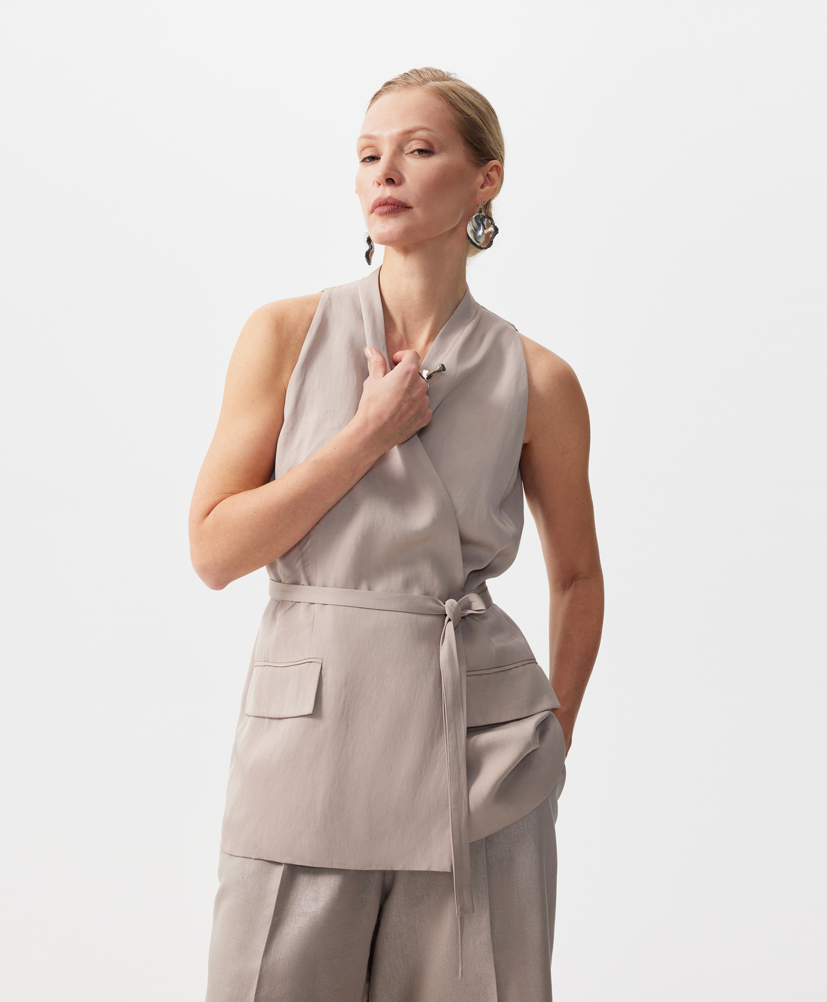 Текстильный жилет с запахом, - это шик минималистичных решений, в которых всегда есть интригующая недосказанность… Жилет прямой свободной формы выполнен из шелковистой вискозной ткани с высоким содержанием льна, образующего еле заметную узелковую структуру. Сложный дымчатый оттенок пыльной розы, ассоциирующийся с мягкостью, уютом, покоем, поддерживает модный тренд на экологичные цвета и натуральные материалы. Форма модели с американской проймой, оставляющей плечи открытыми, придает жилету утонченную элегантность. Американская пройма, популярность которой началась с триумфа Мерилин Монро и ее знаменитого развевающегося белого платья, считается одним из самых красивых элементов в женской одежде. Она выгодно подчеркивает зону плеч и рук, делает образ притягательным. Жилет имеет шелковистую вискозную подкладку, завязывается с помощью длинных лент из основного материала на спинке или сбоку. Прорезные карманы с клапанами придают жилету завершенный вид, а также создают удобство в эксплуатации вещи.